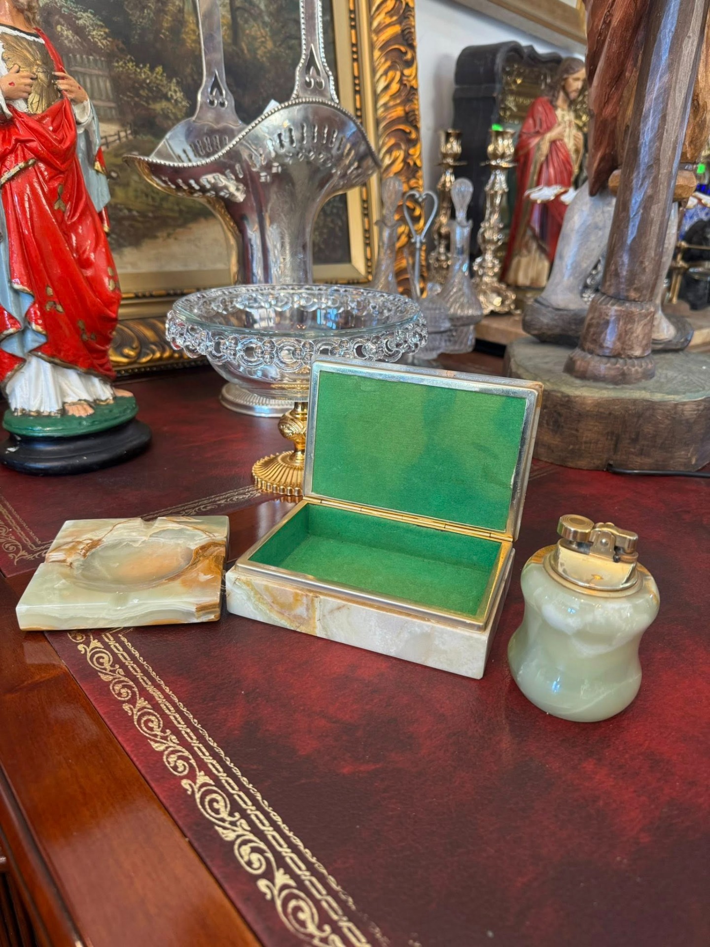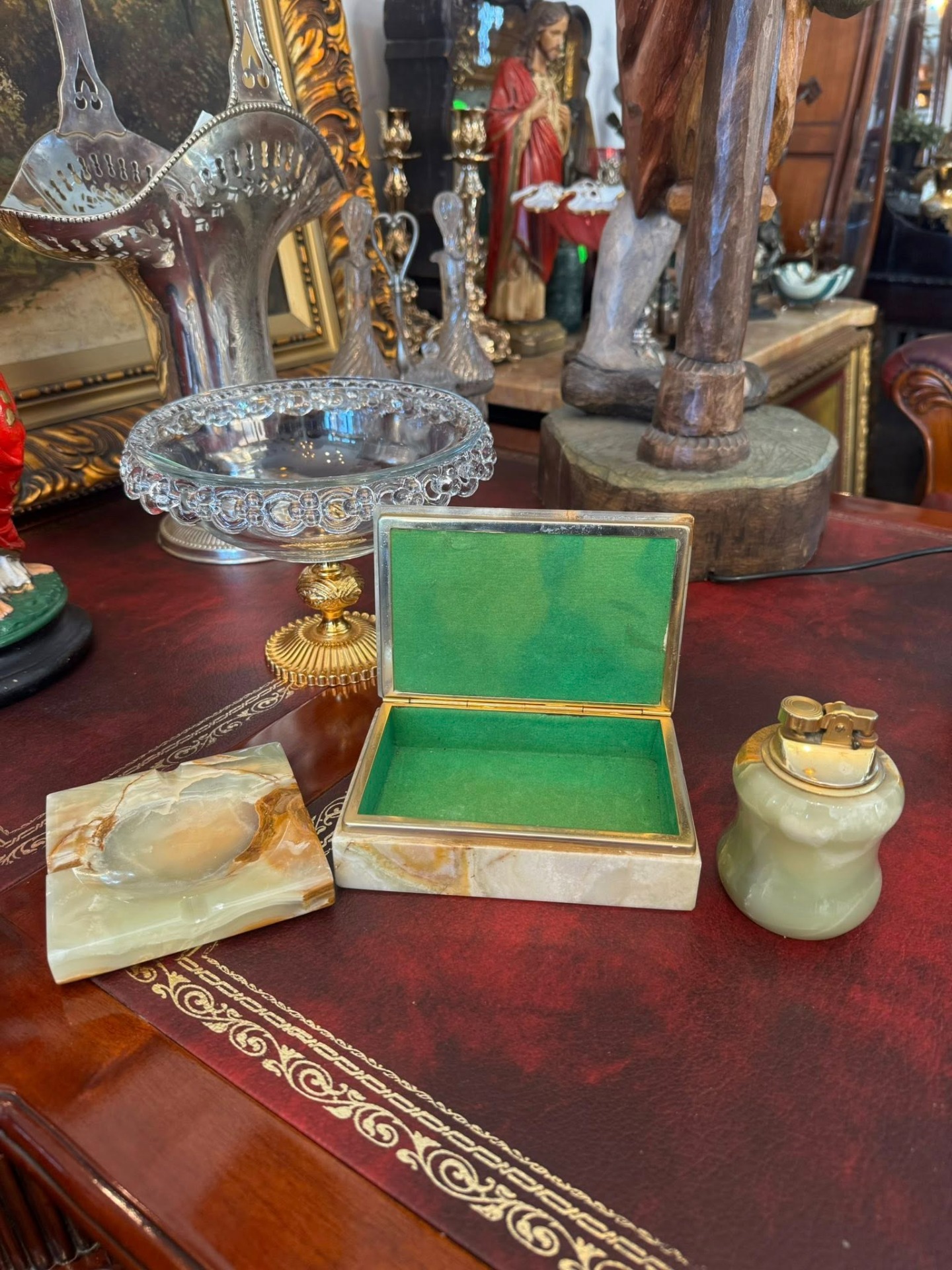 2. Caseta (Cutia): O cutie dreptunghiulară cu capac, realizată tot din onix. Interiorul este căptușit cu catifea sau mătase de culoare verde vibrant (vizibilă în prima poză), fiind destinată păstrării diverselor accesorii de birou sau obiectelor personale.