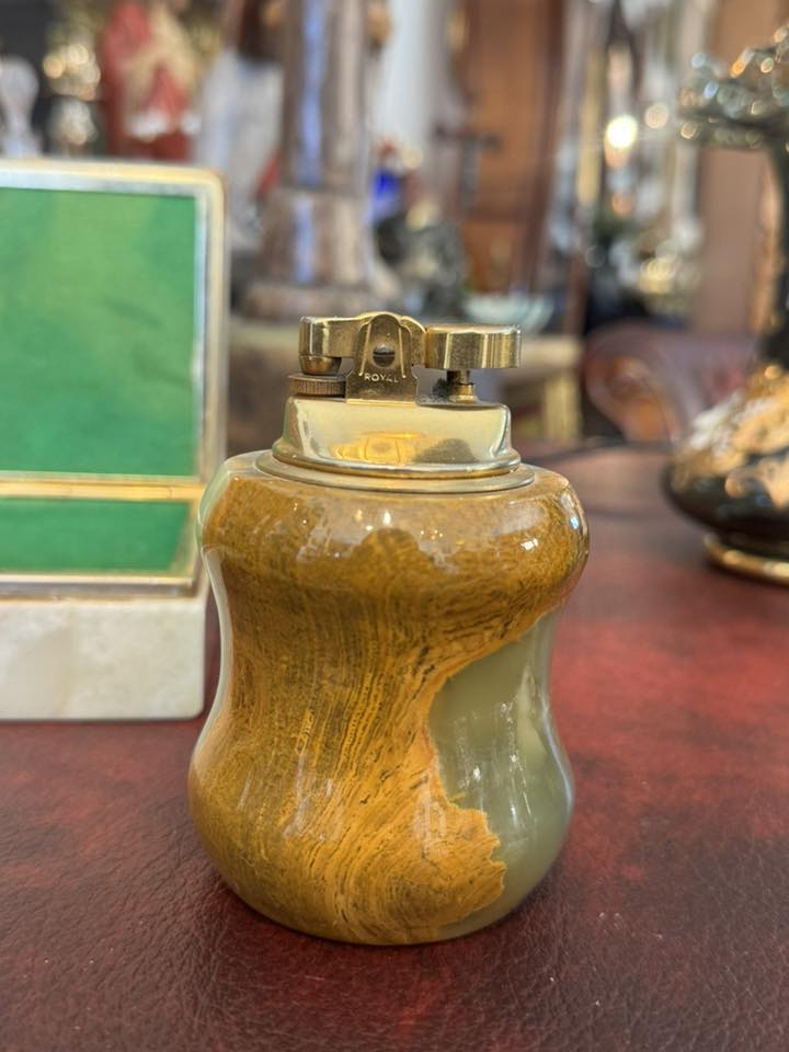 1. Bricheta de masă: Este piesa centrală a setului, având un mecanism metalic auriu marcat "ROYAL". Corpul brichetei este sculptat dintr-un bloc masiv de onix, cu o formă ergonomică, ușor curbată.