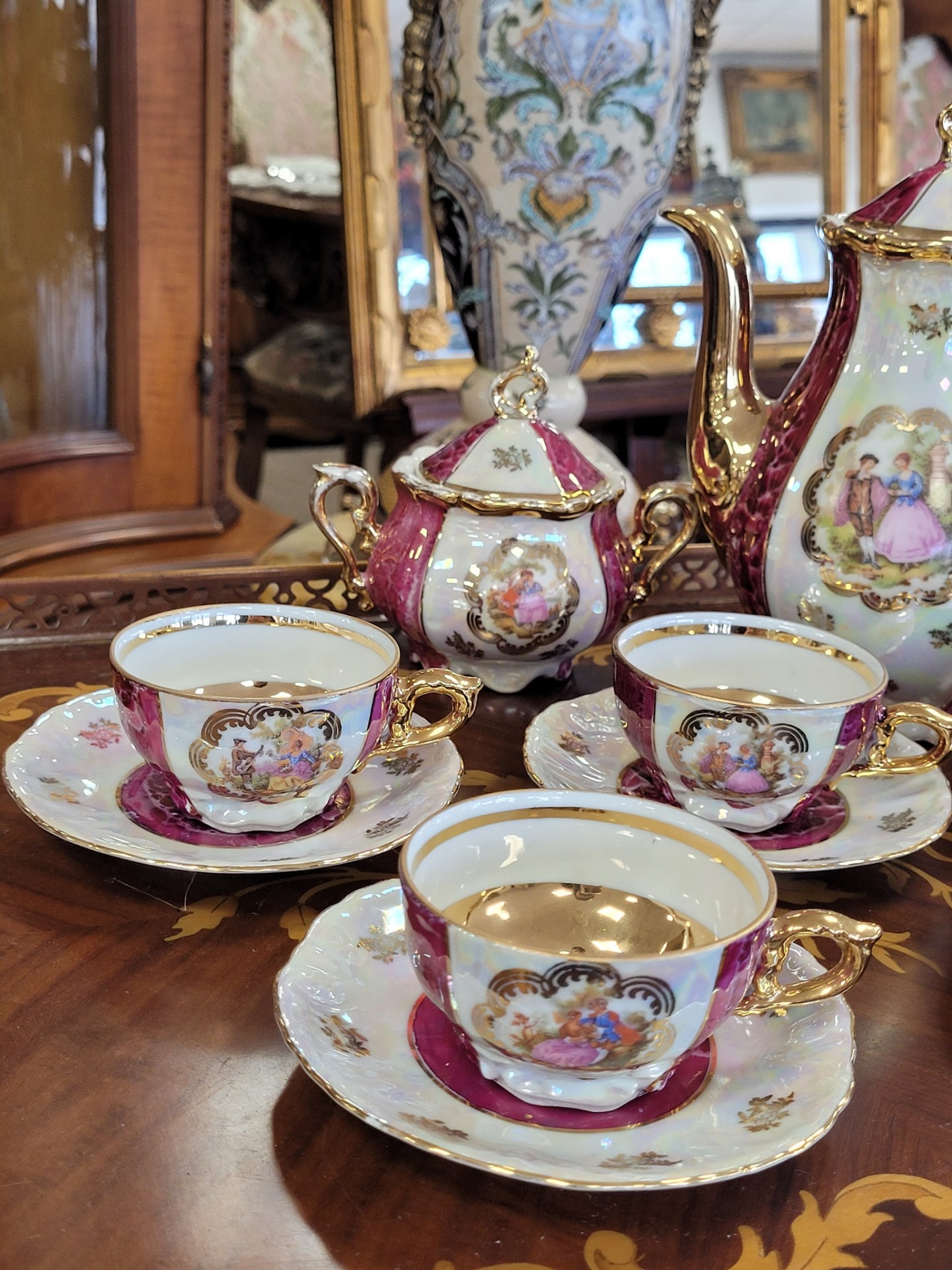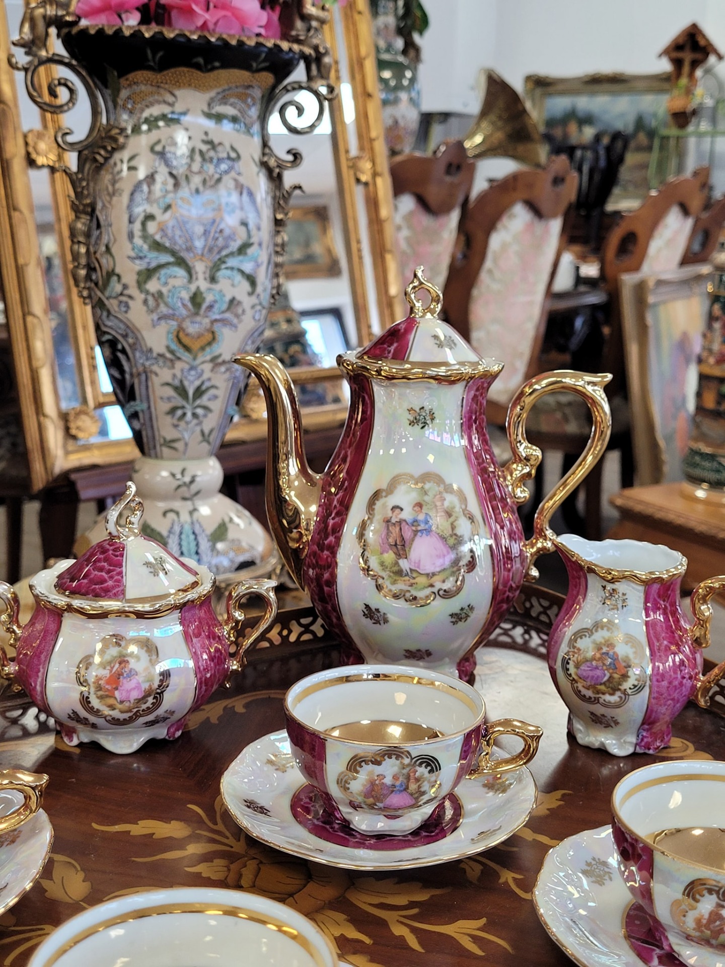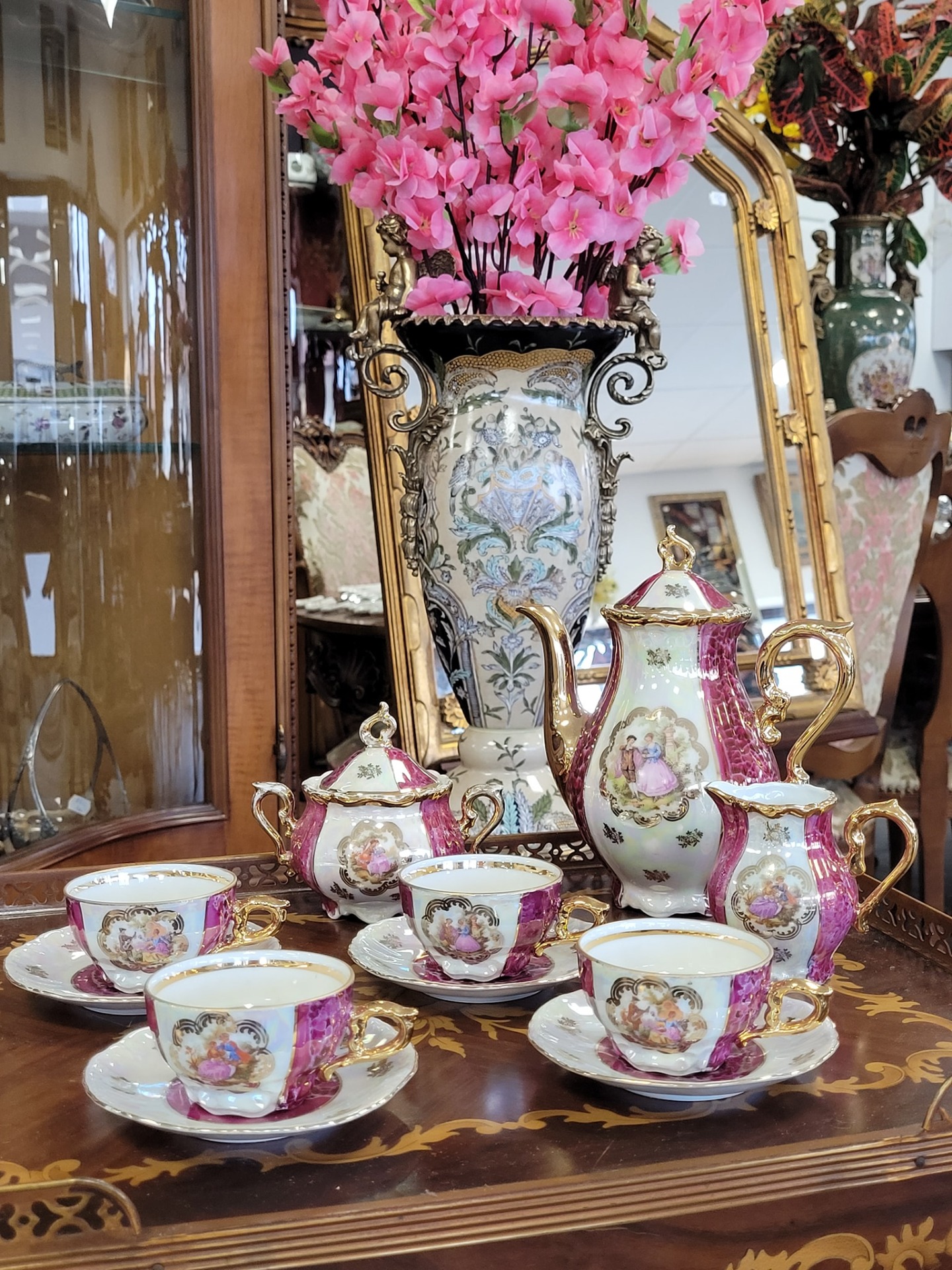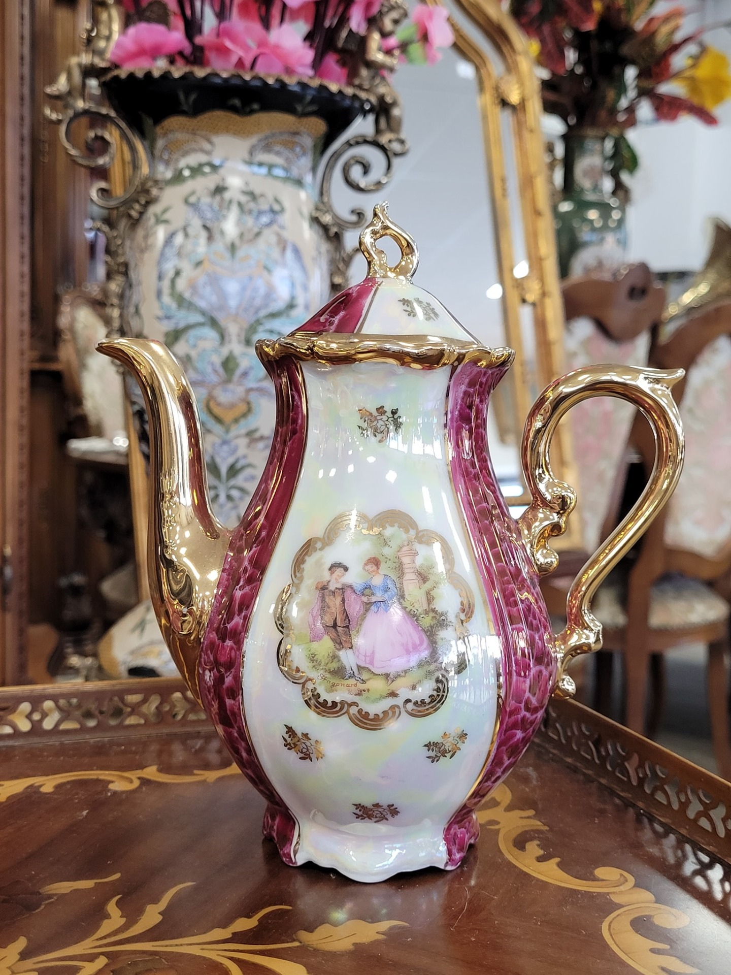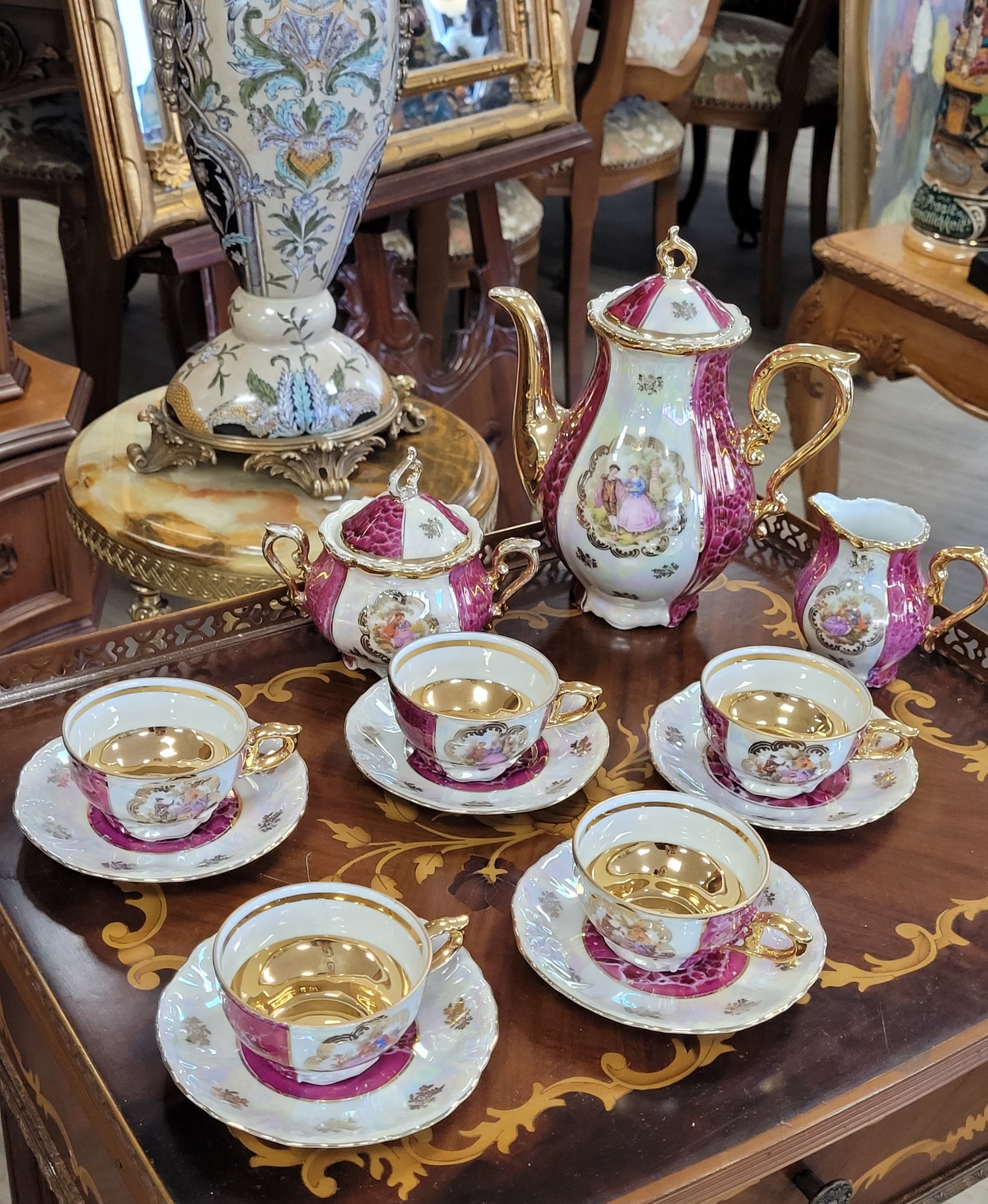 Set de cafea din porțelan Bavaria, compus din 11 piese, de colecție, model Fragonard, finisaj aurit, remarcabil prin finețea detaliilor și eleganța stilului baroc/rococo.