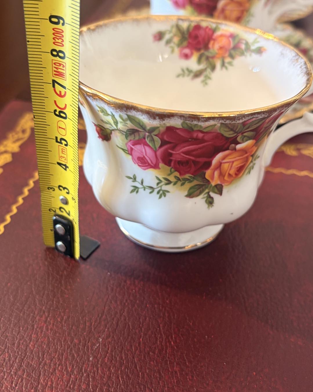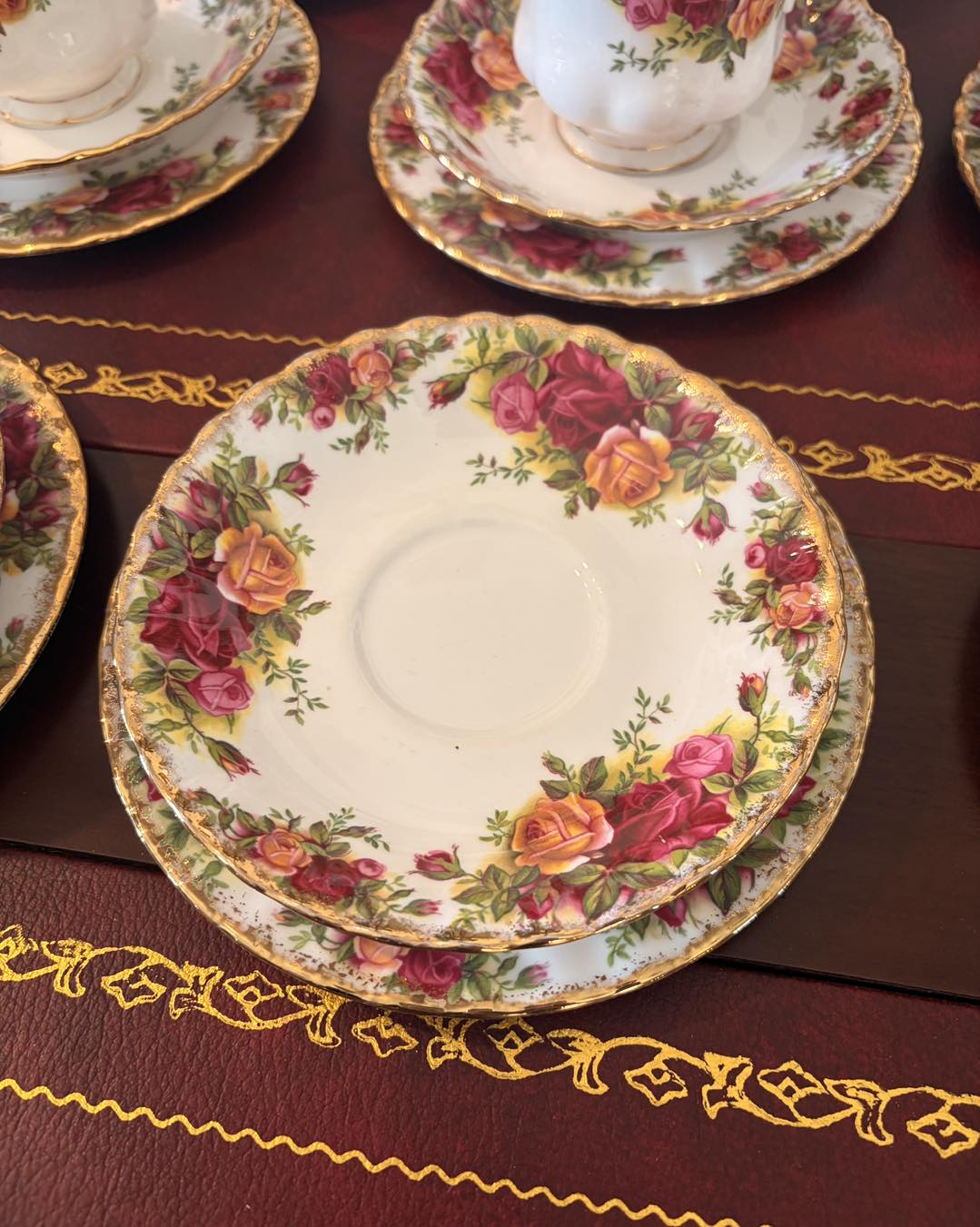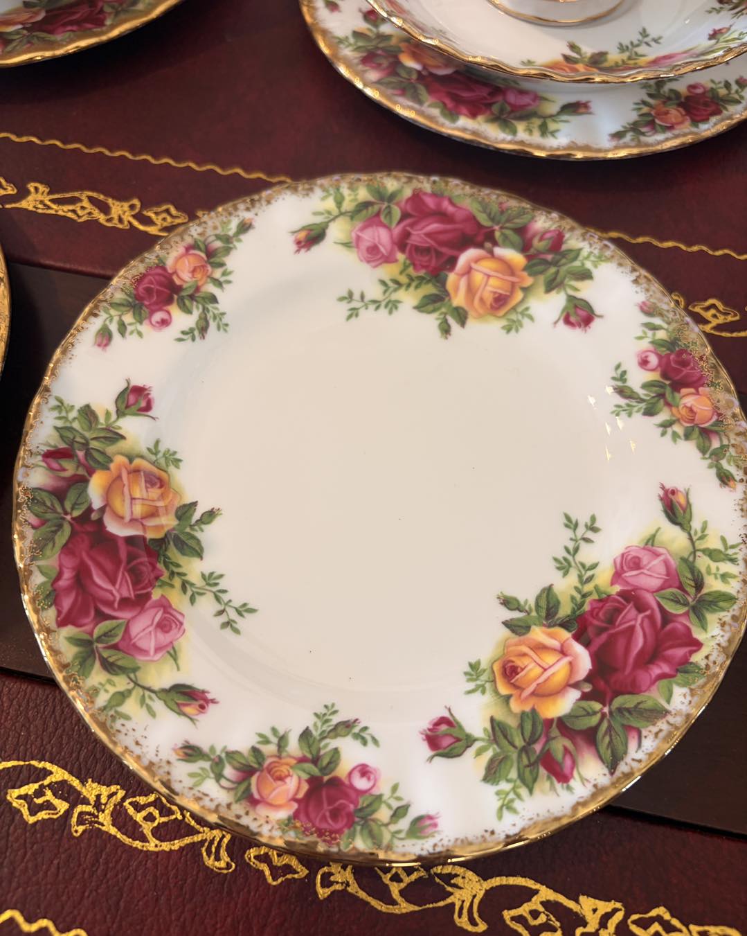Marginea este decorată cu aur de 22 de carate, aplicat de obicei prin tamponare pentru a-i da acel aspect ușor "stropit" sau neregulat, specific stilului victorian.