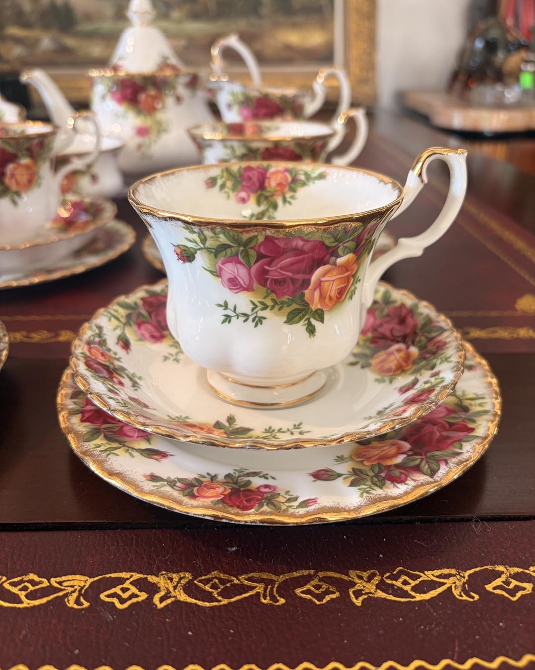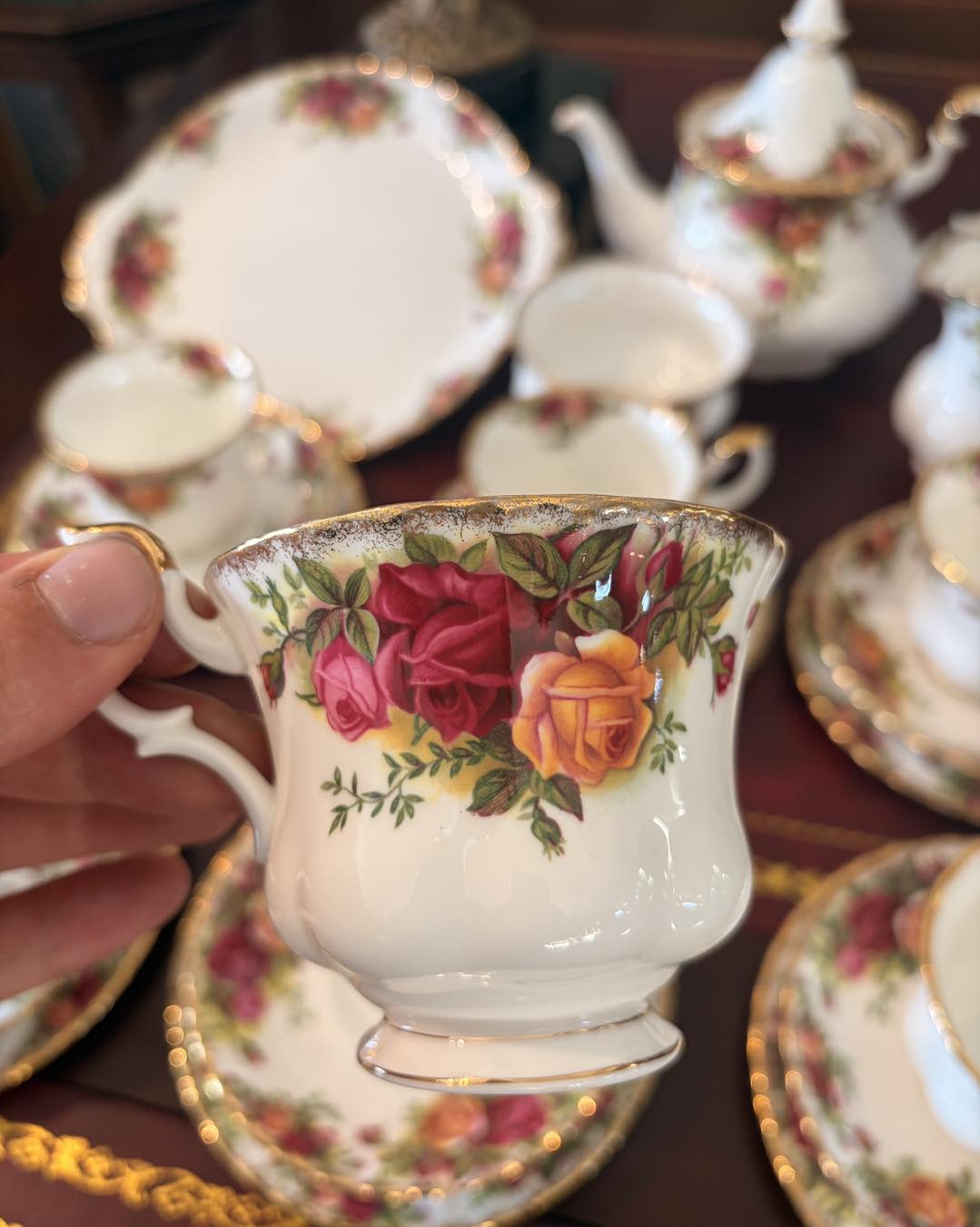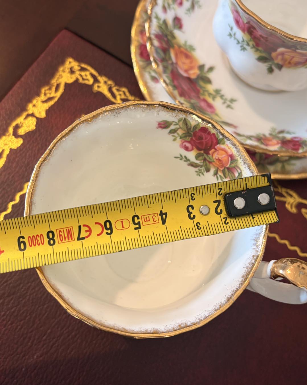 Marginea este decorată cu aur de 22 de carate, aplicat de obicei prin tamponare pentru a-i da acel aspect ușor "stropit" sau neregulat, specific stilului victorian.