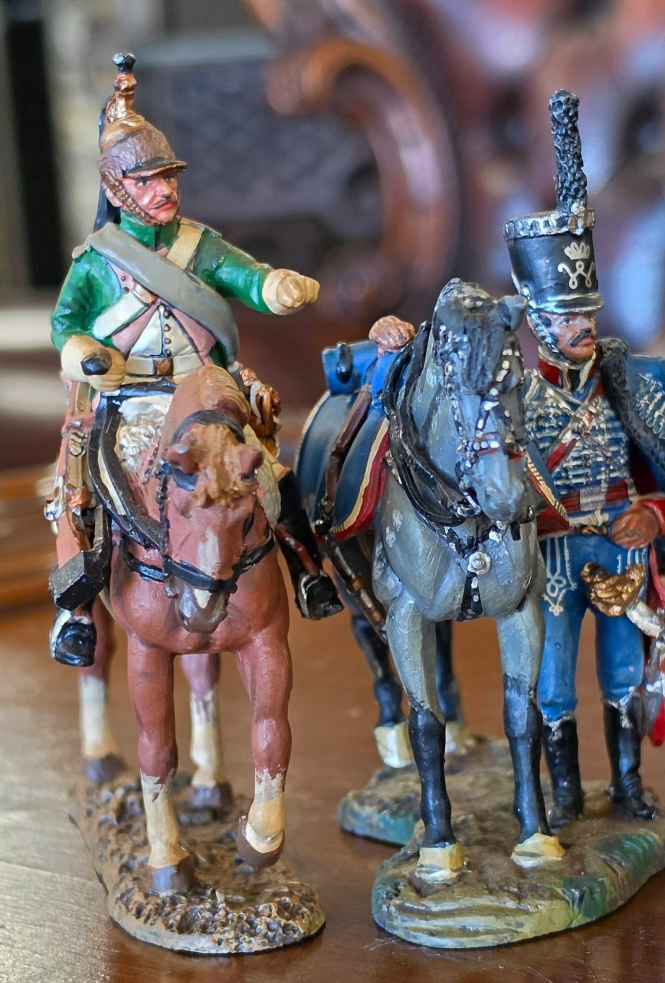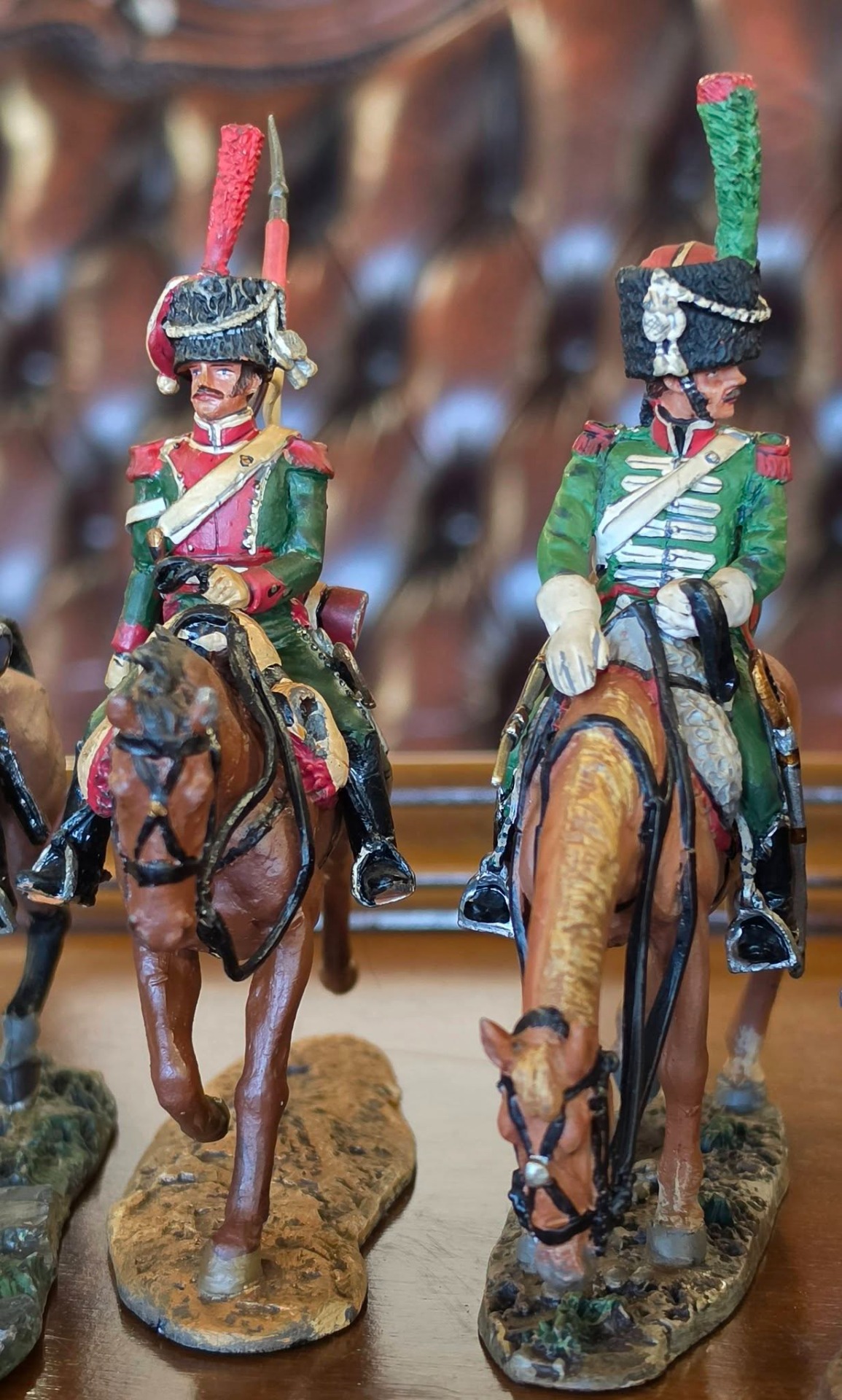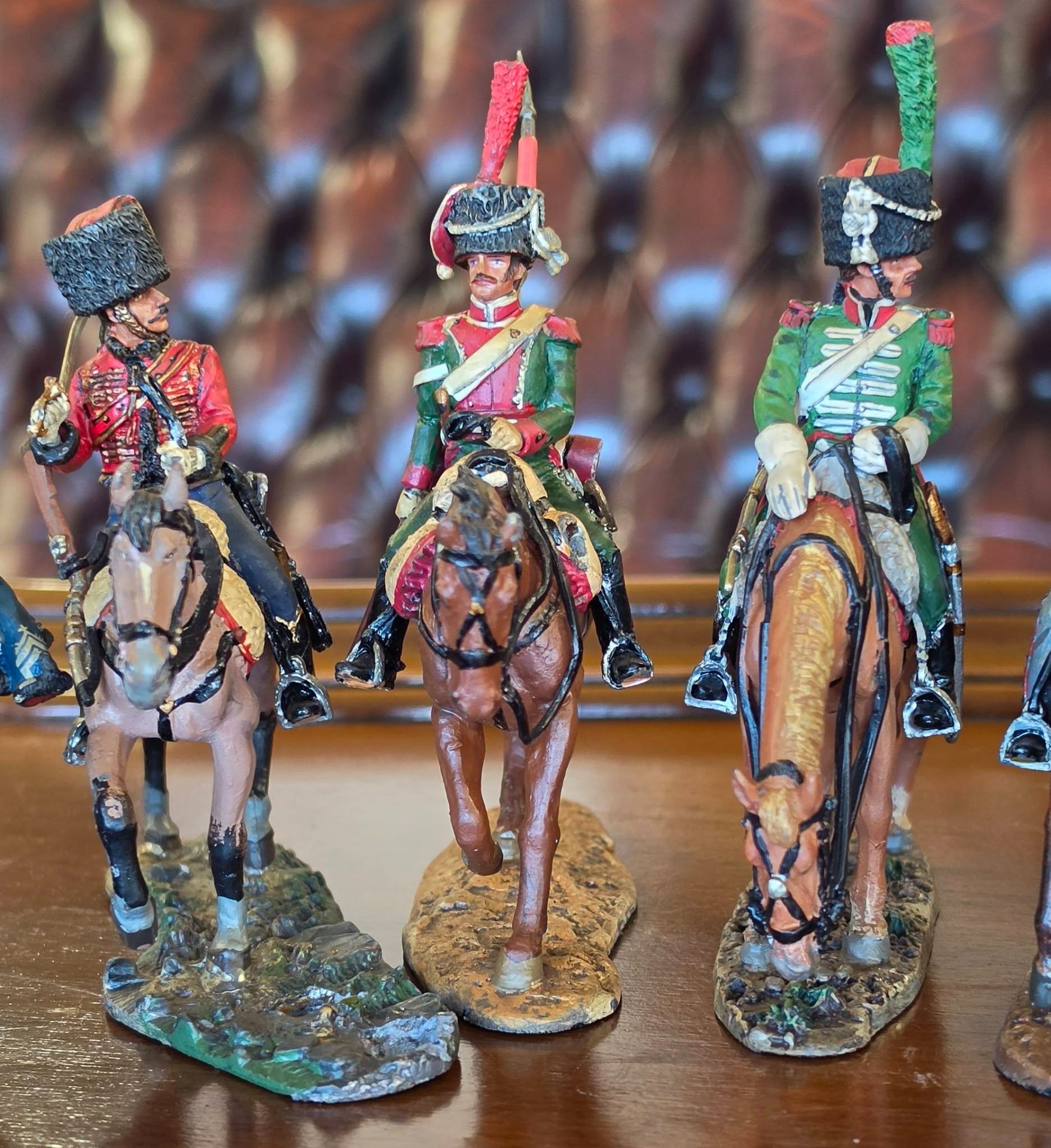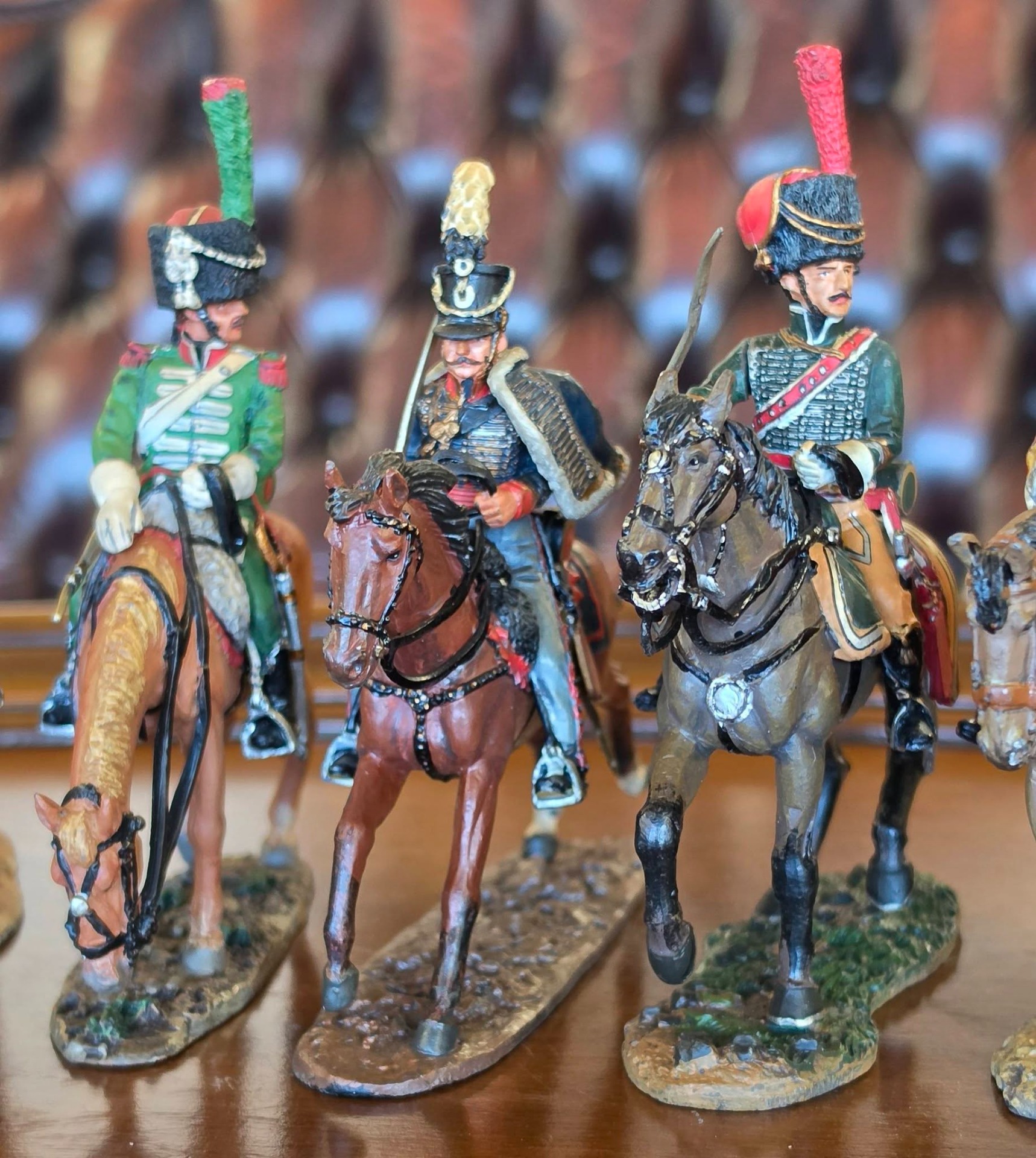 Set de colecție DelPrado, serie dedicată "Cavaleriei Războaielor Napoleoniene", compus din 10 figurine din aliaj de plumb și zinc, pictate manual, foarte apreciate de pasionații de istorie militară și de modelism datorită detaliilor istorice destul de fidele, realizate la scară 1:32.