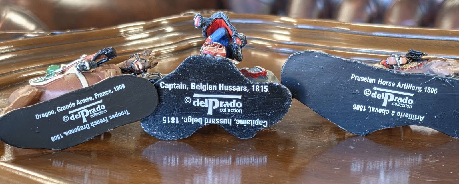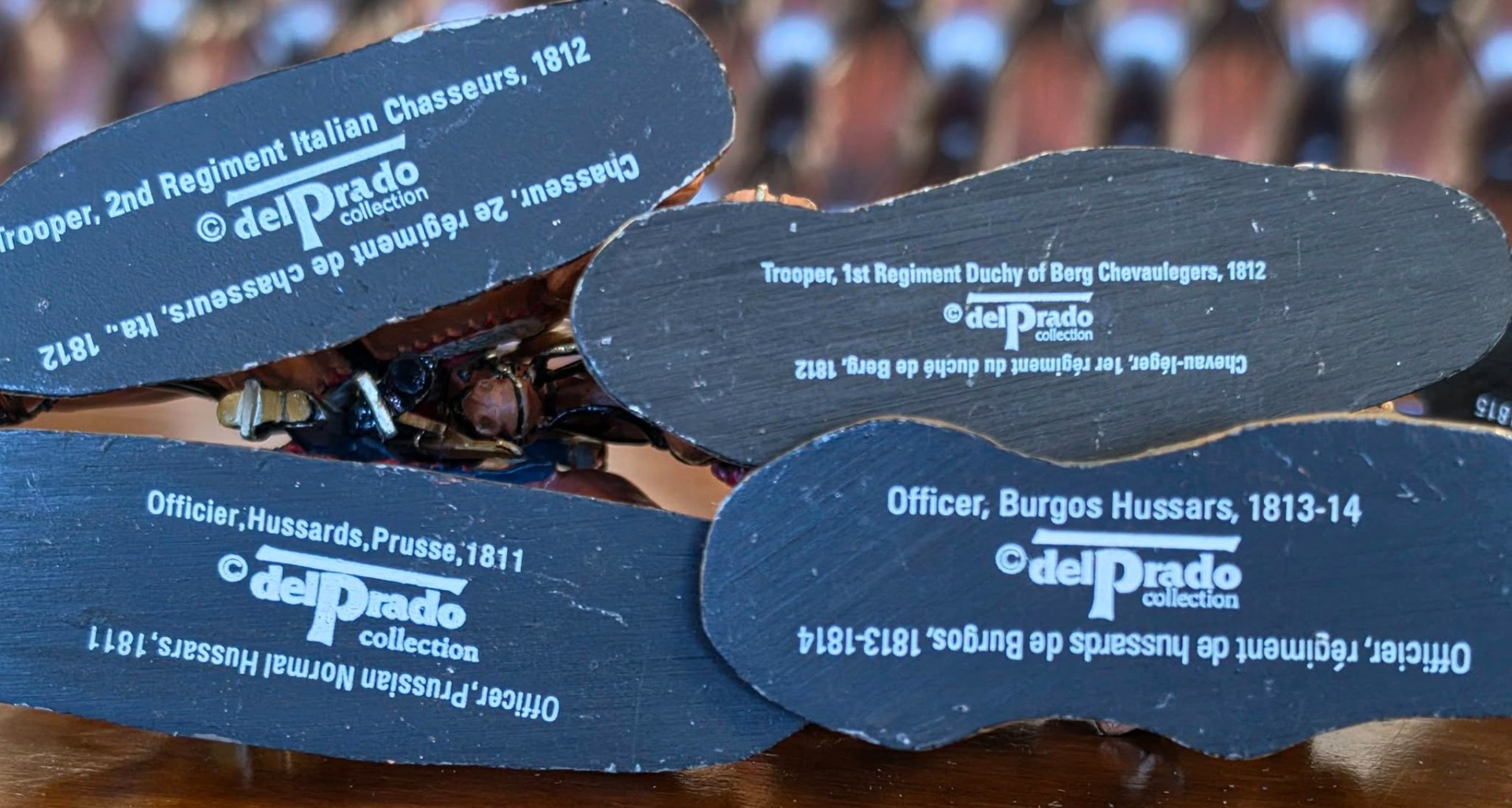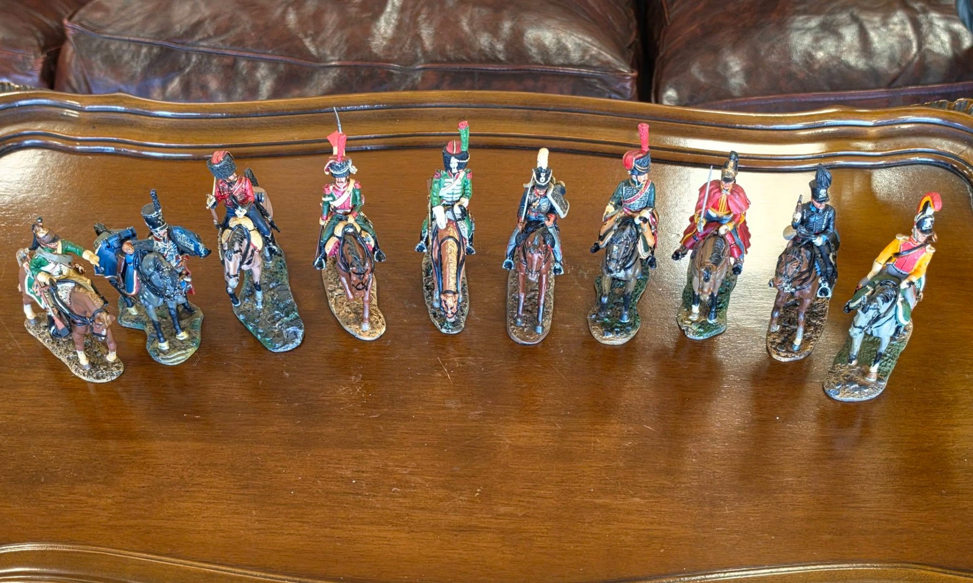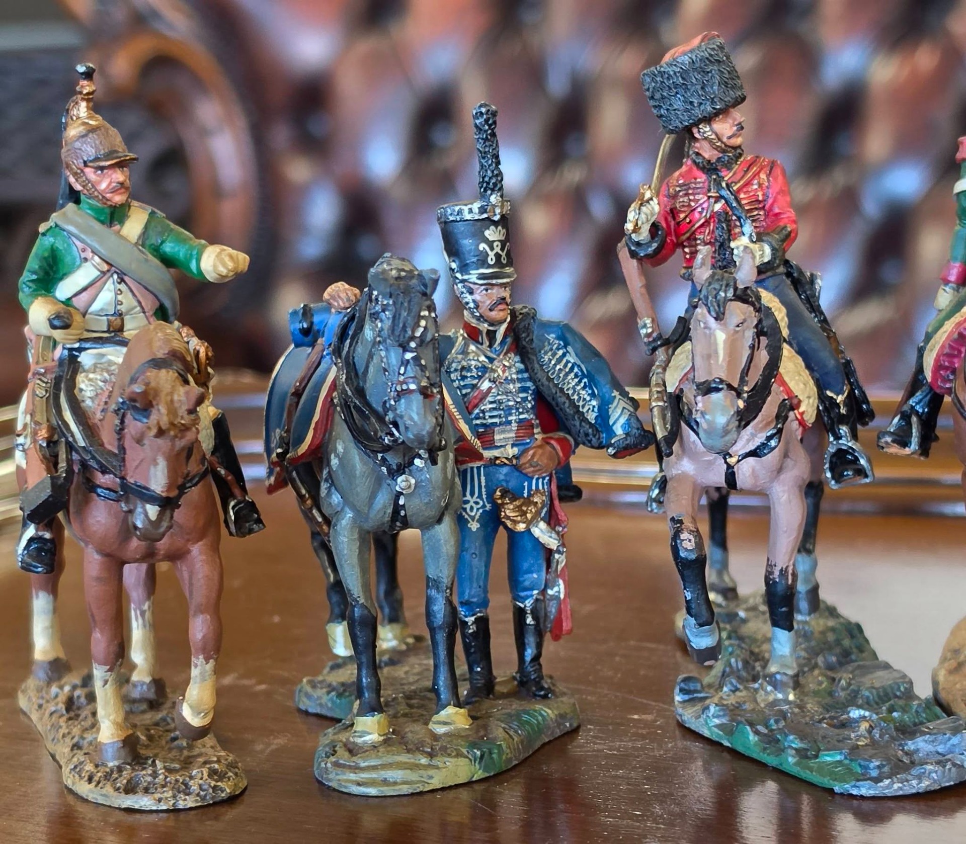 Set de colecție DelPrado, serie dedicată "Cavaleriei Războaielor Napoleoniene", compus din 10 figurine din aliaj de plumb și zinc, pictate manual, foarte apreciate de pasionații de istorie militară și de modelism datorită detaliilor istorice destul de fidele, realizate la scară 1:32.