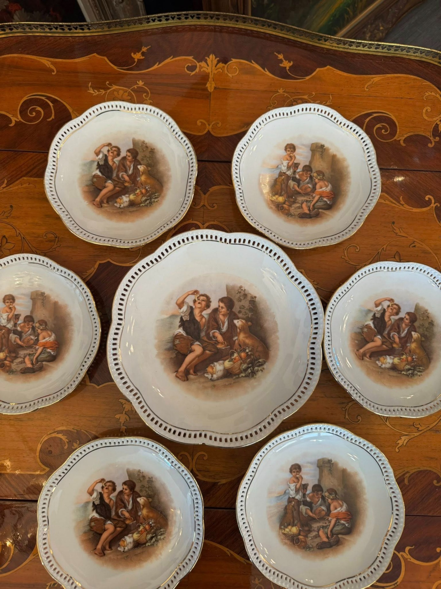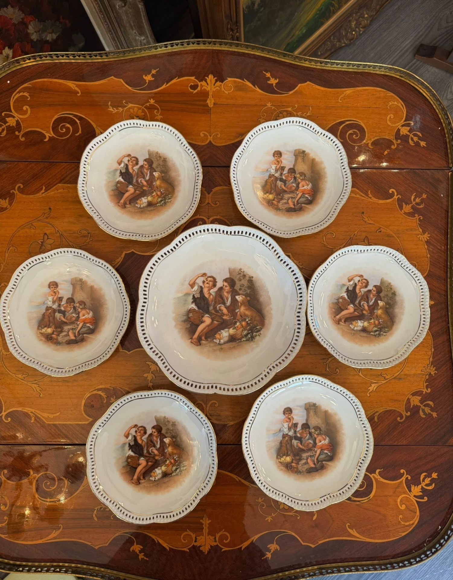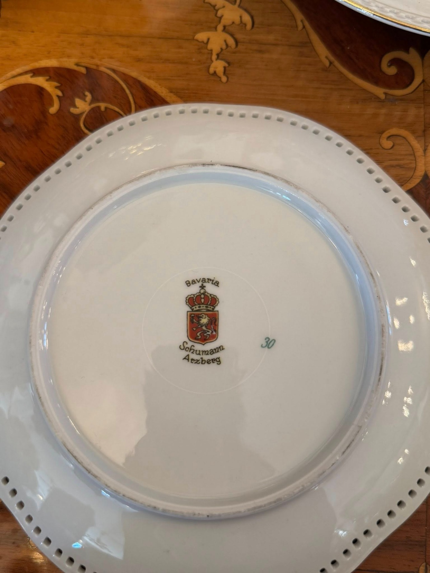 Set de colecție din porțelan de Bavaria compus dintr-un platou central și șase farfurii asortate, realizat de renumita manufactură germană Schumann Arzberg.(cca 1960)