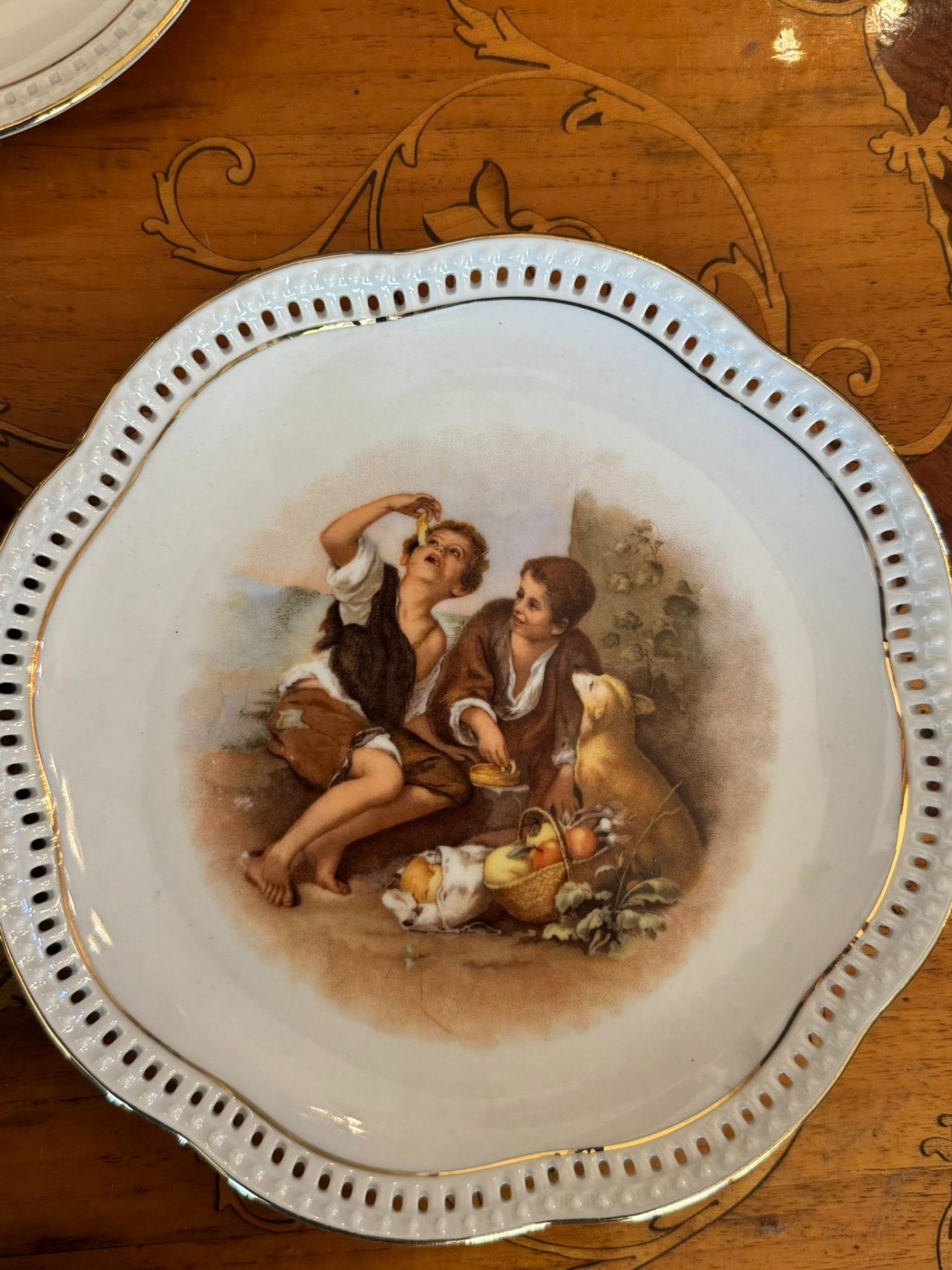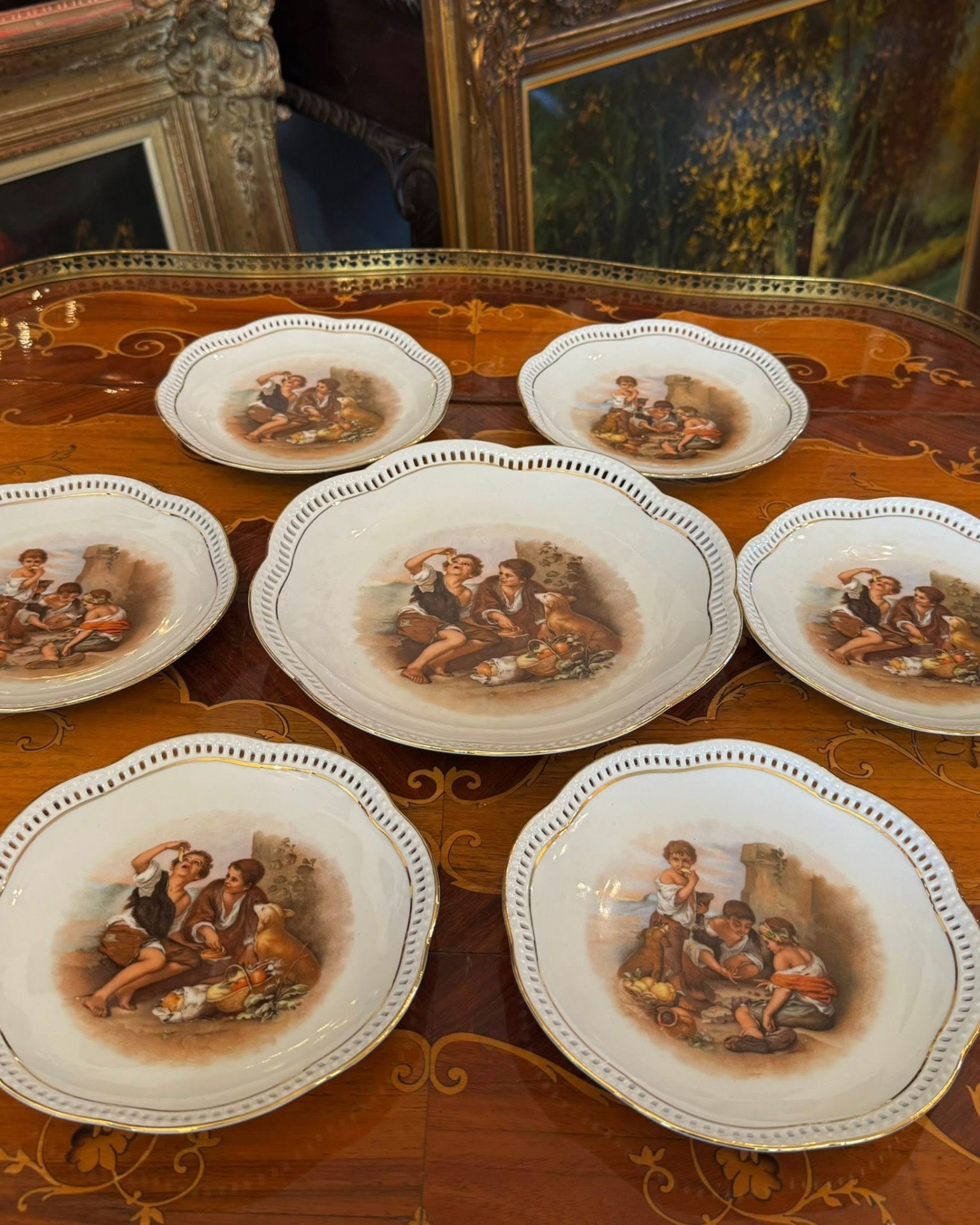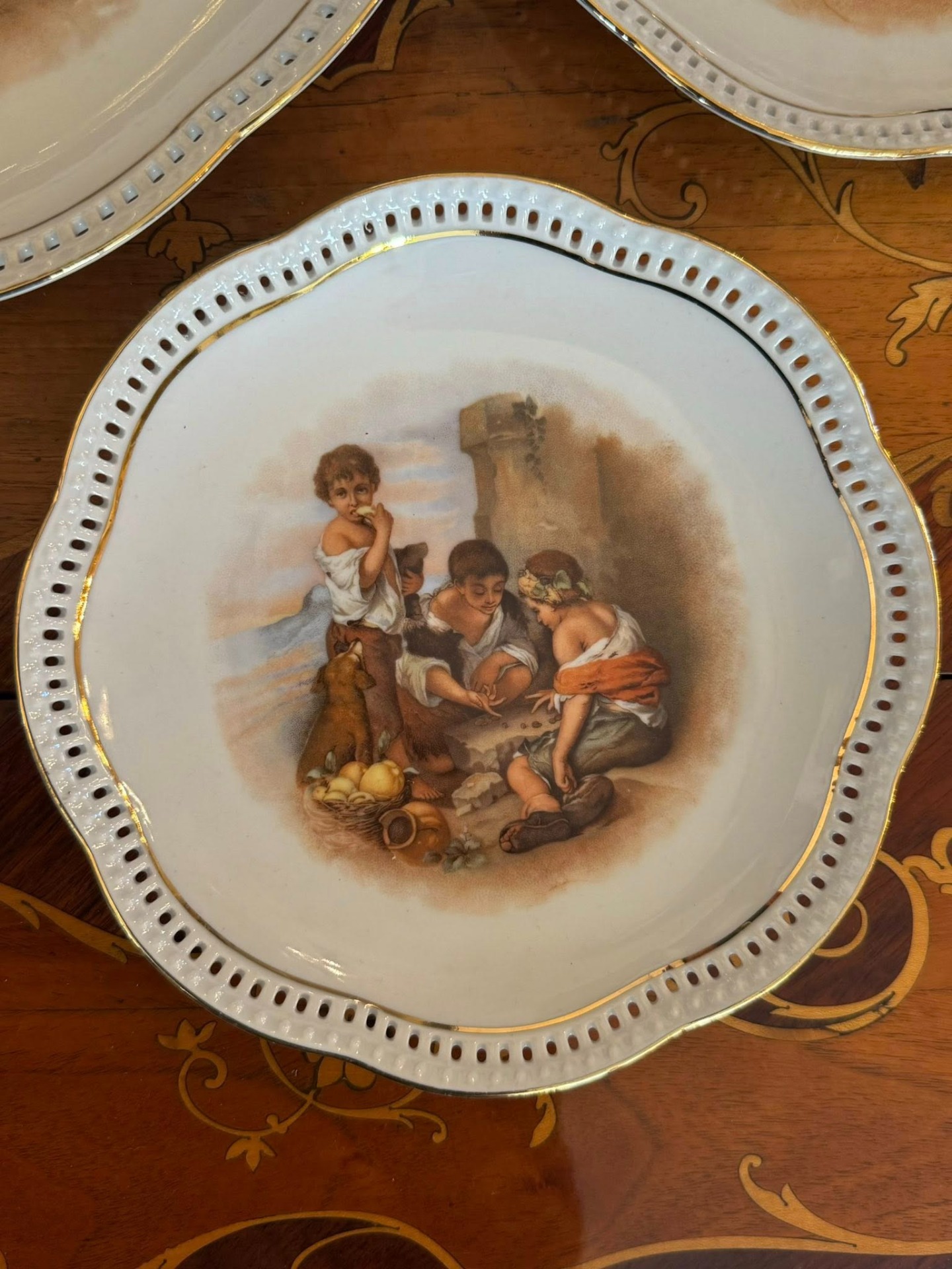 Set de colecție din porțelan de Bavaria compus dintr-un platou central și șase farfurii asortate, realizat de renumita manufactură germană Schumann Arzberg.(cca 1960)