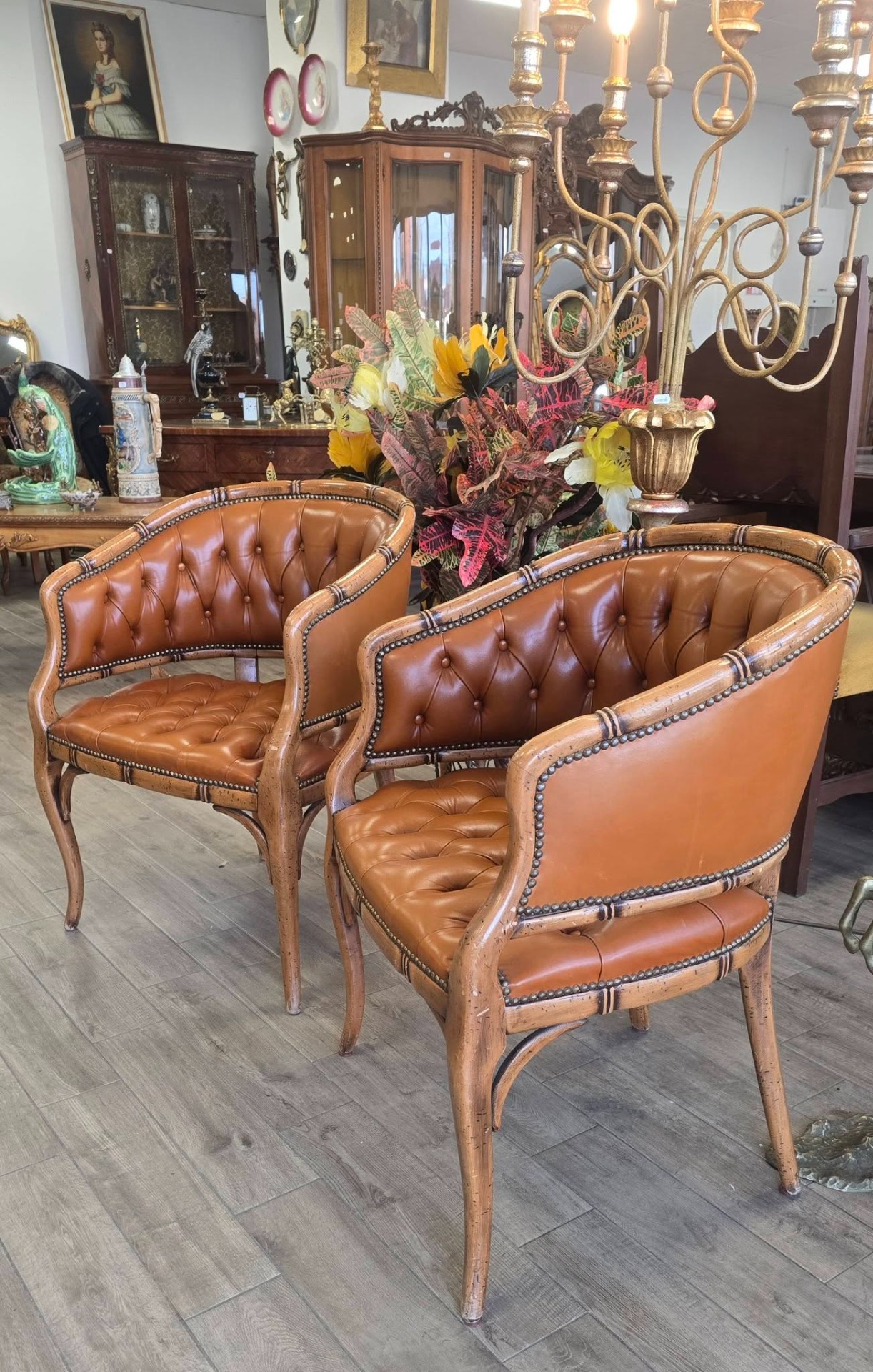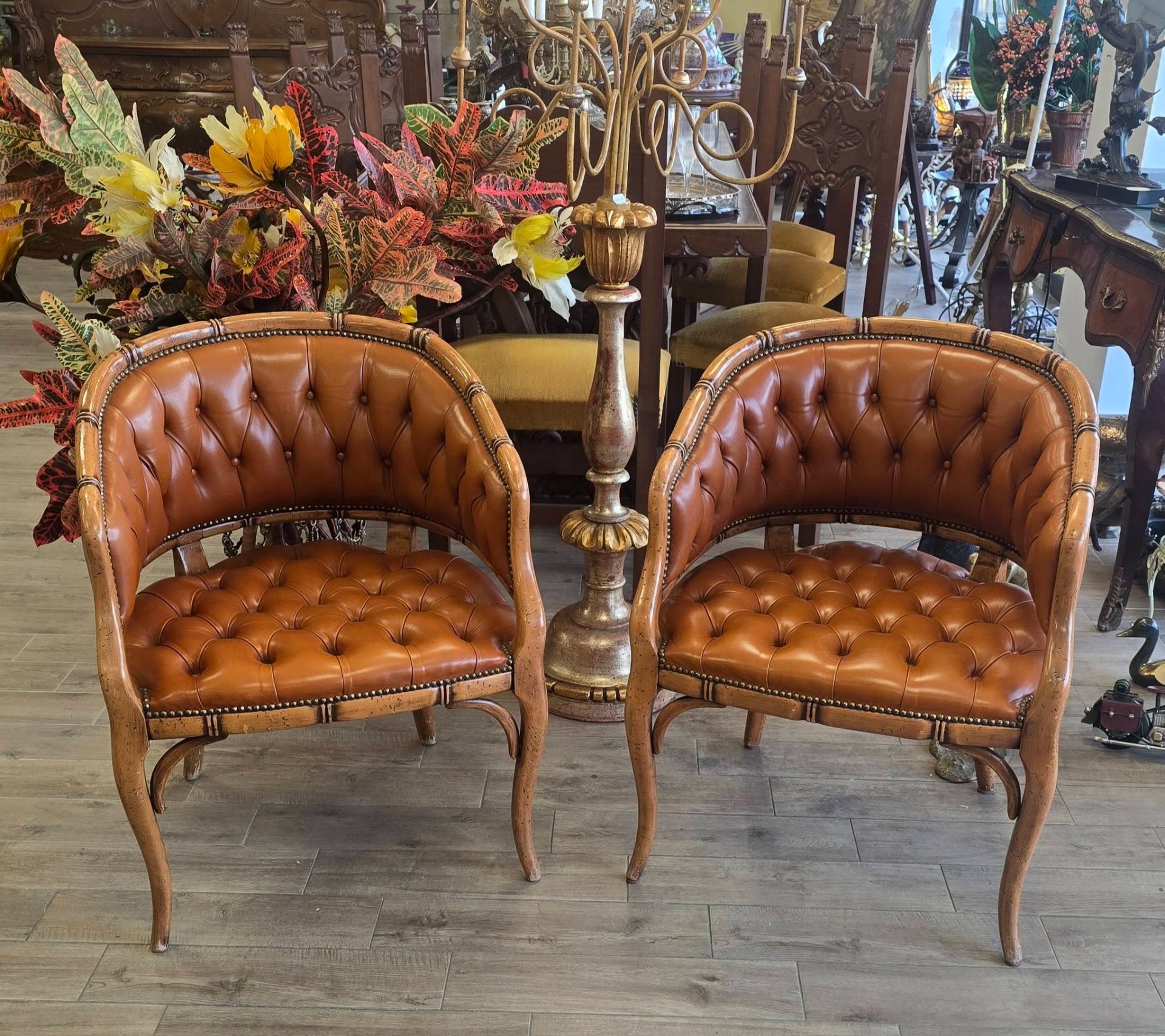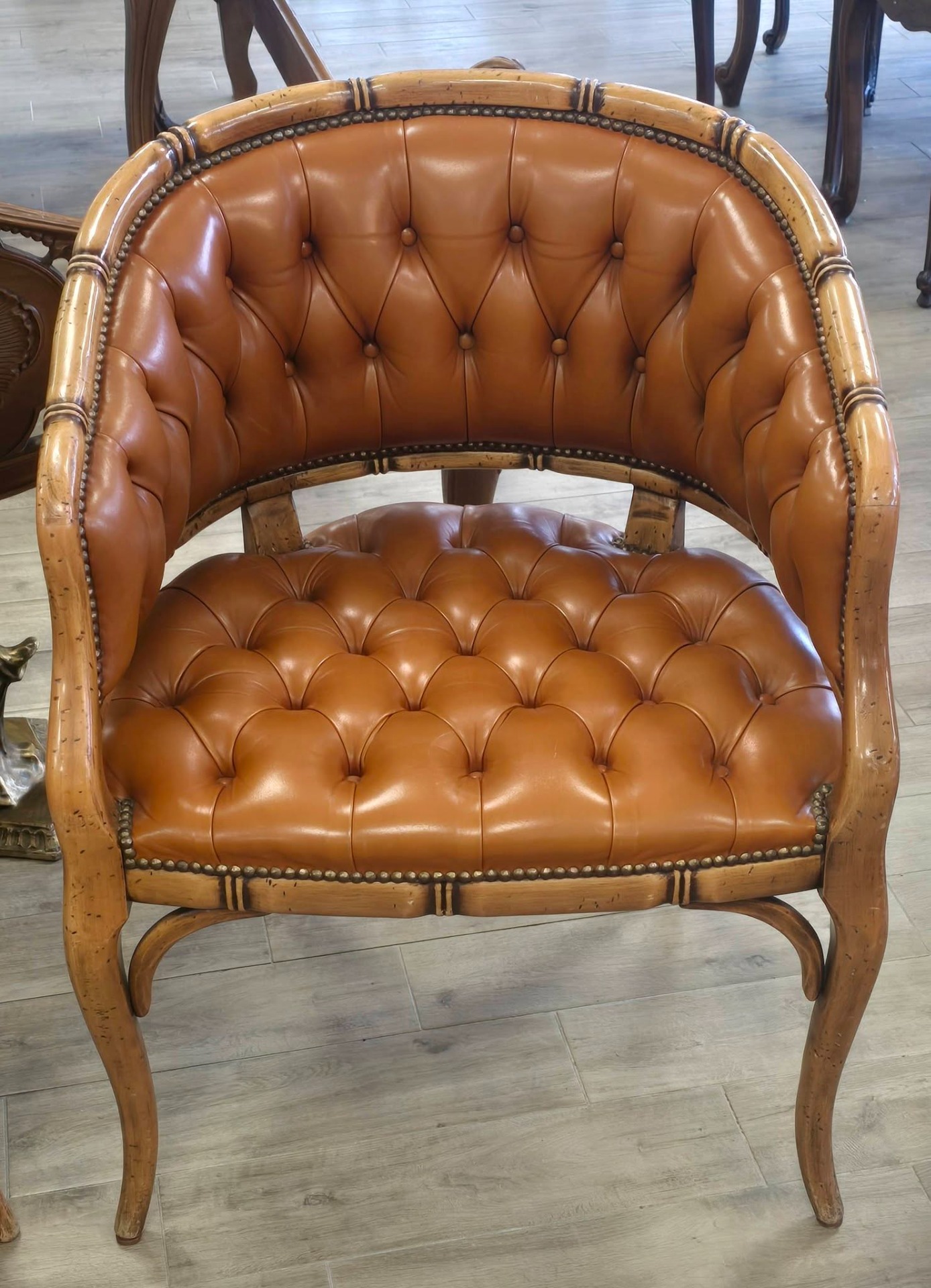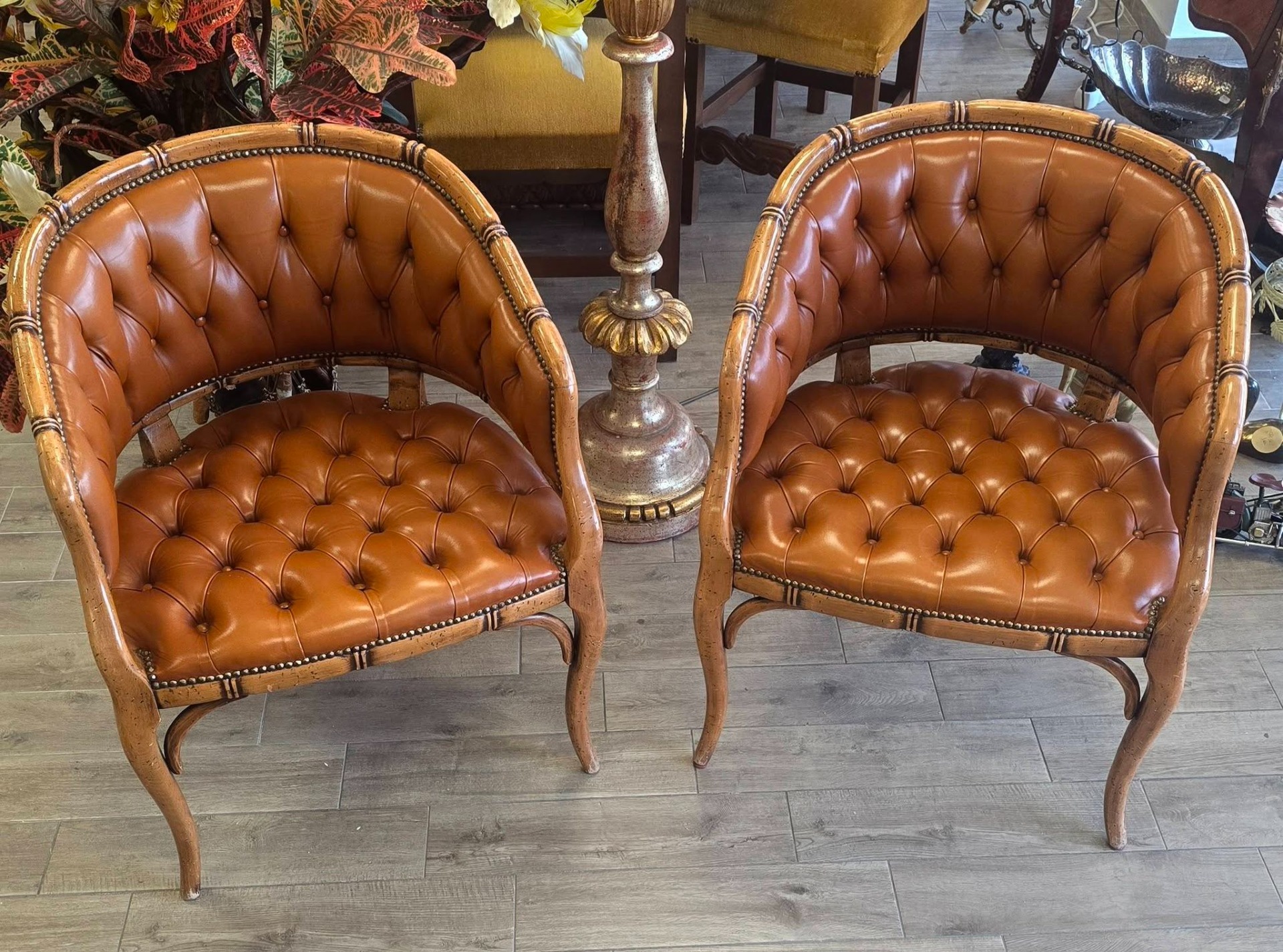 Set de două fotolii deosebite, cu un design sofisticat în stil "Hollywood Regency", de tip "barrel" (scoică), cu tapițerie din piele "cognac", lucrată în tehnica capitonată (button tufted) atât pe șezut, cât și pe spătar, cu cadru din lemn sculptat manual sub formă de bambus, finisaje cu ținte metalice decorative (nailhead trim) care urmăresc liniile curbate ale fotoliului.