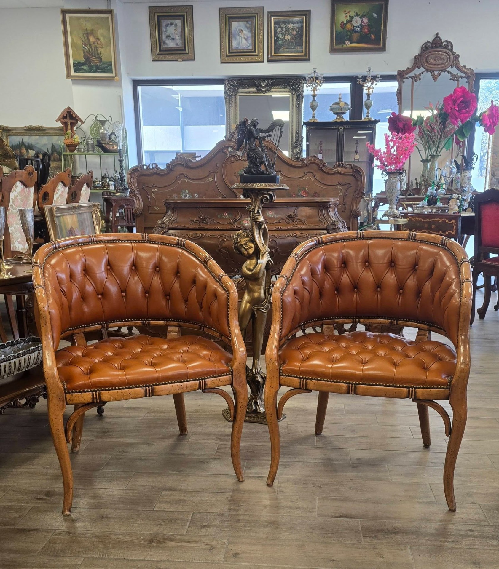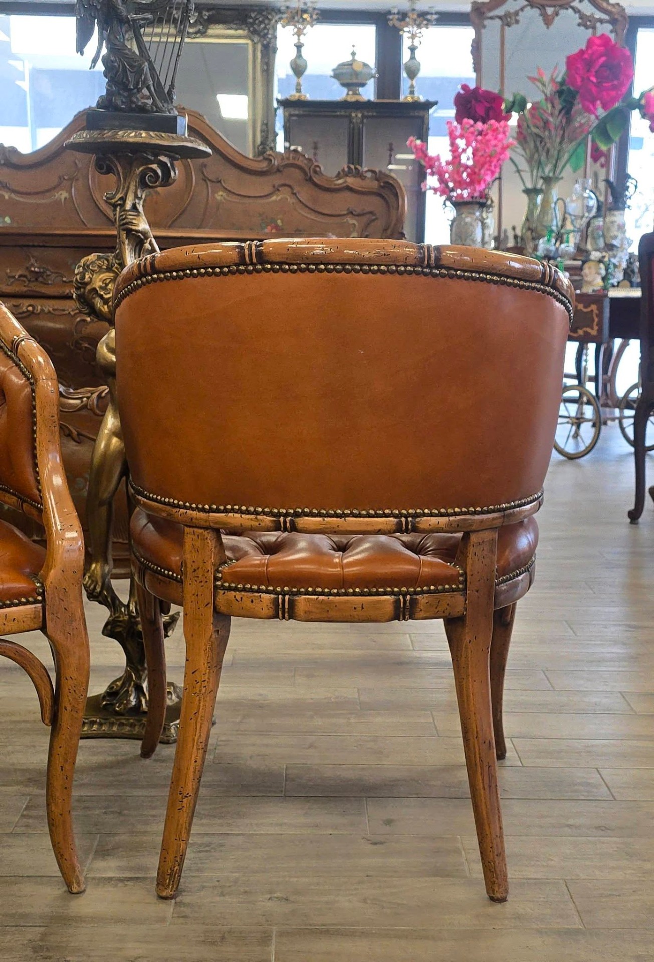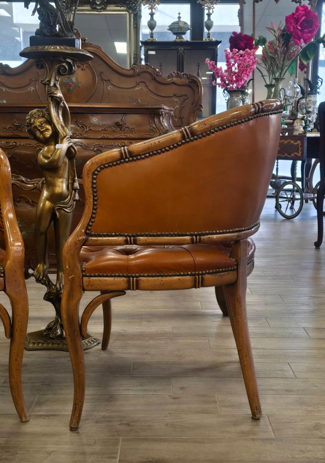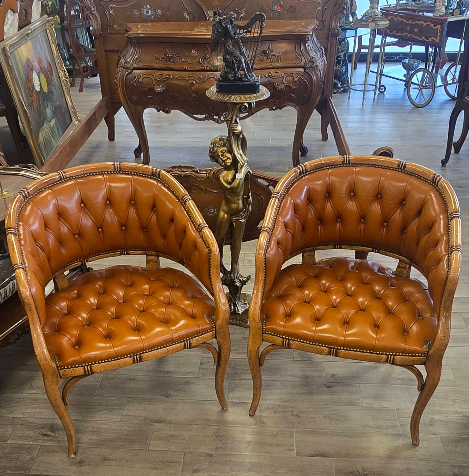 Set de două fotolii deosebite, cu un design sofisticat în stil "Hollywood Regency", de tip "barrel" (scoică), cu tapițerie din piele "cognac", lucrată în tehnica capitonată (button tufted) atât pe șezut, cât și pe spătar, cu cadru din lemn sculptat manual sub formă de bambus, finisaje cu ținte metalice decorative (nailhead trim) care urmăresc liniile curbate ale fotoliului.