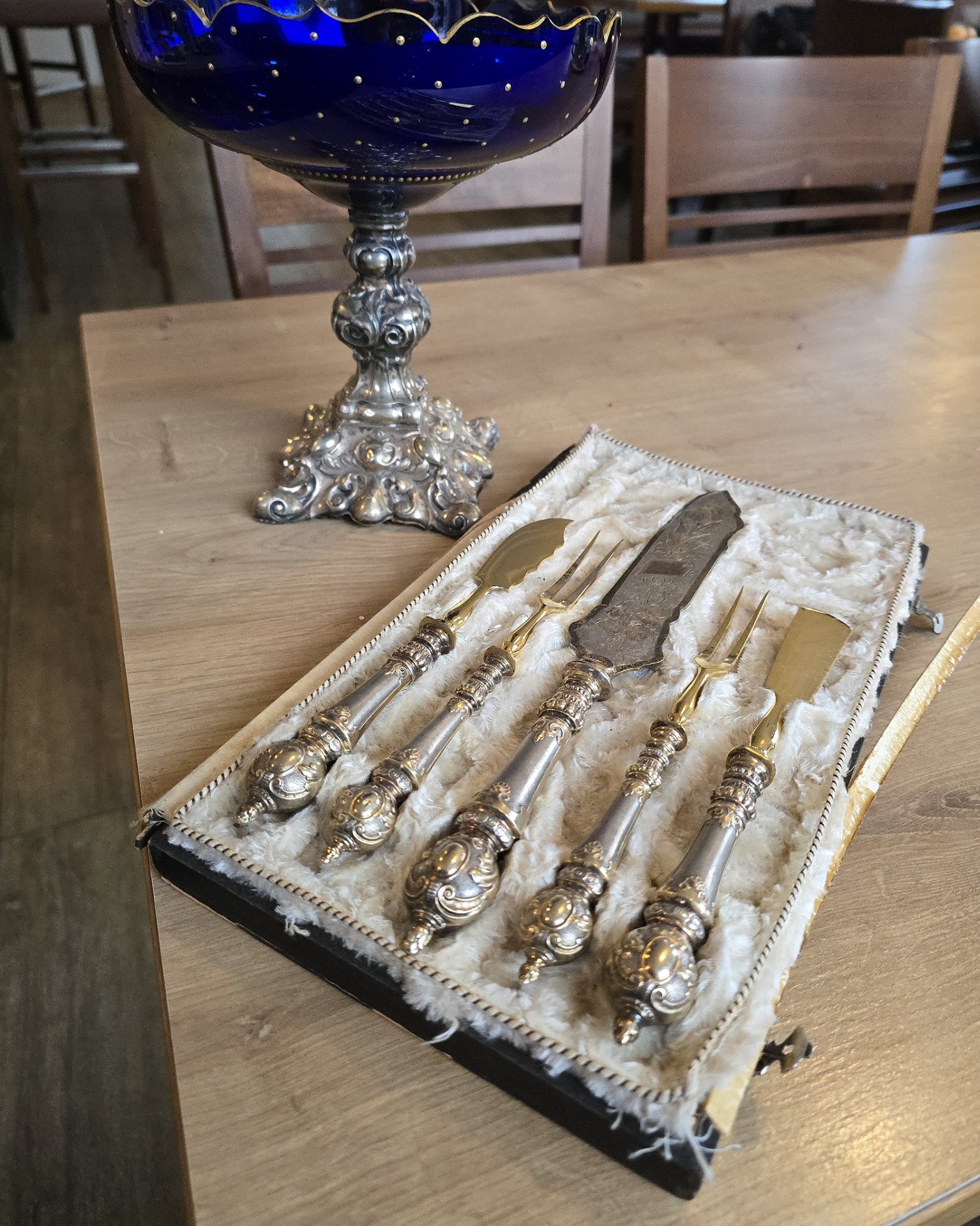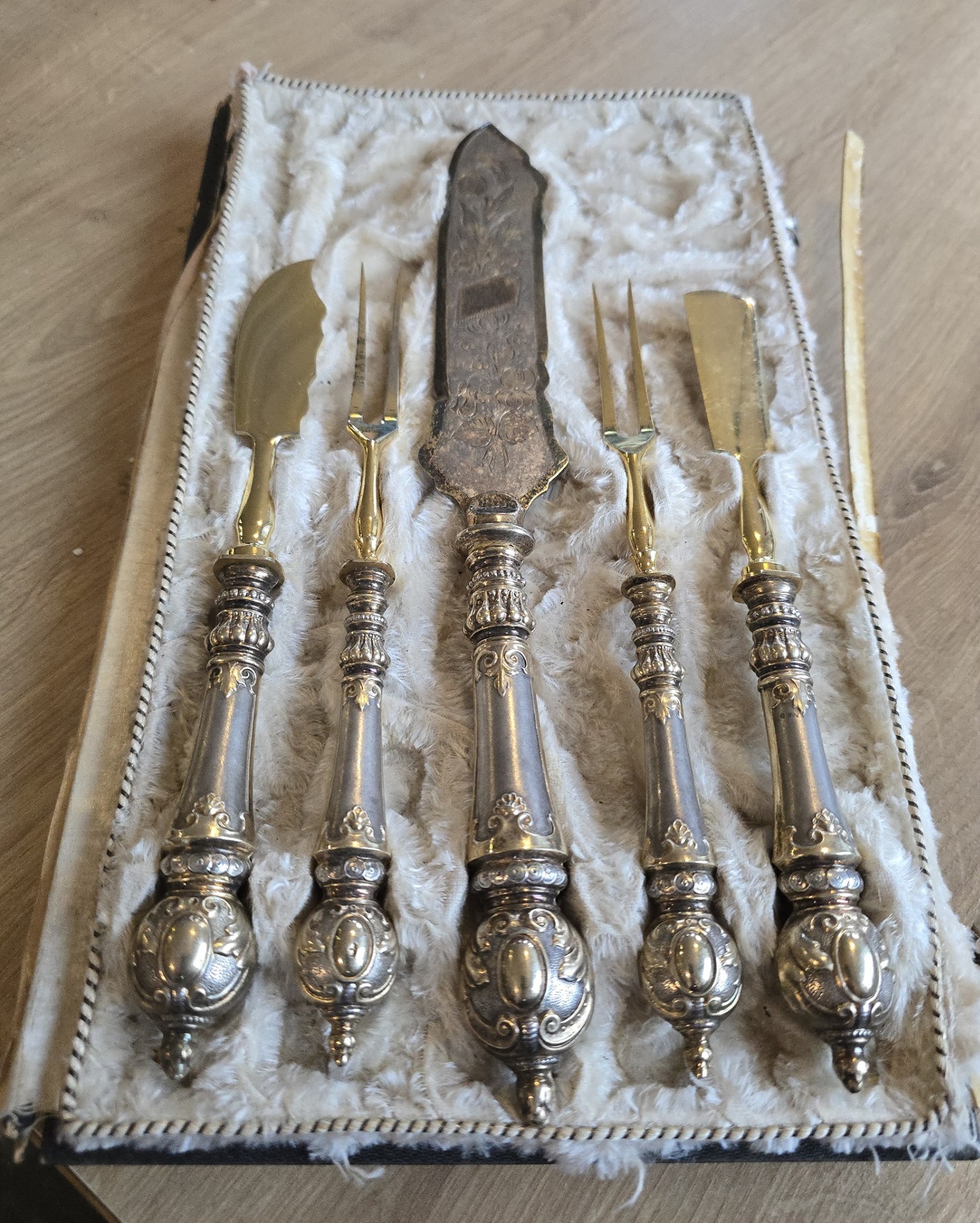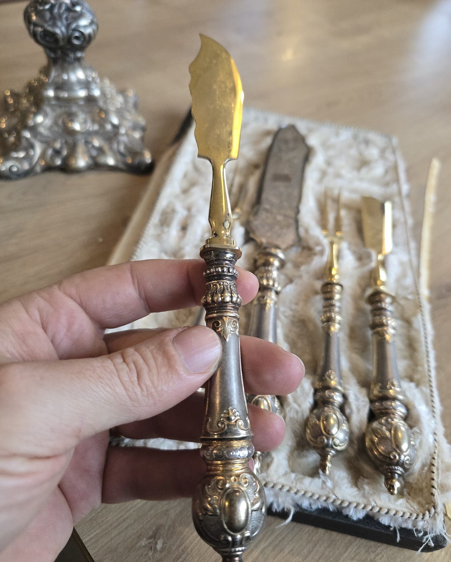 set de lux format din argint compus din 5 piese pentru servire, o piesă rară de colecție din perioada 1880-1900.