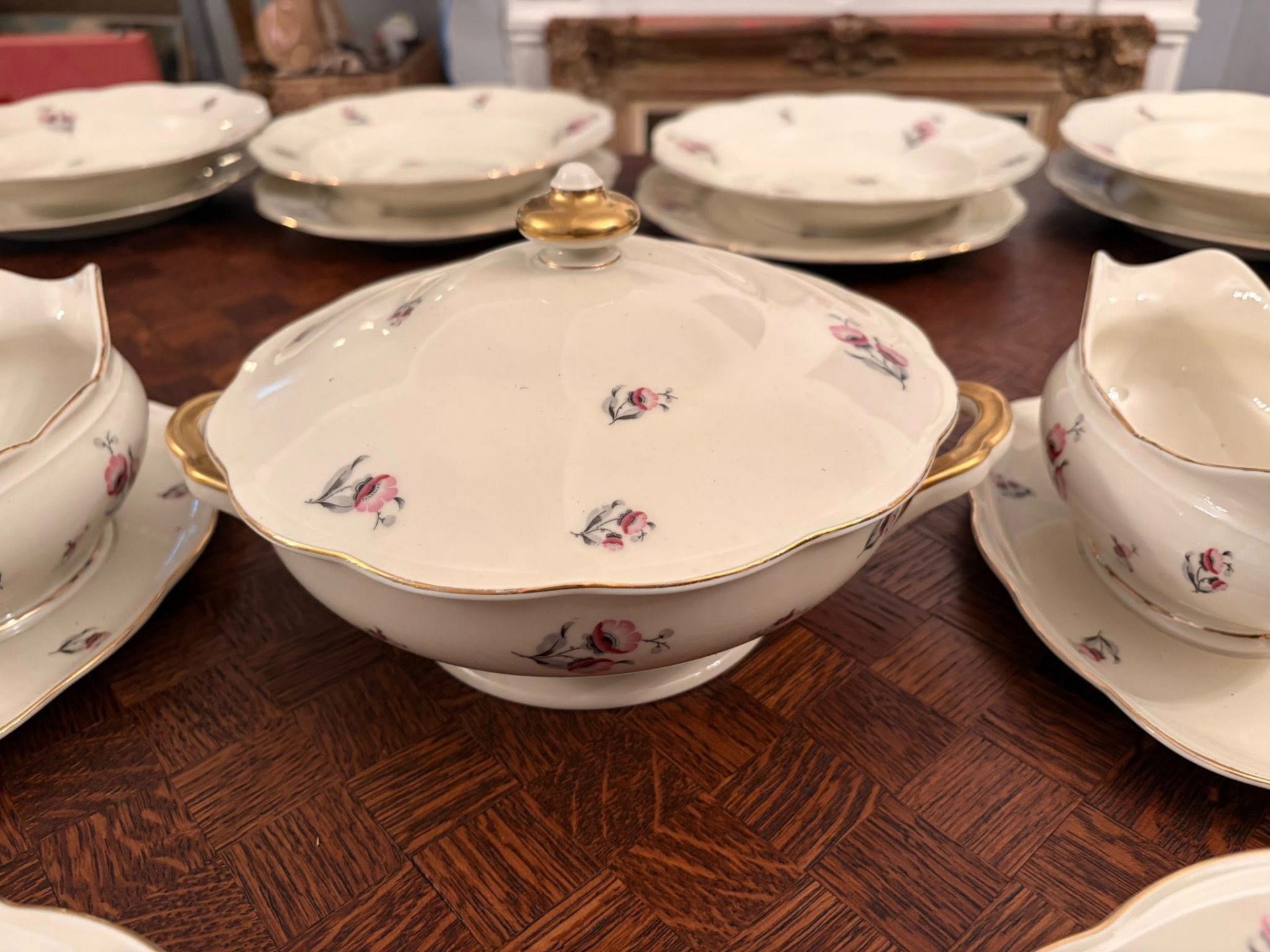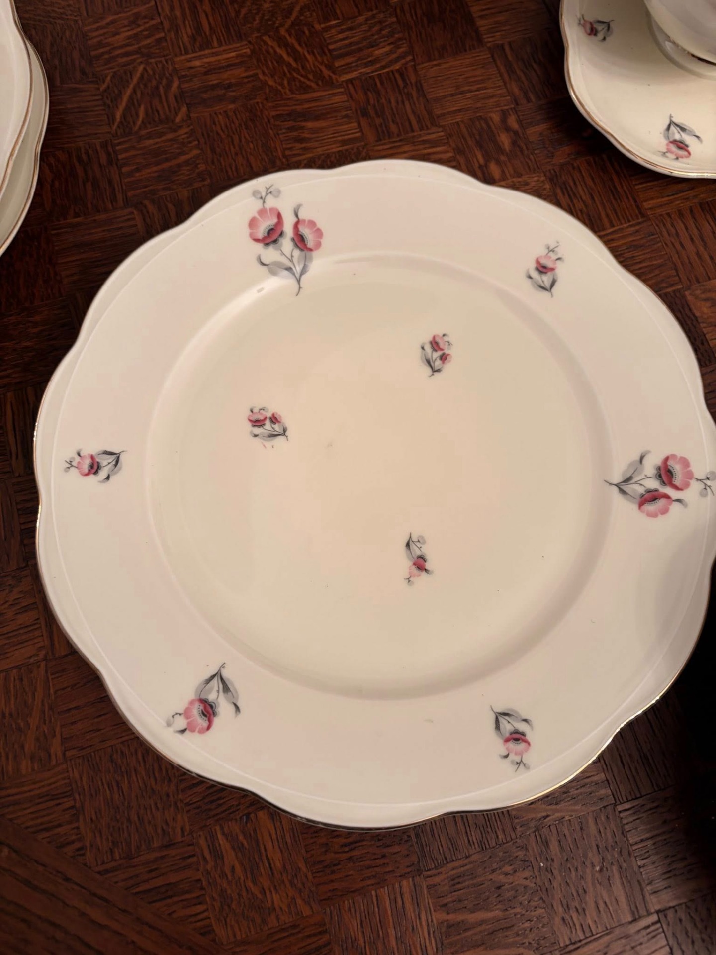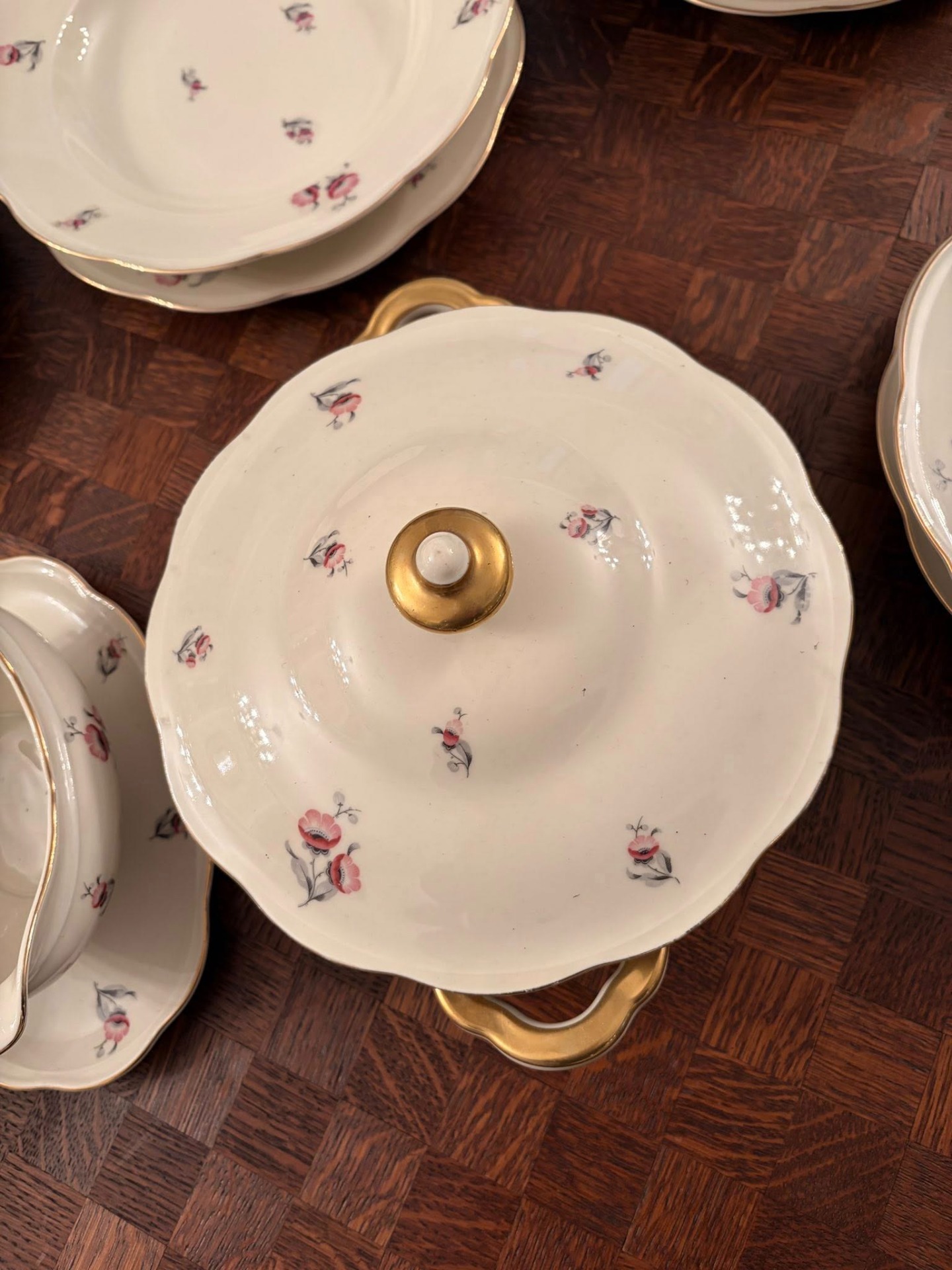 Este un model floral de tip "bucățele mici" sau „sprigs” (în termeni de porțelan), unde buchețele mici de flori sunt împrăștiate pe suprafața pieselor, nu concentrate doar pe margini.