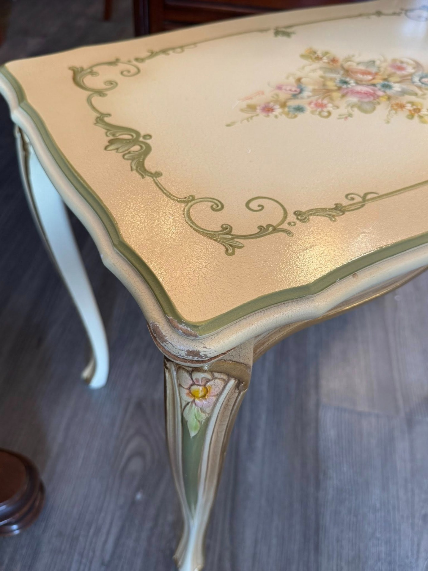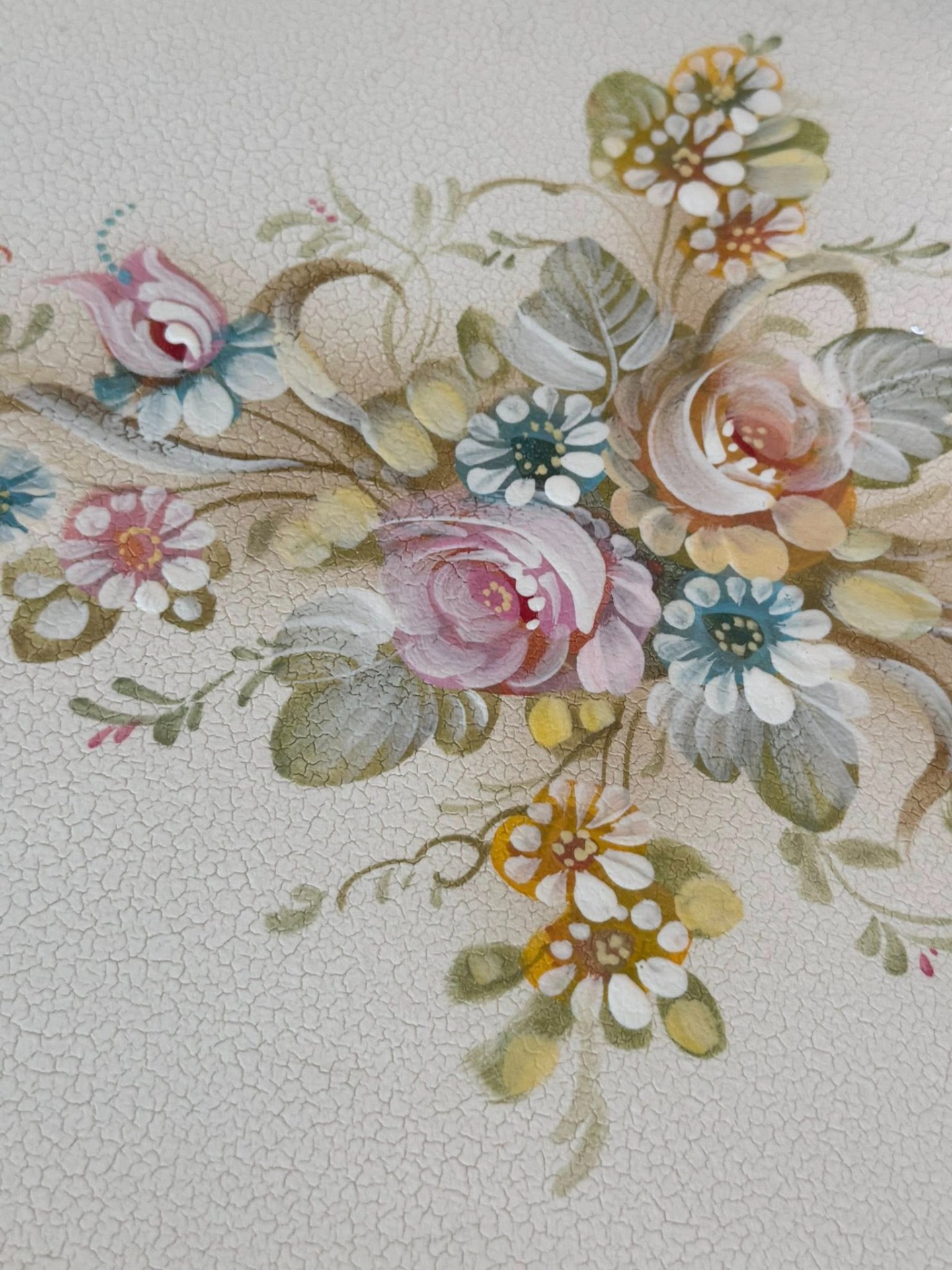 Pictura manuală: Blaturile sunt decorate cu motive florale delicate (buchete de trandafiri și margarete) și borduri verzi, realizate prin pictură manuală, ceea ce oferă unicitate fiecărei măsuțe.