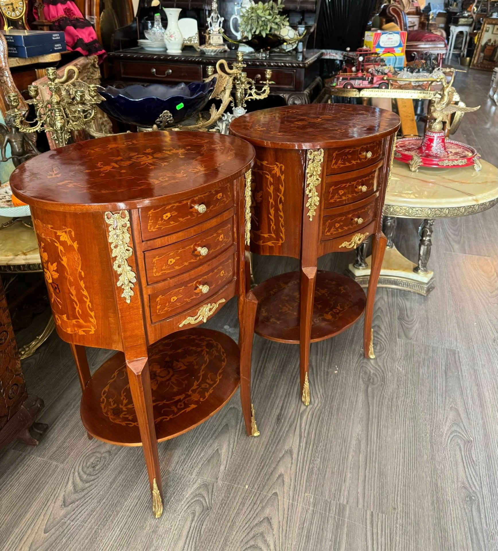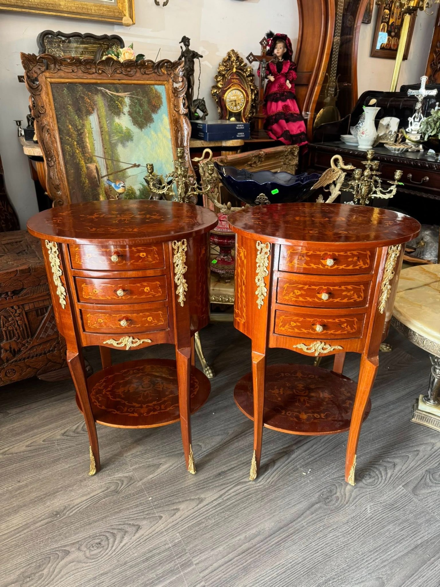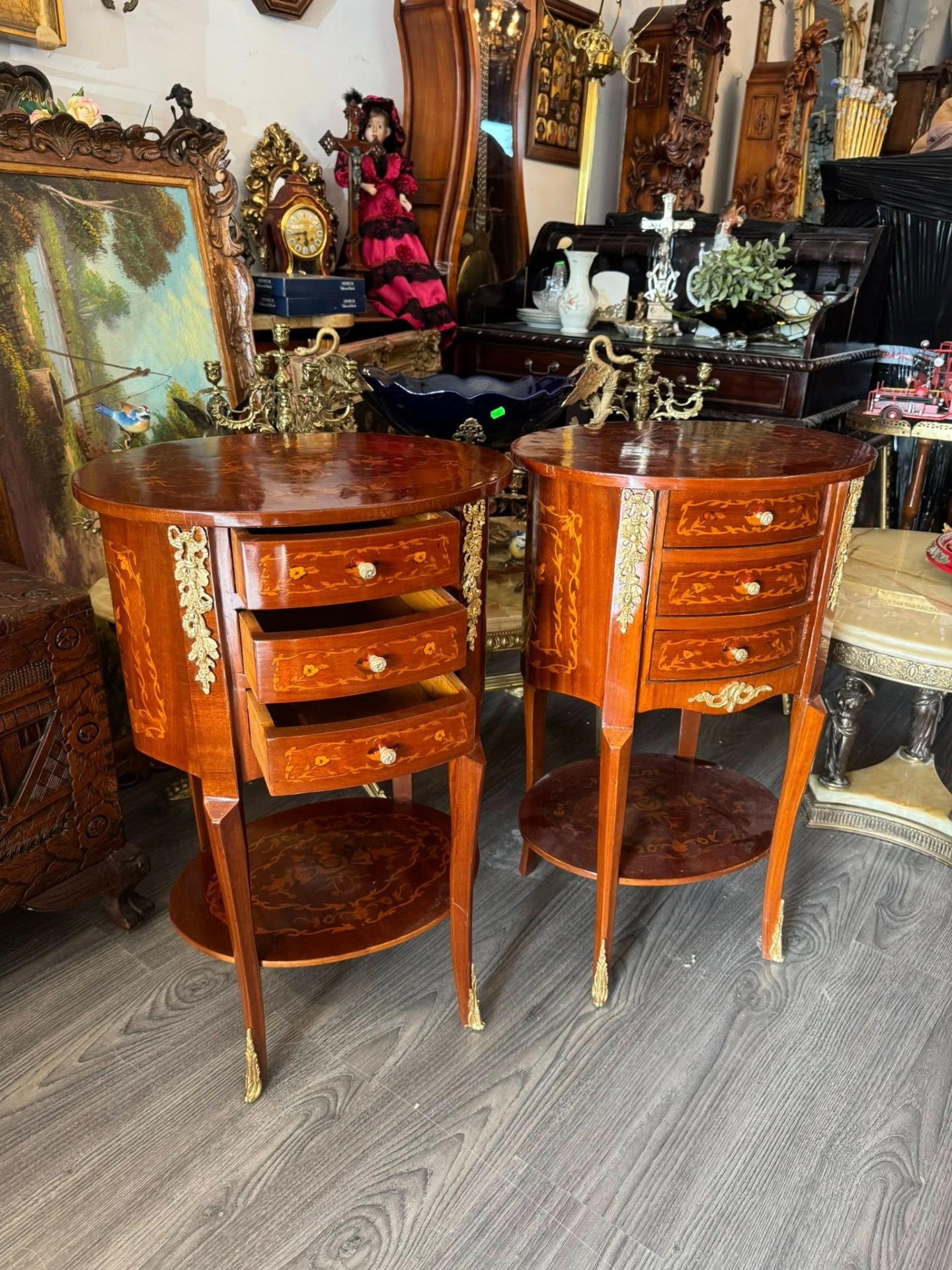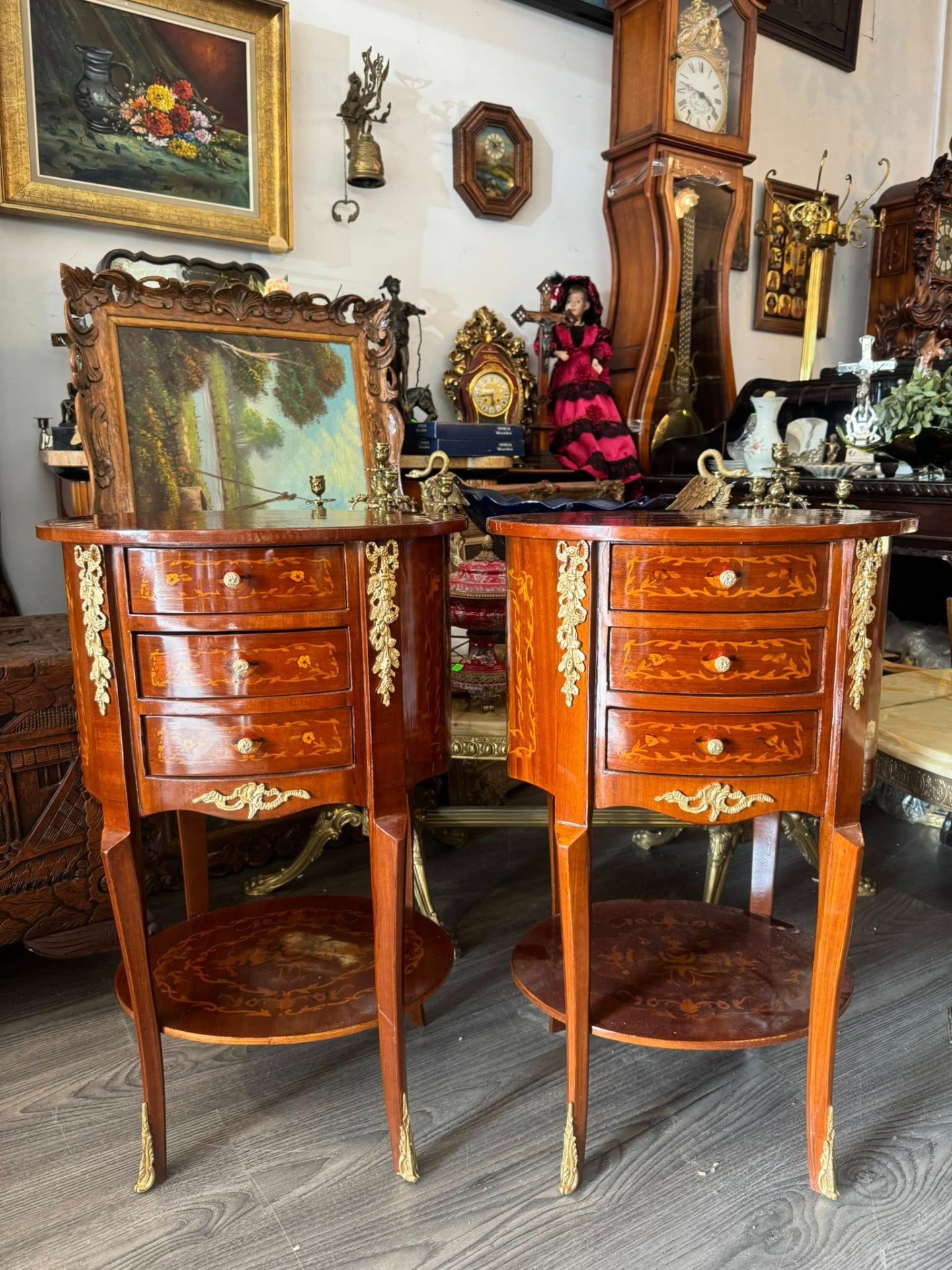 Set de noptiere realizate în stil Ludovic al XV-lea, decorate cu intarsie cu motiv floral.