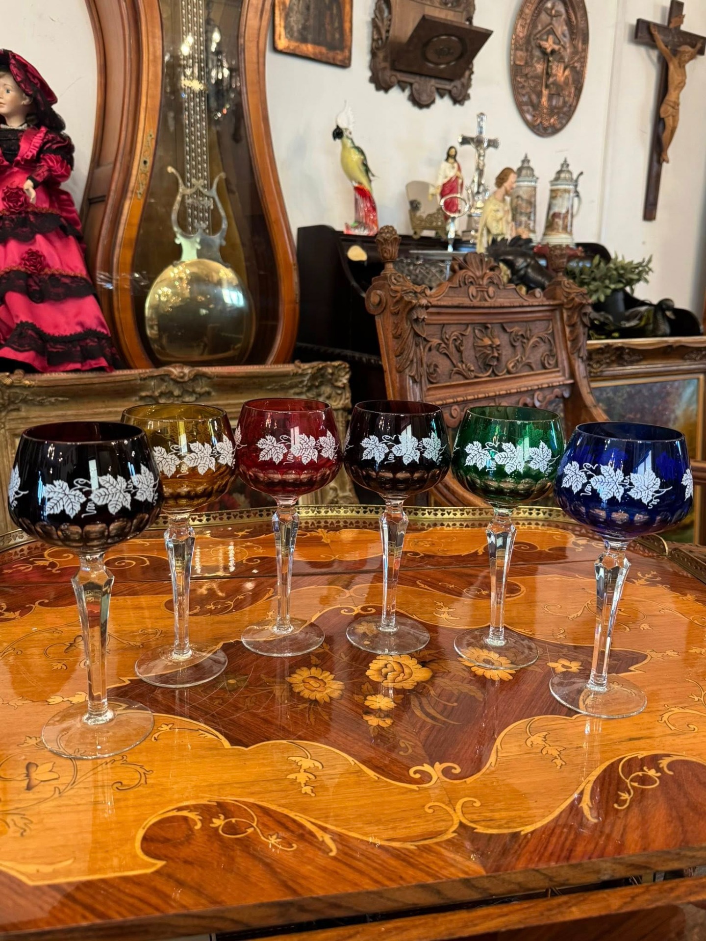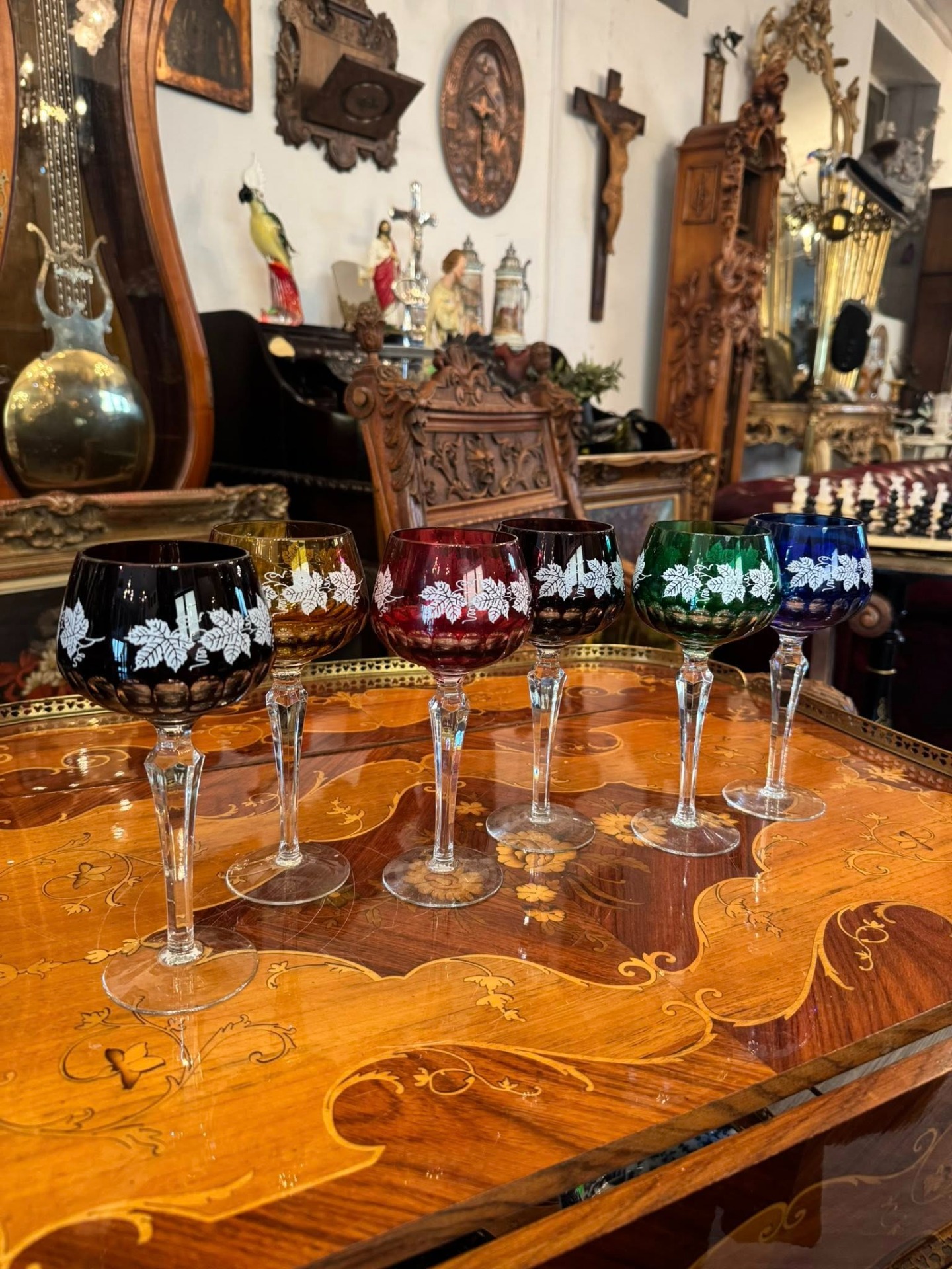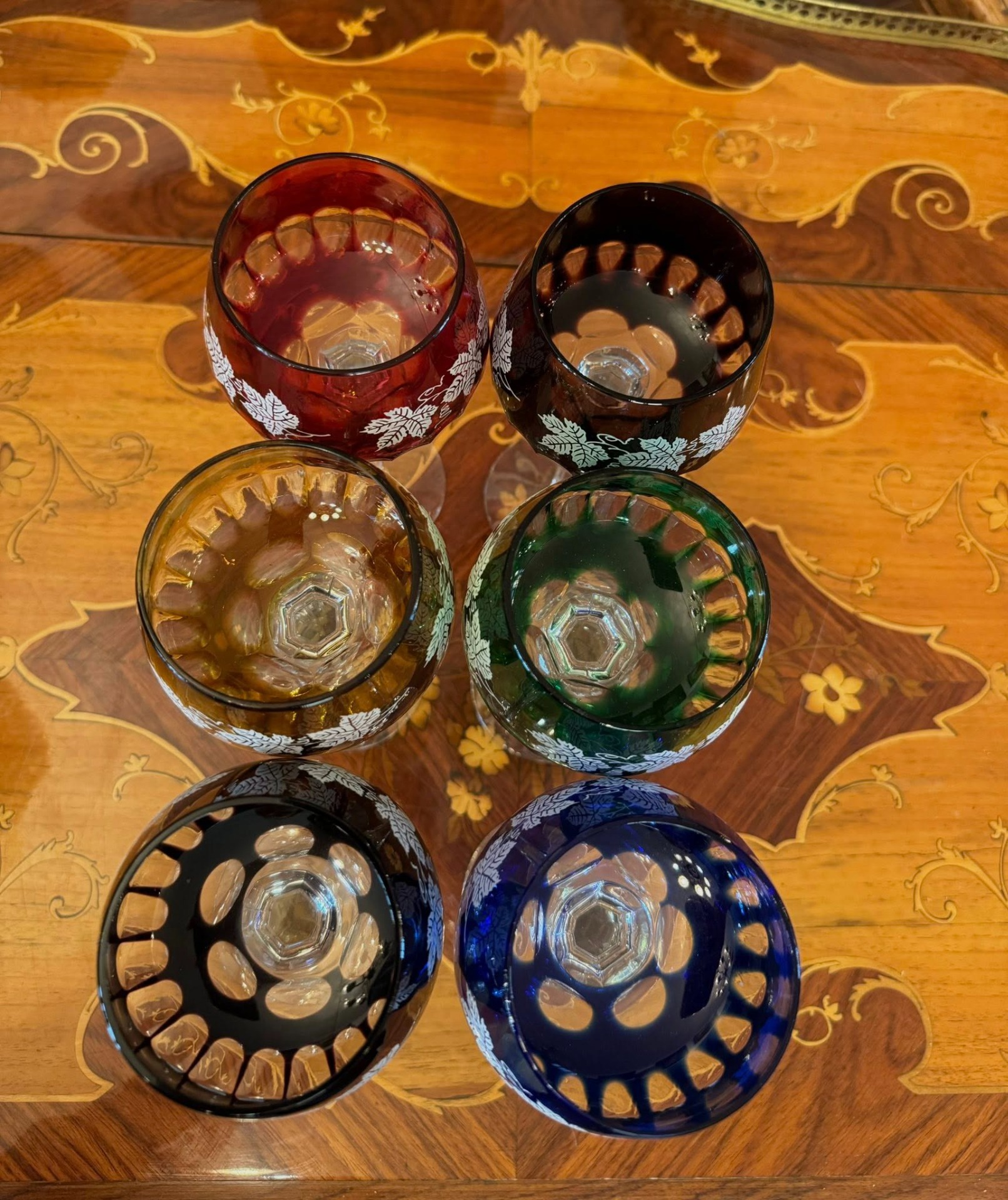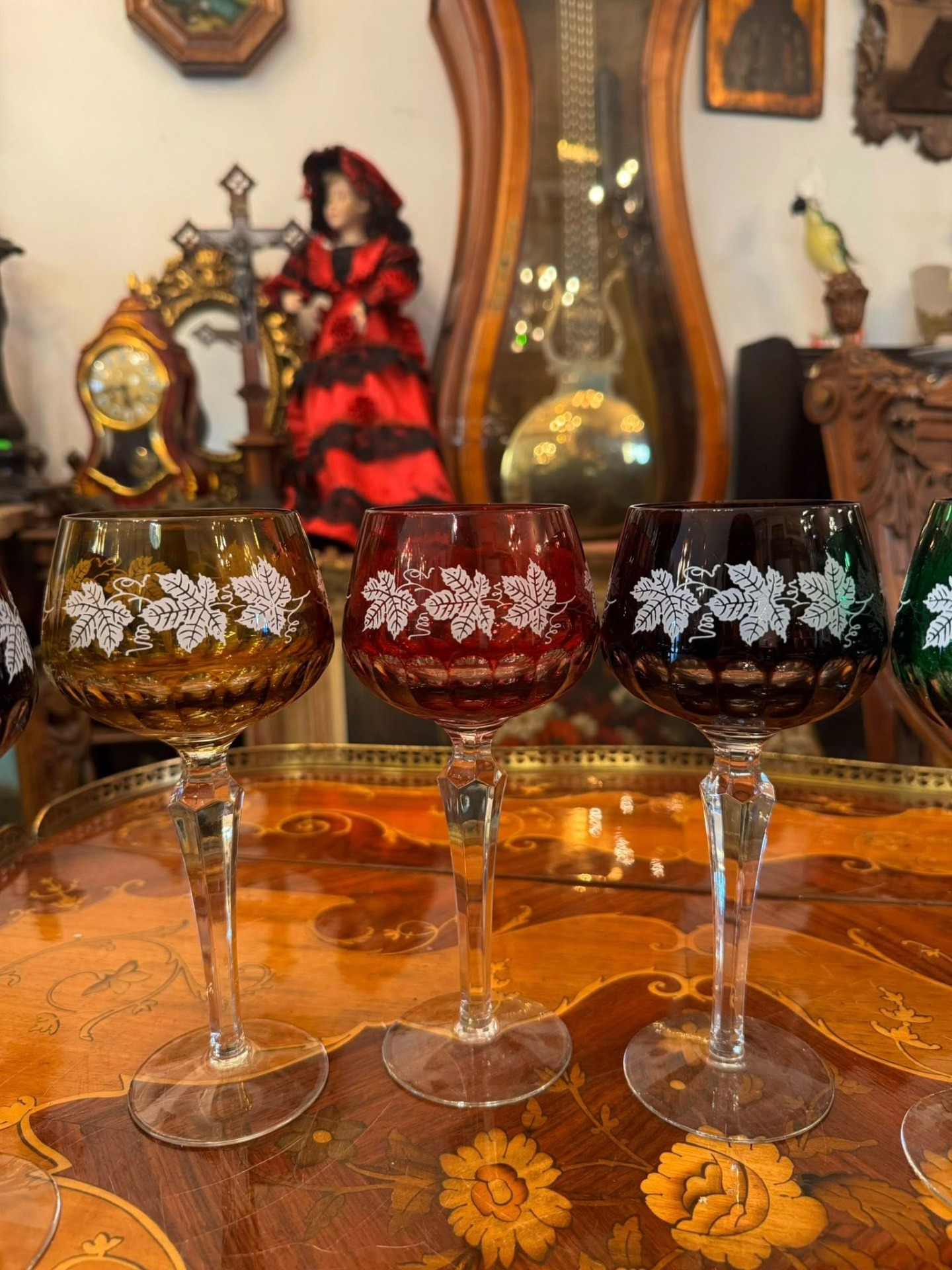 Set de pahare realizat din cristal de Boemia suprapus (overlay). Cupele sunt decorate cu motive viticole (frunze și ciorchini de viță-de-vie)- cca 1960