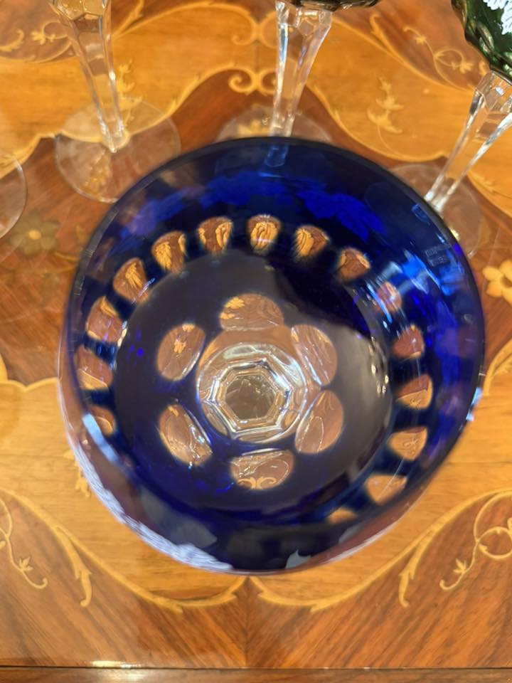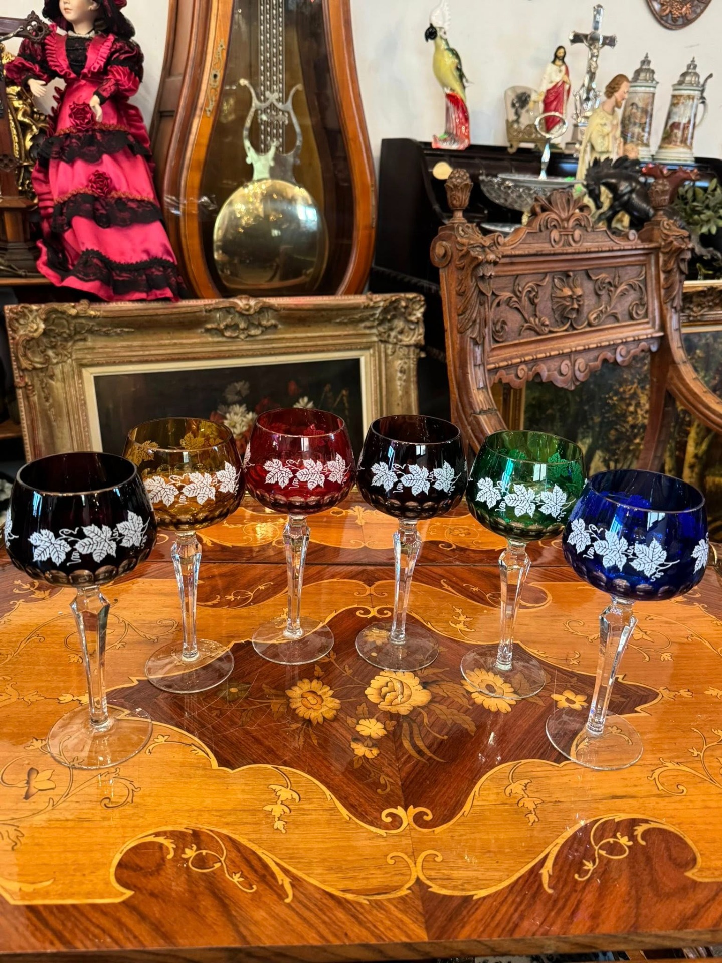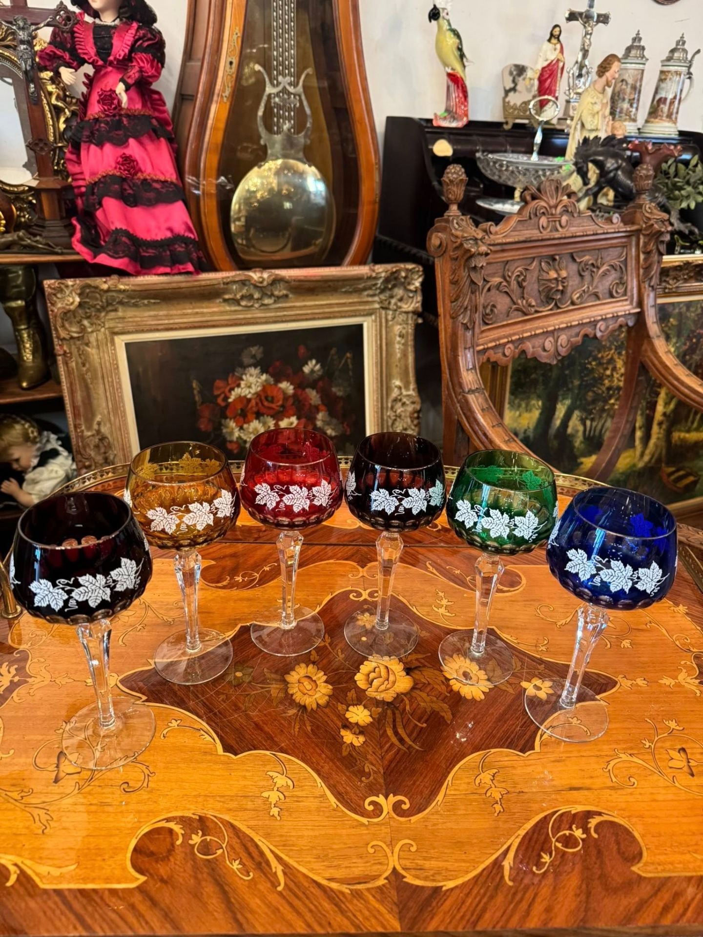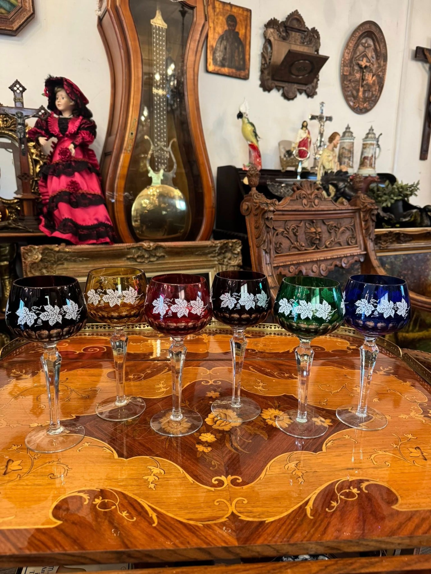 Set de pahare realizat din cristal de Boemia suprapus (overlay). Cupele sunt decorate cu motive viticole (frunze și ciorchini de viță-de-vie)- cca 1960