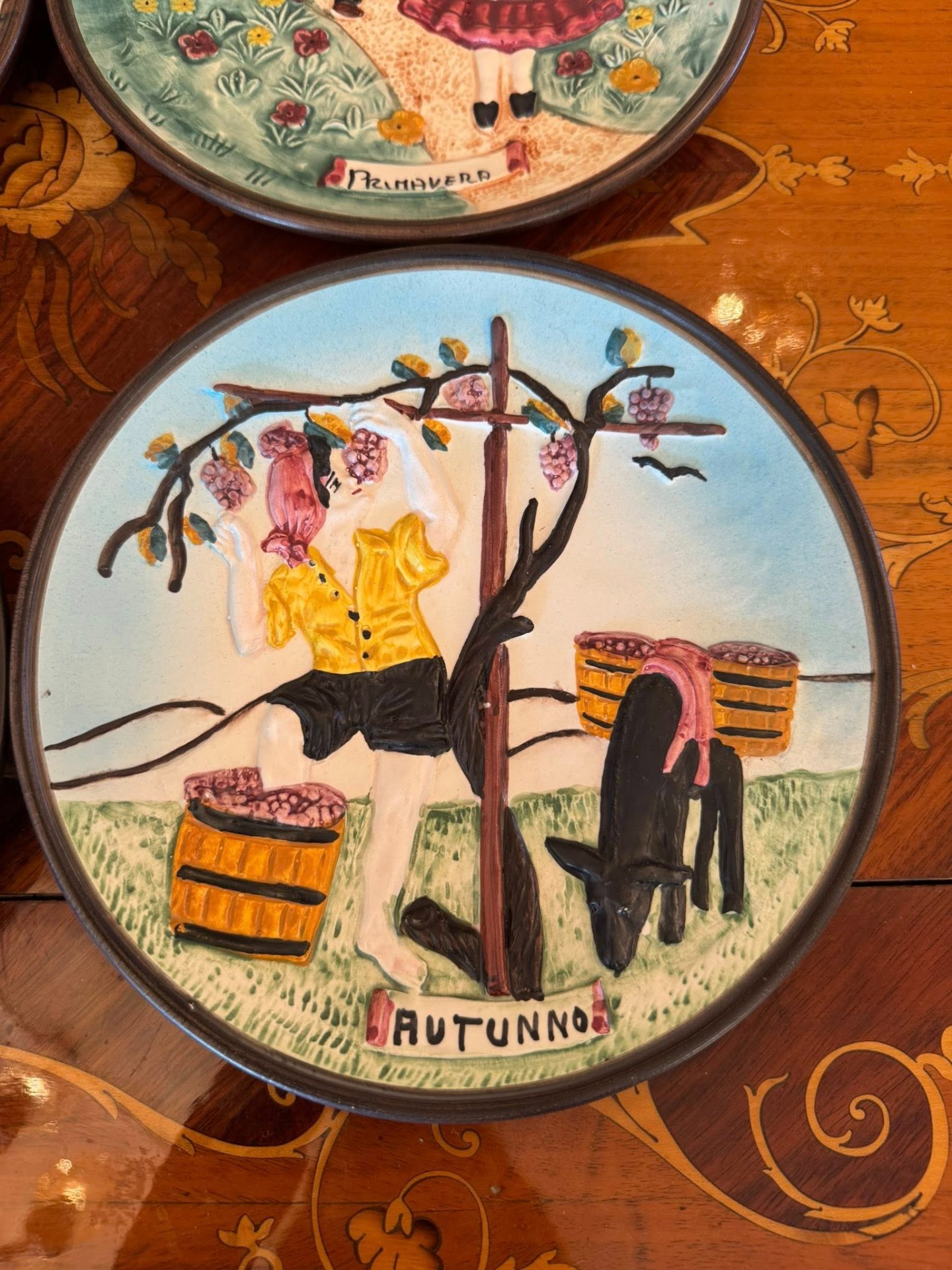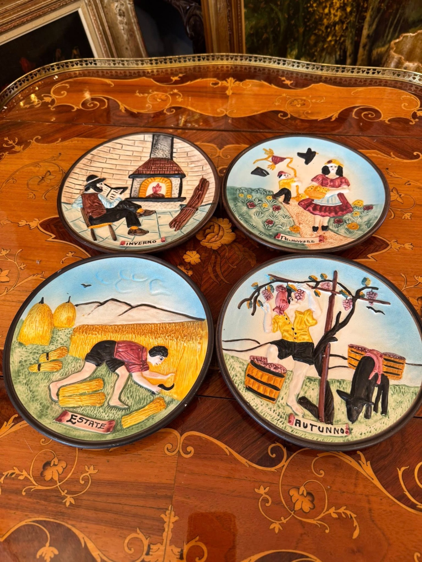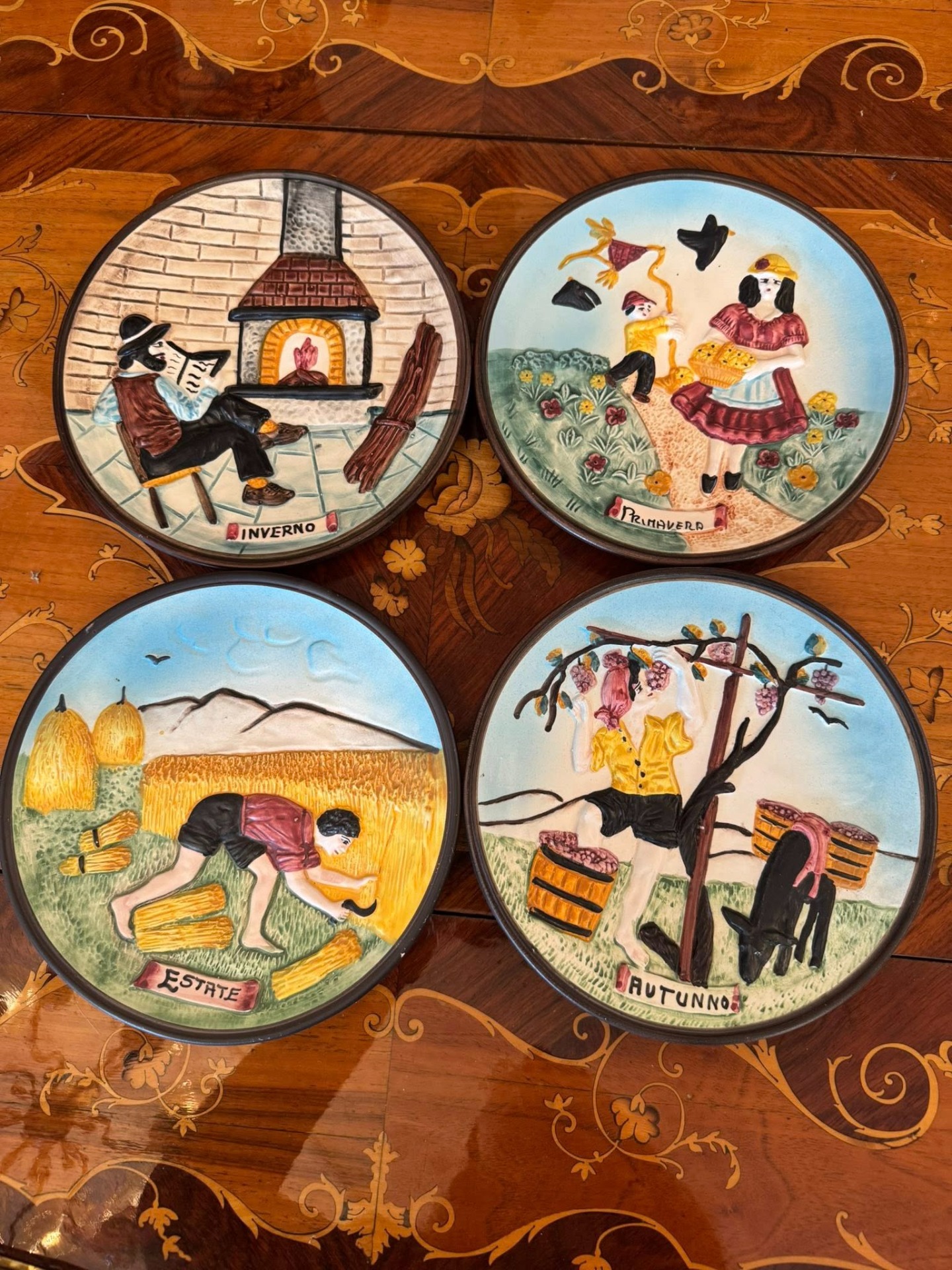 Set de patru farfurii decorative realizate în stil basorelief, care ilustrează ciclul celor patru anotimpuri.Realizate din ceramică stil majoloca, Italia-cca 1960.