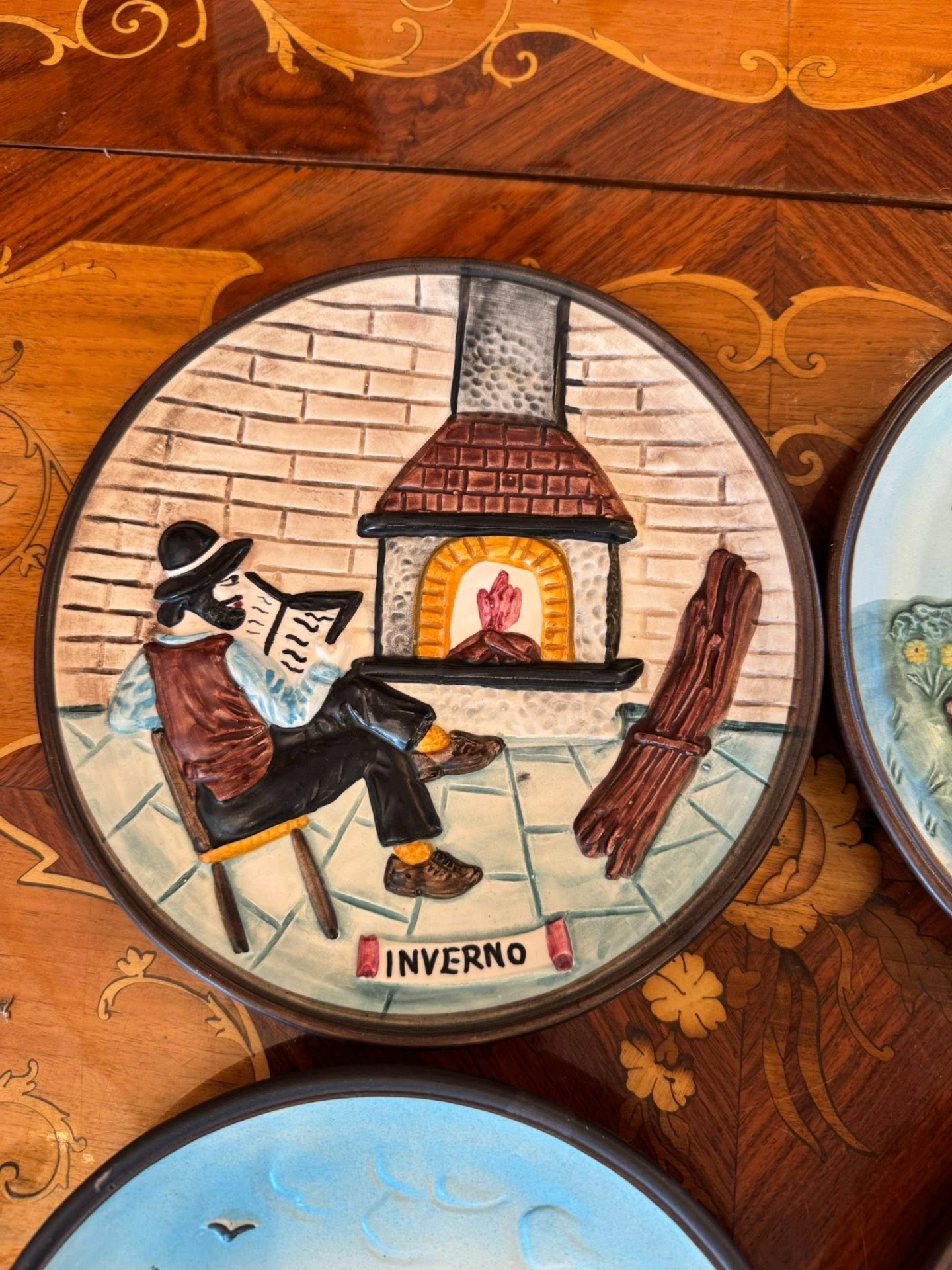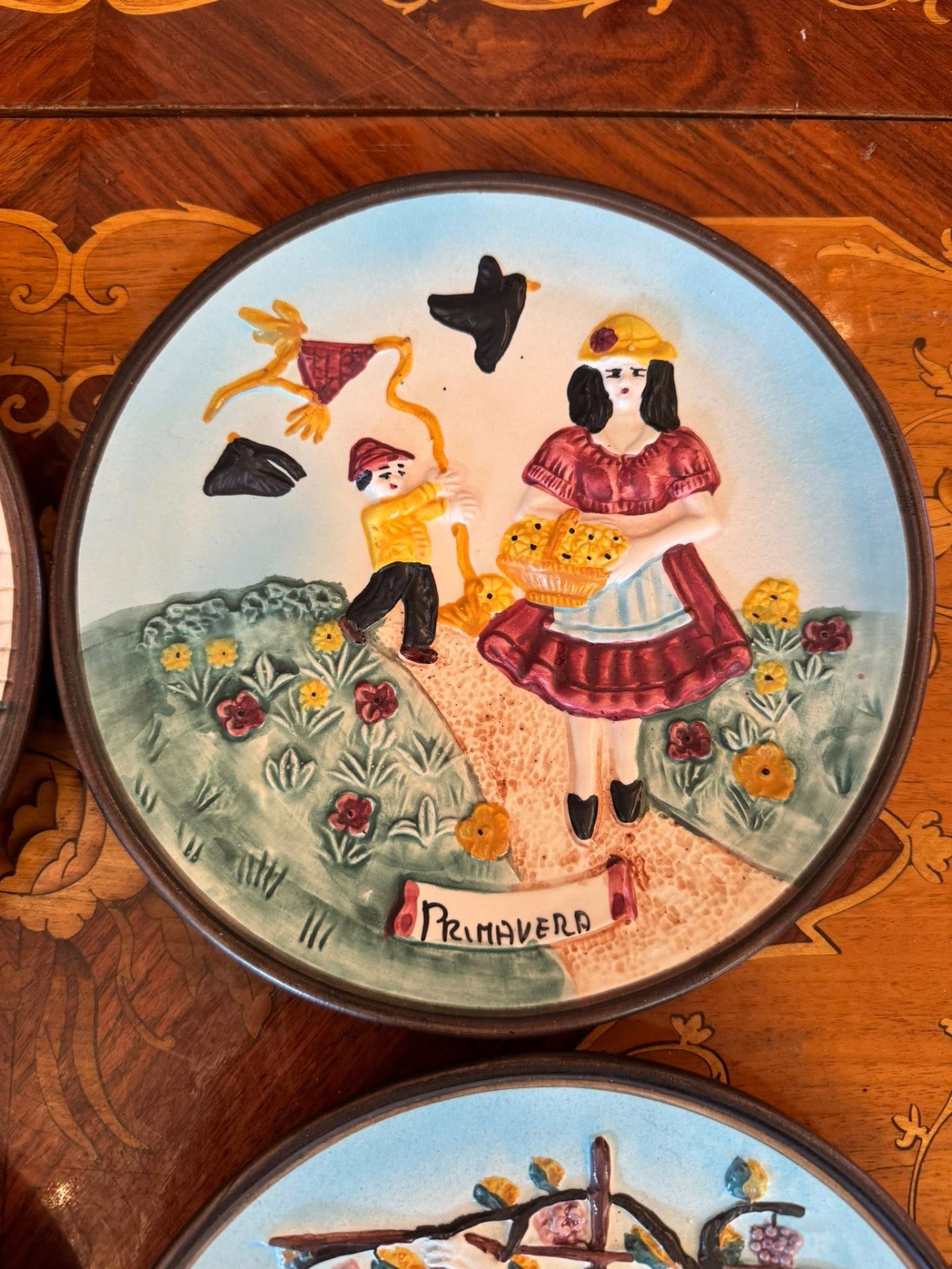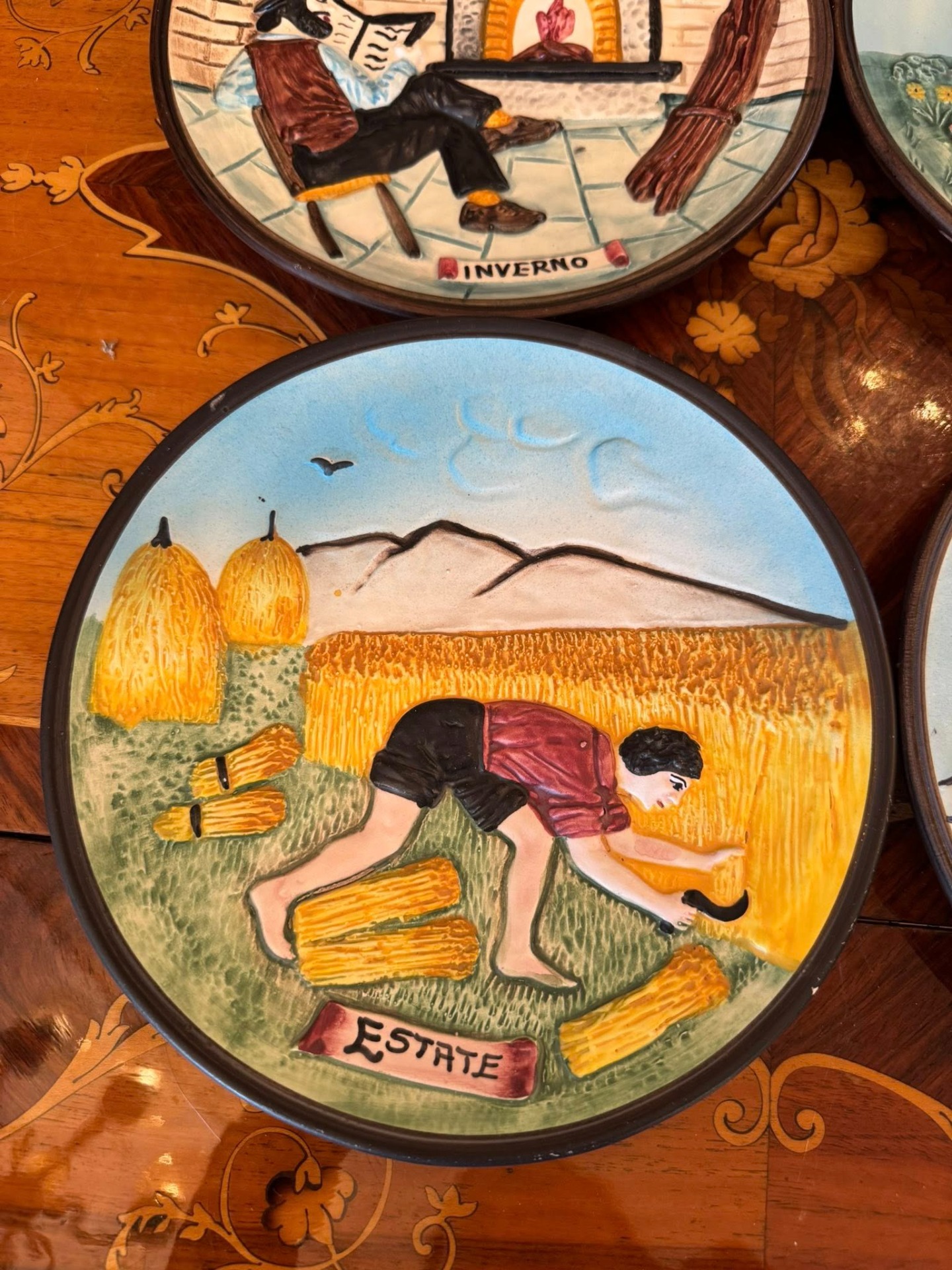 Set de patru farfurii decorative realizate în stil basorelief, care ilustrează ciclul celor patru anotimpuri.Realizate din ceramică stil majoloca, Italia-cca 1960.