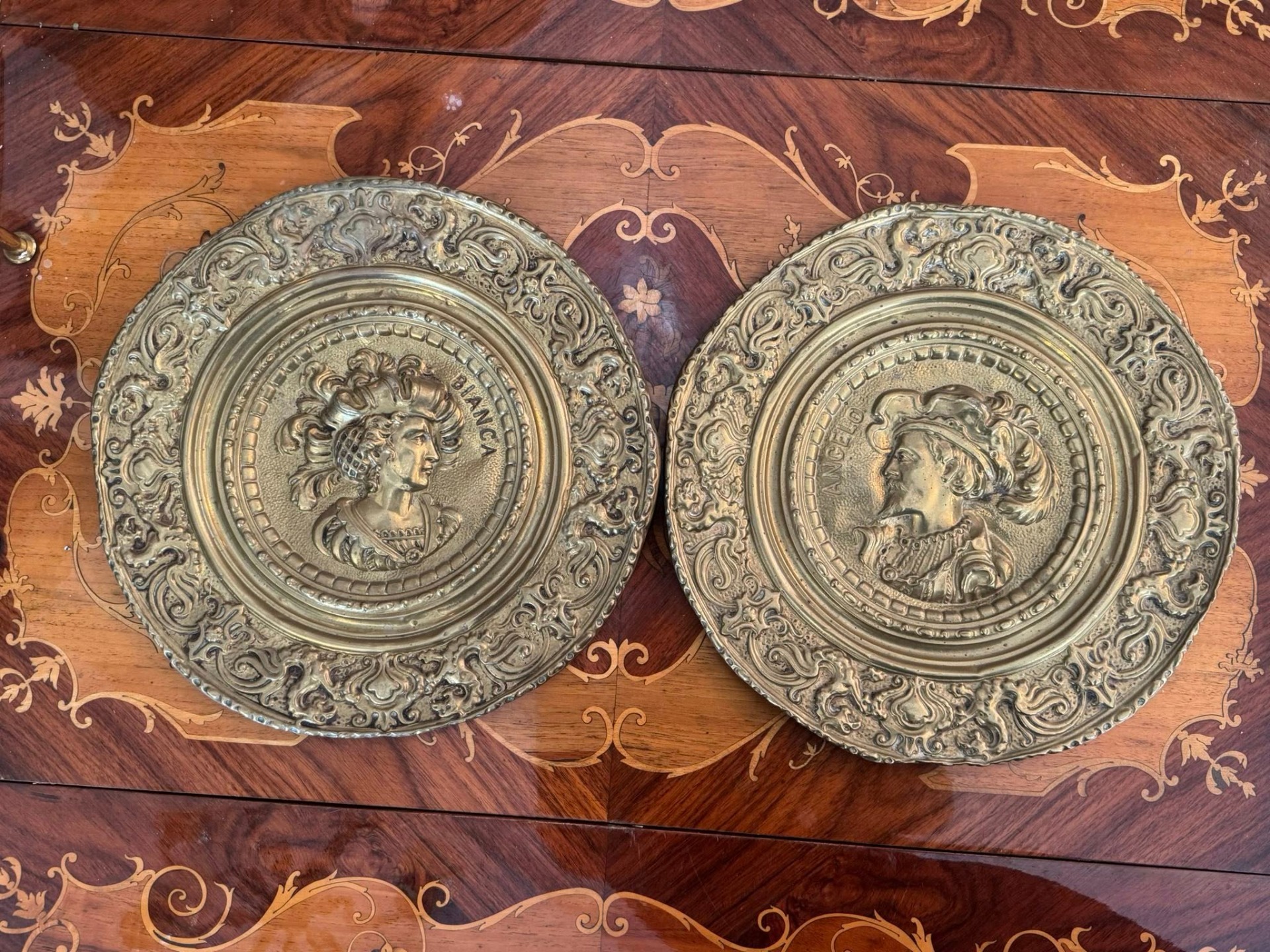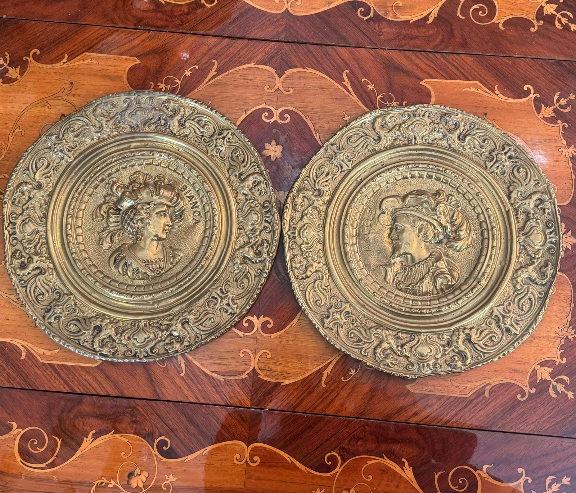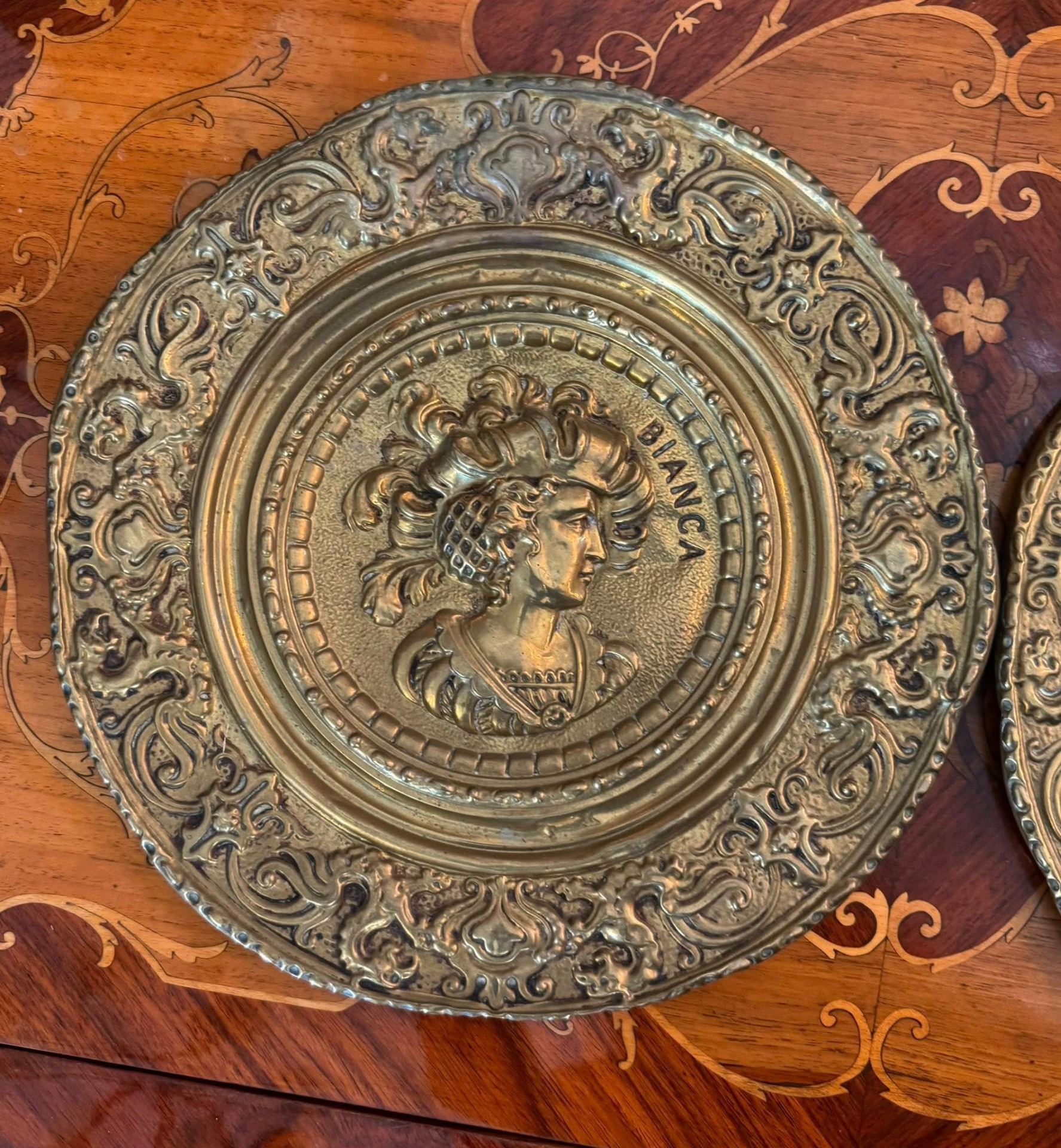 Set de platouri decorative pentru perete, deosebite, realizate din alamă, lucrate în relief (tehnică tip repoussé).