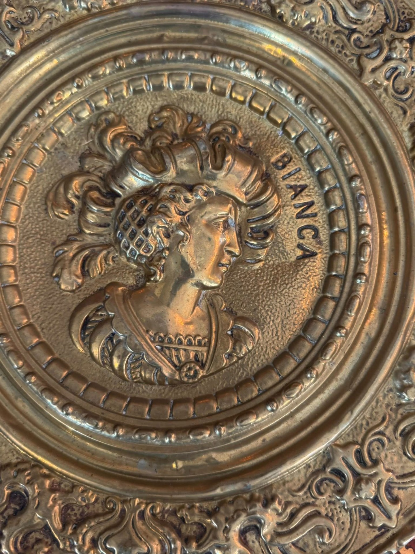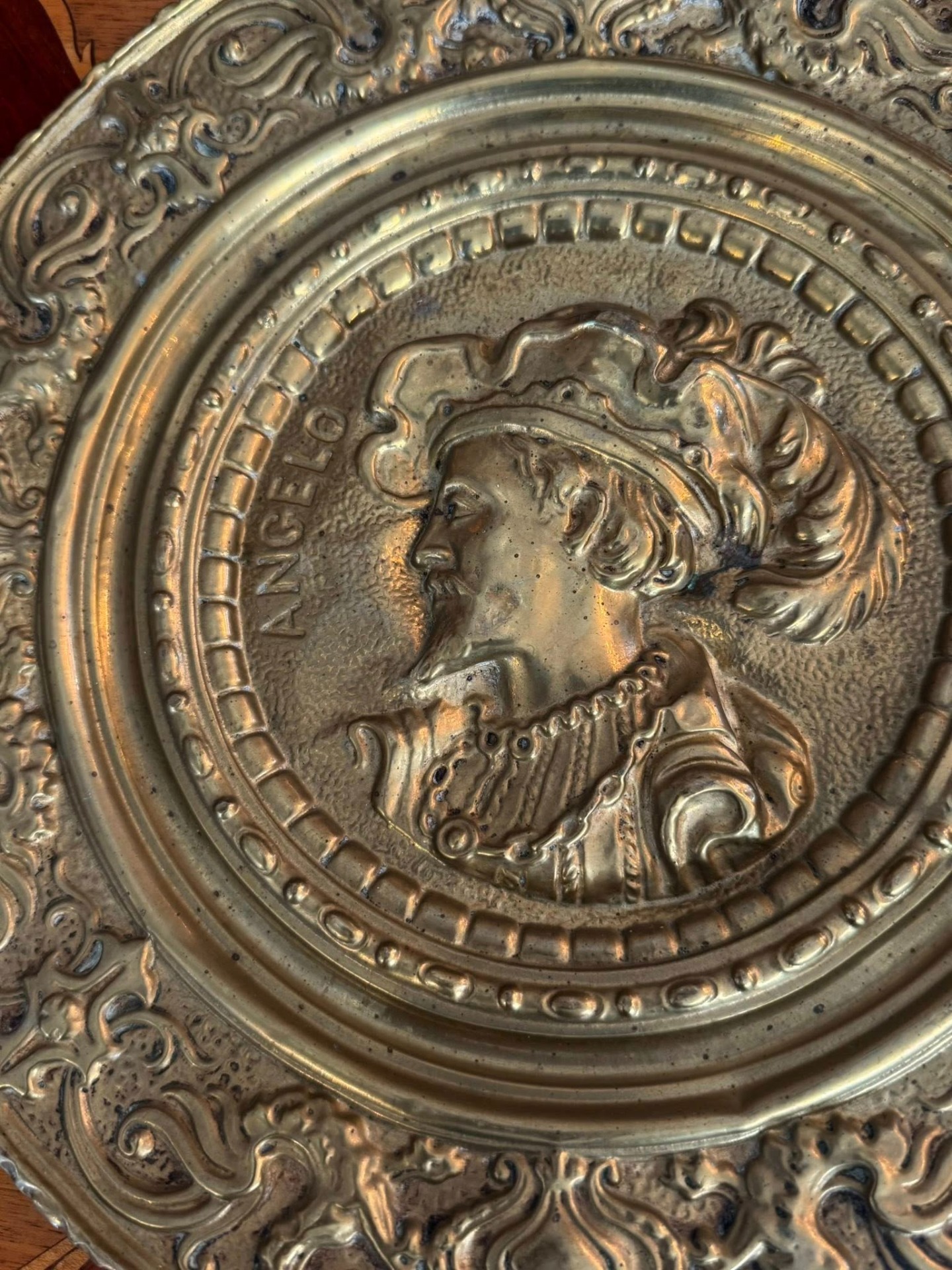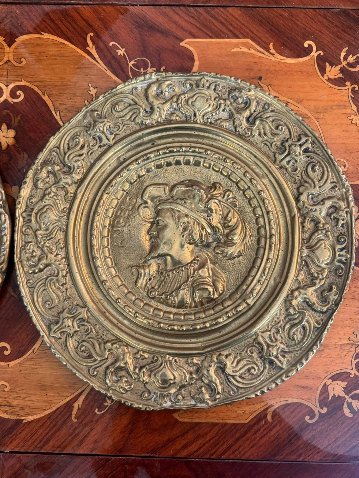 Set de platouri decorative pentru perete, deosebite, realizate din alamă, lucrate în relief (tehnică tip repoussé).