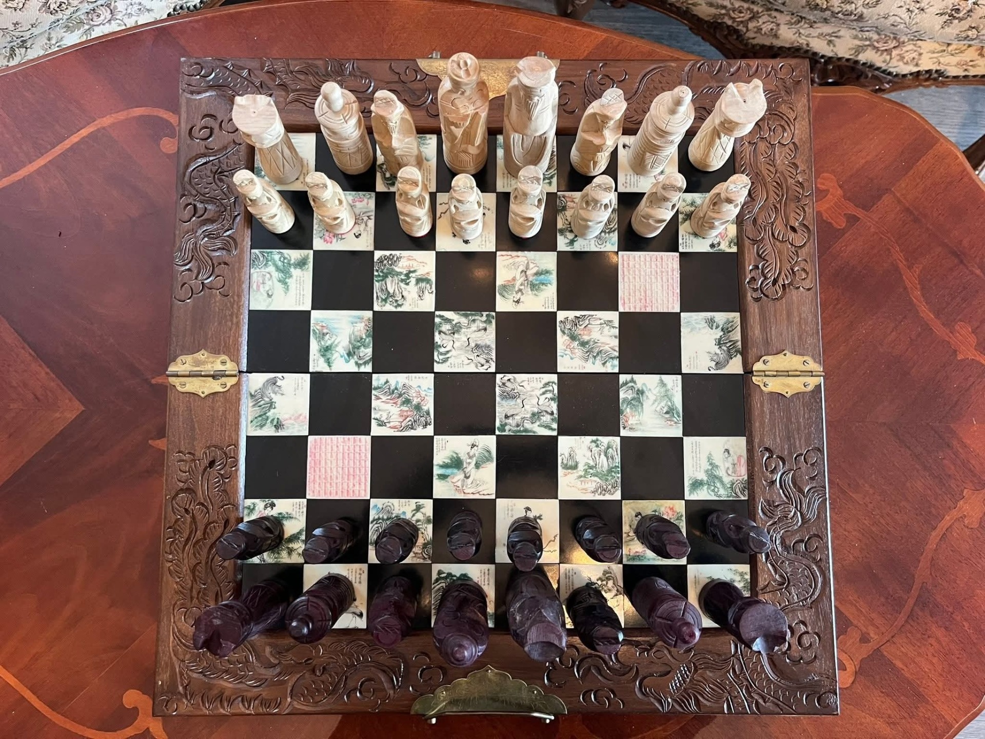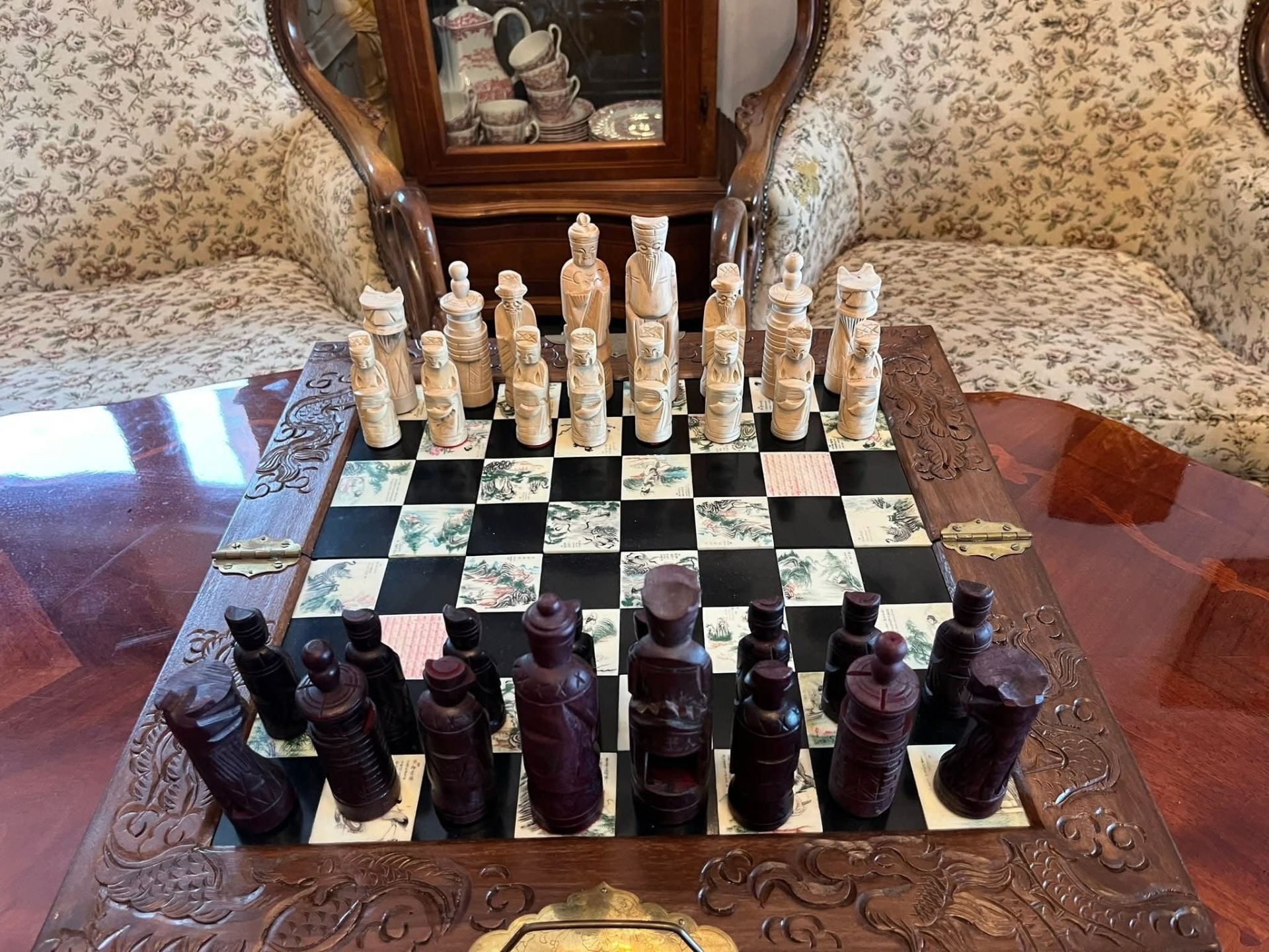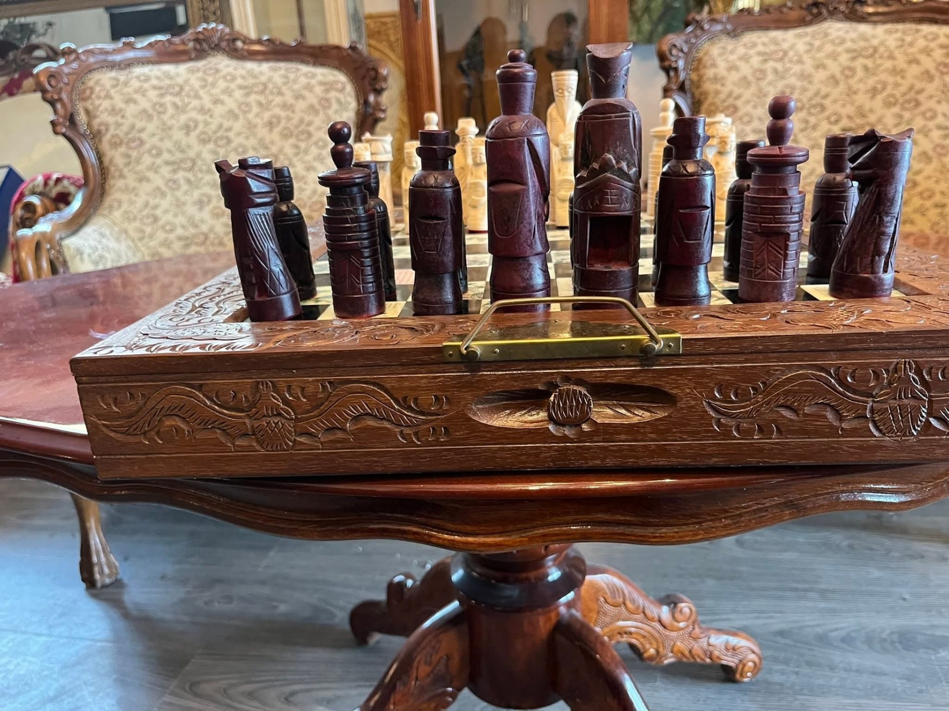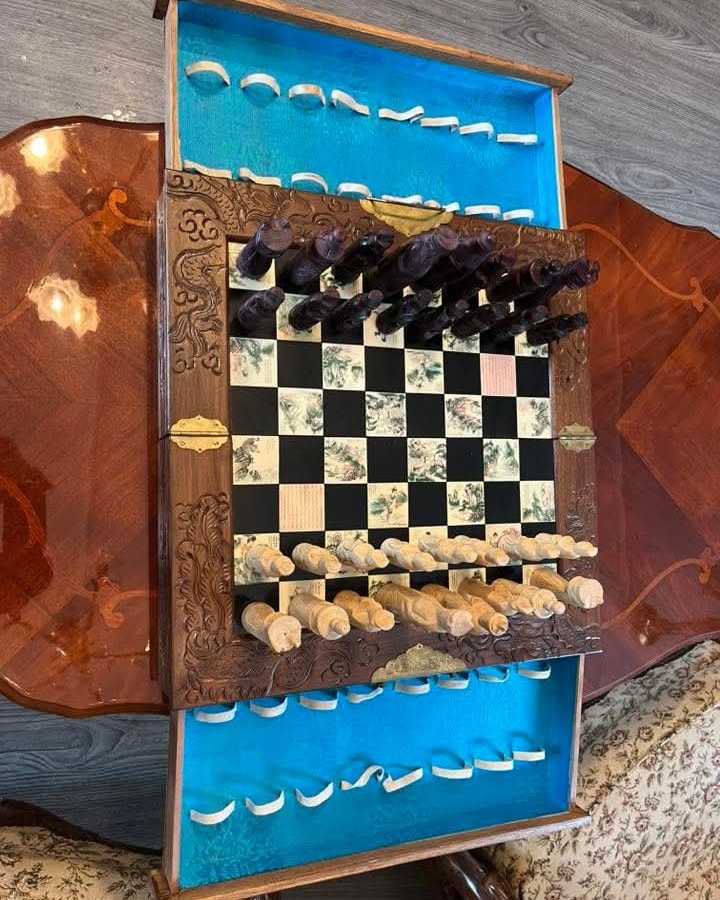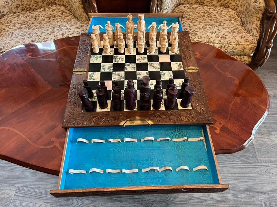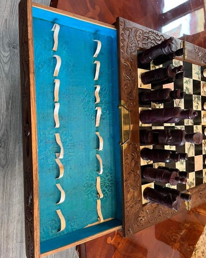 Set de șah de colecție – piese sculptate manual + cutie din lemn masiv
