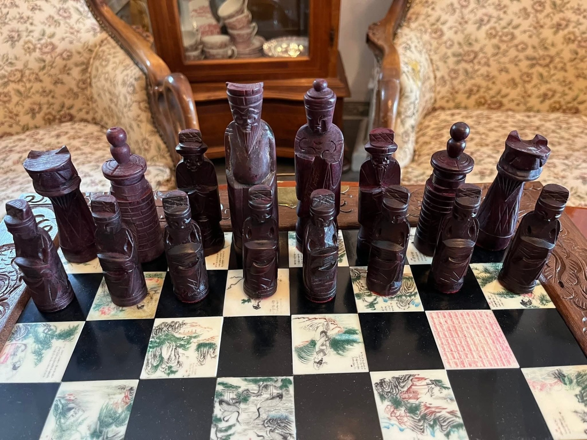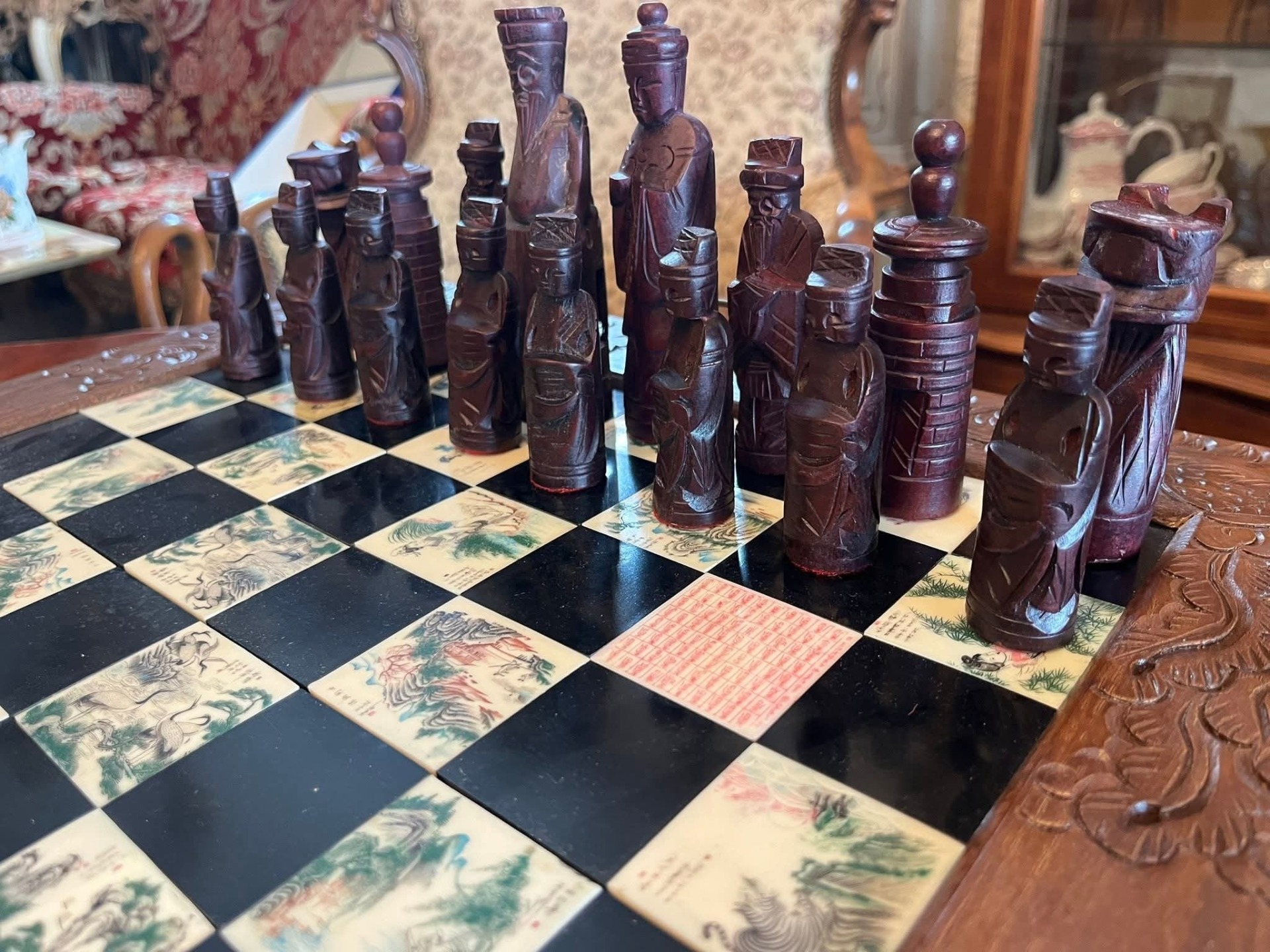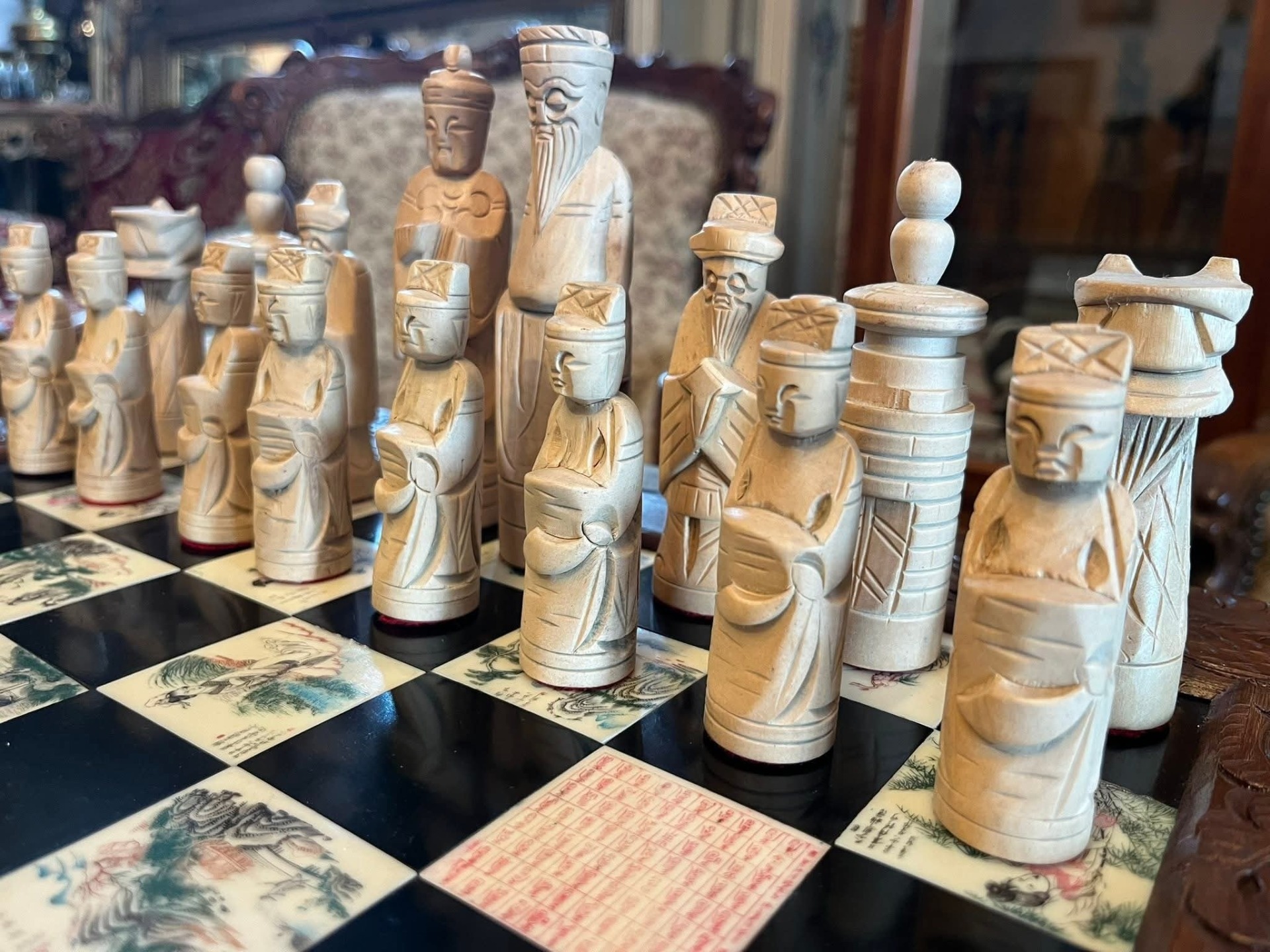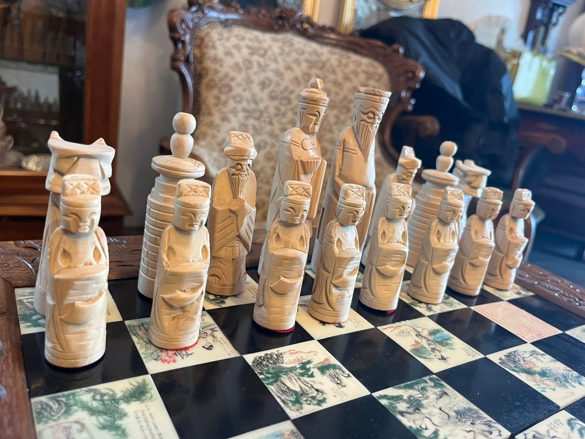 Piese de șah sculptate manual, reprezentând personaje stilizate (tematică orientală/asiatică)