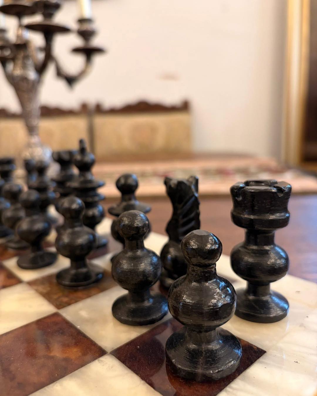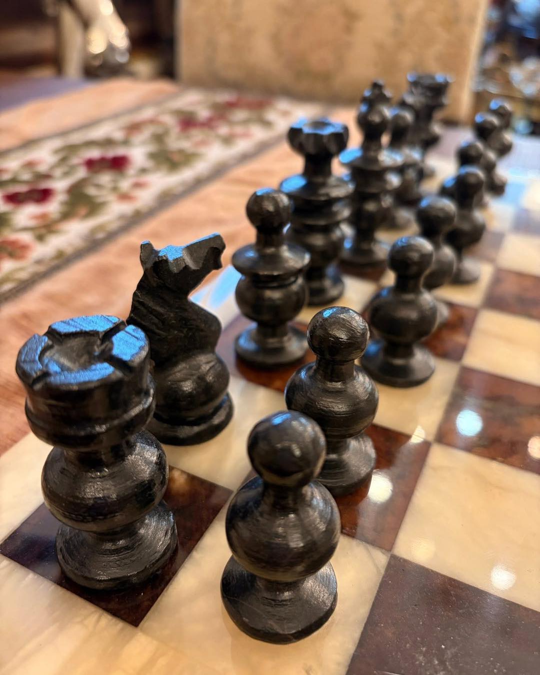 Set de șah deosebit, realizat din piatră naturală (nu plastic), cu piese sculptate și tablă masivă în două nuanțe contrastante. Piesele albe sunt din onyx deschis, iar cele negre din piatră închisă, cu un finisaj lucios, foarte elegant.