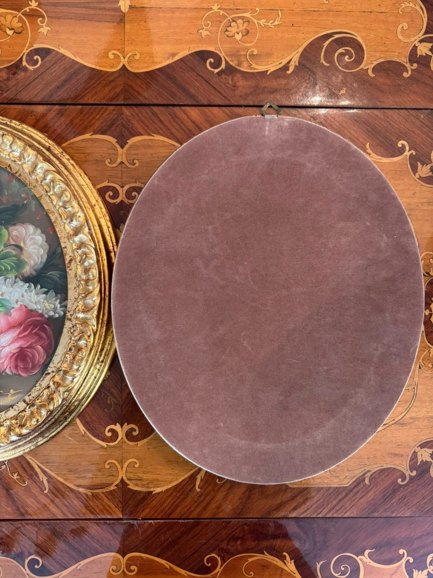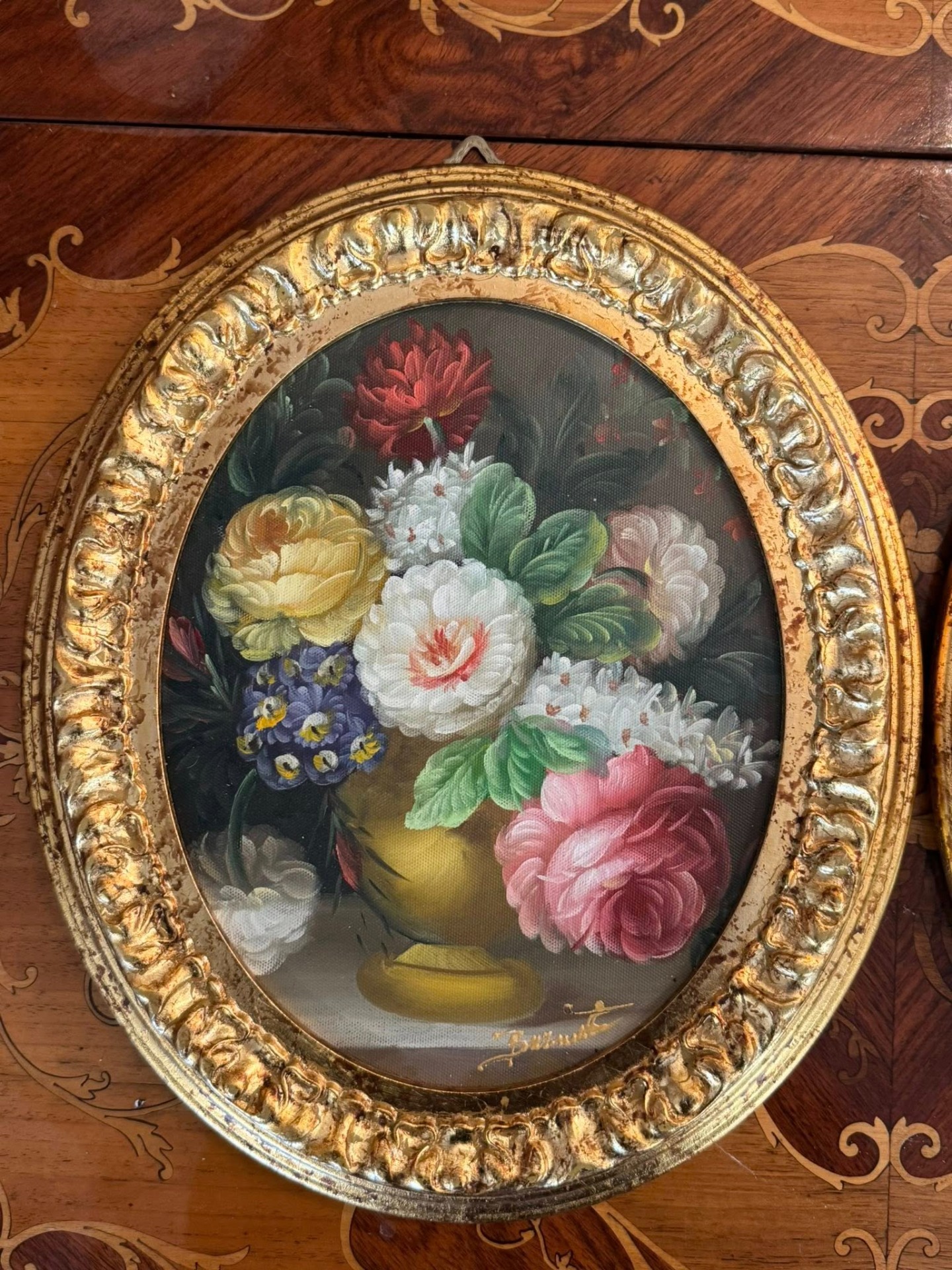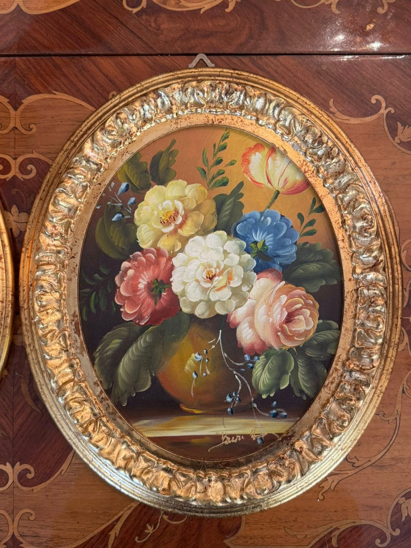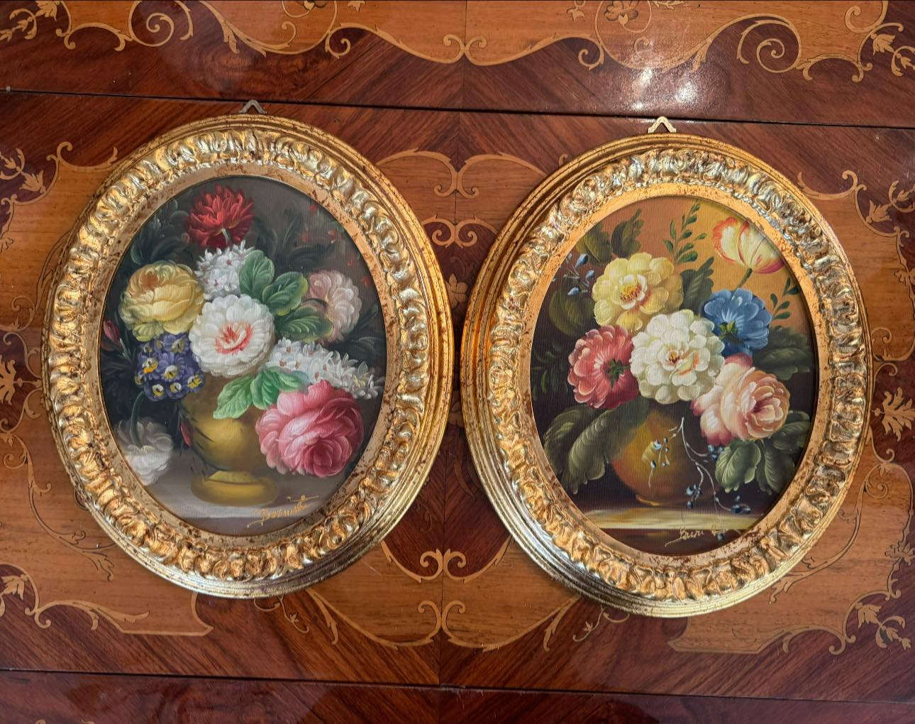 Set de tablouri decorative în format oval, realizate cu motiv floral, montate în rame aurii bogat ornamentate, în stil Baroc. (Italia, cca 1960)