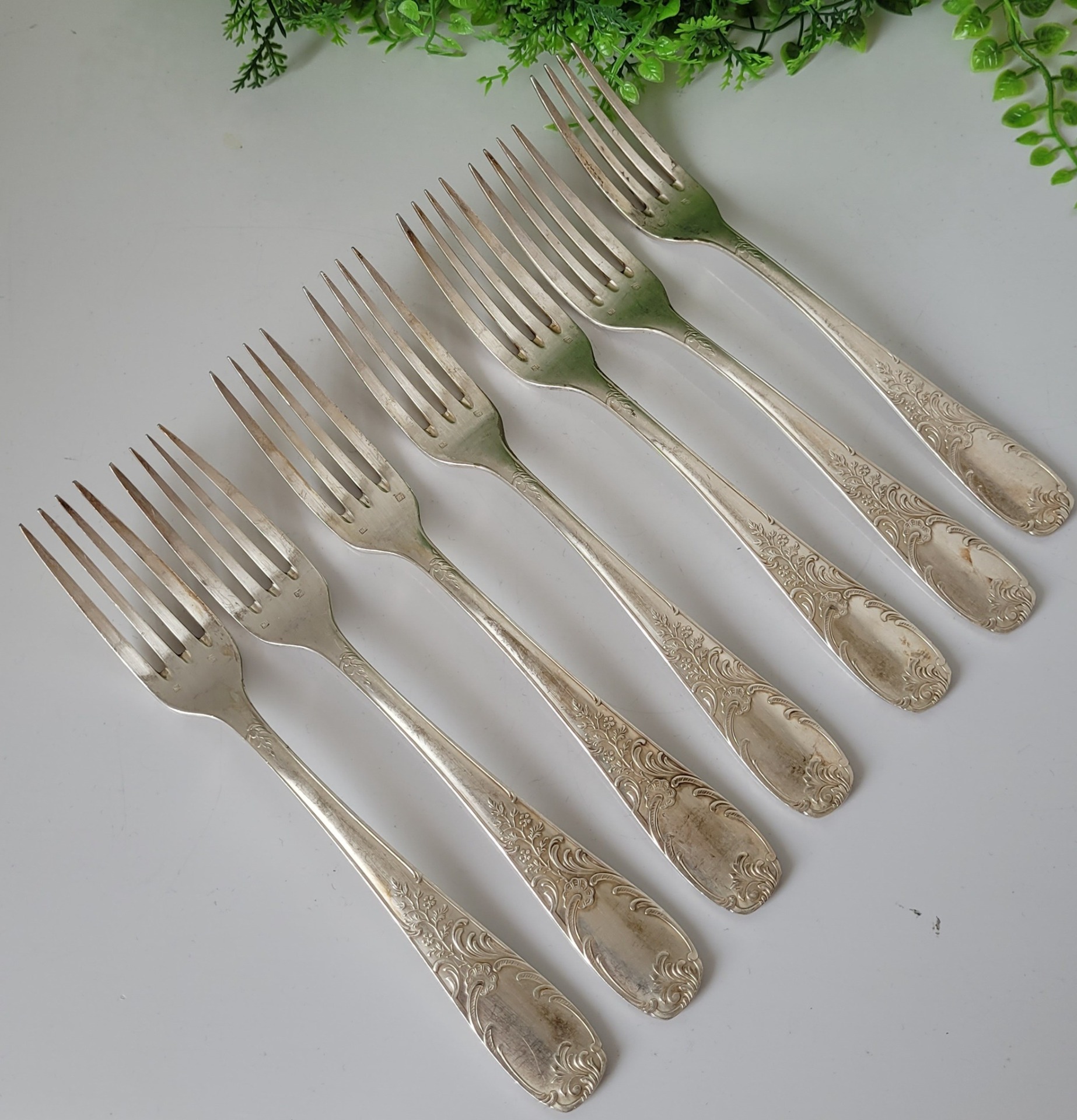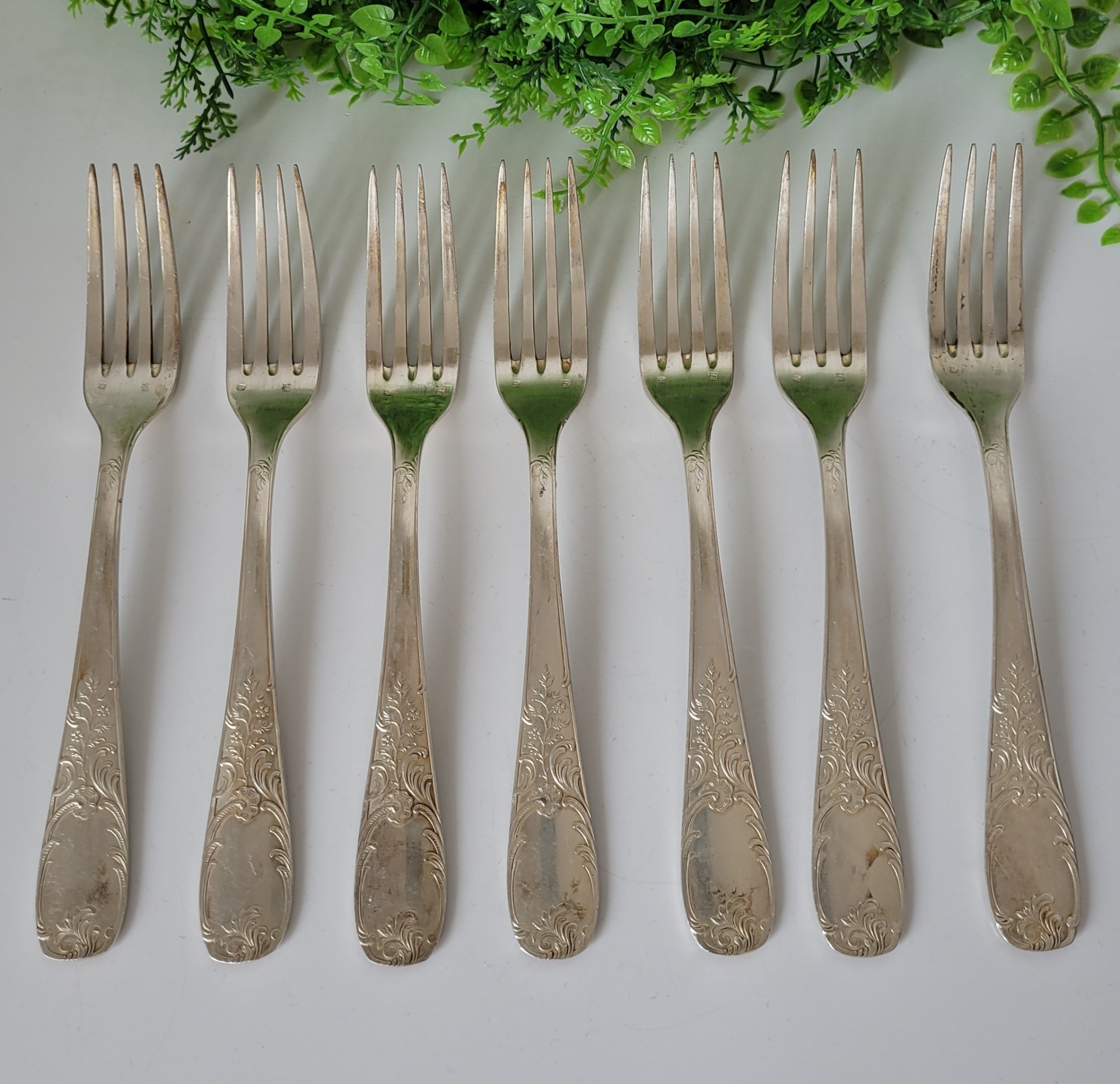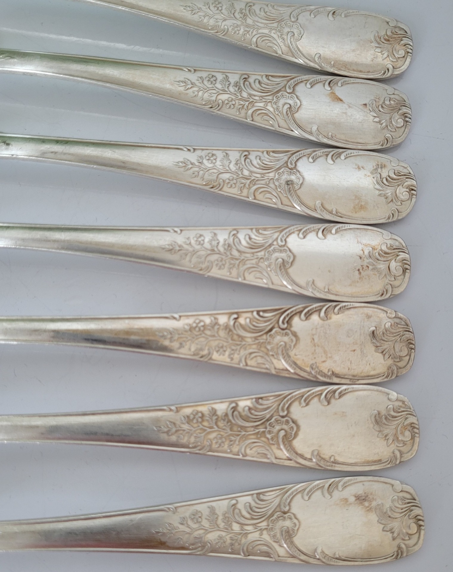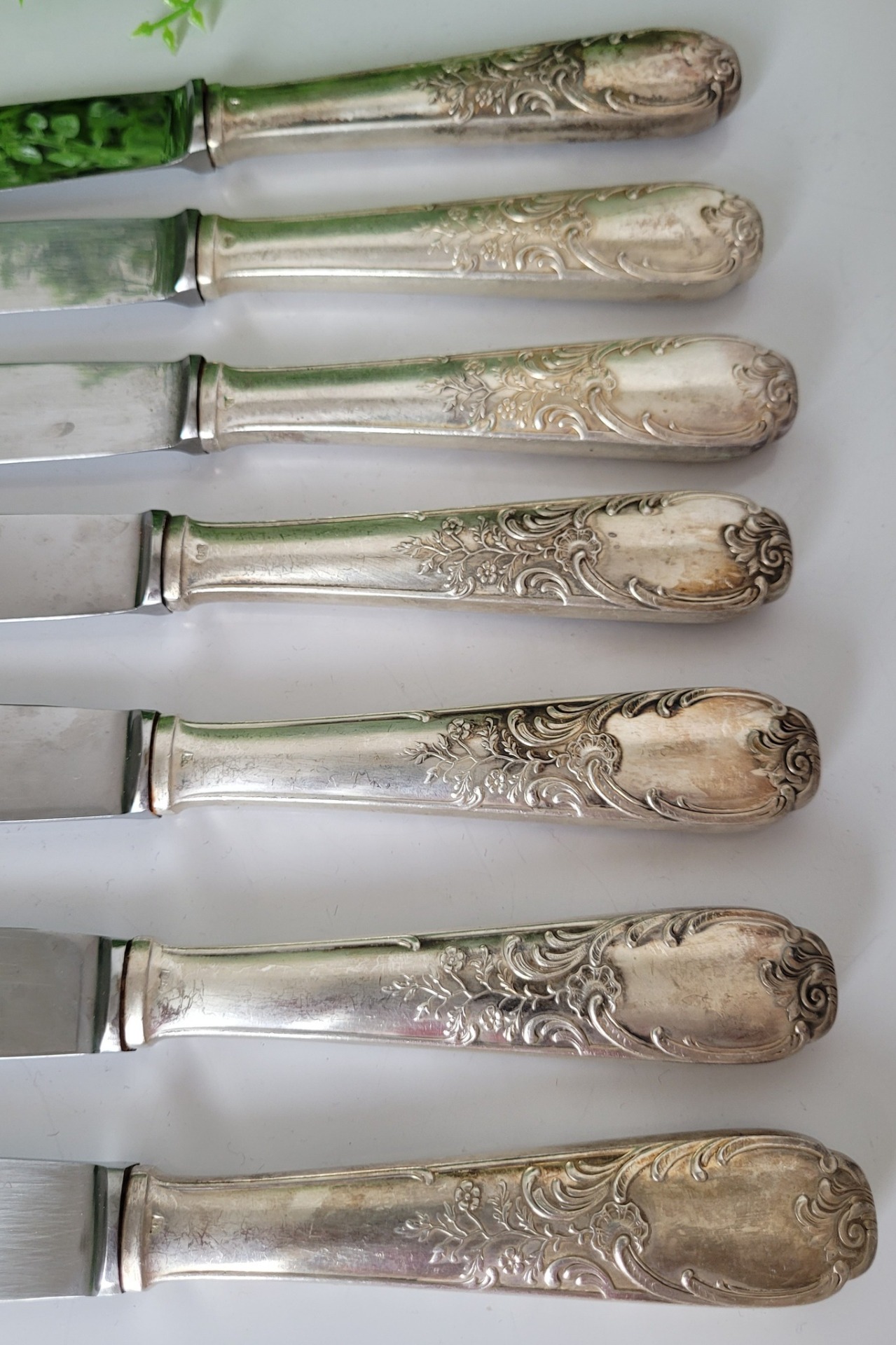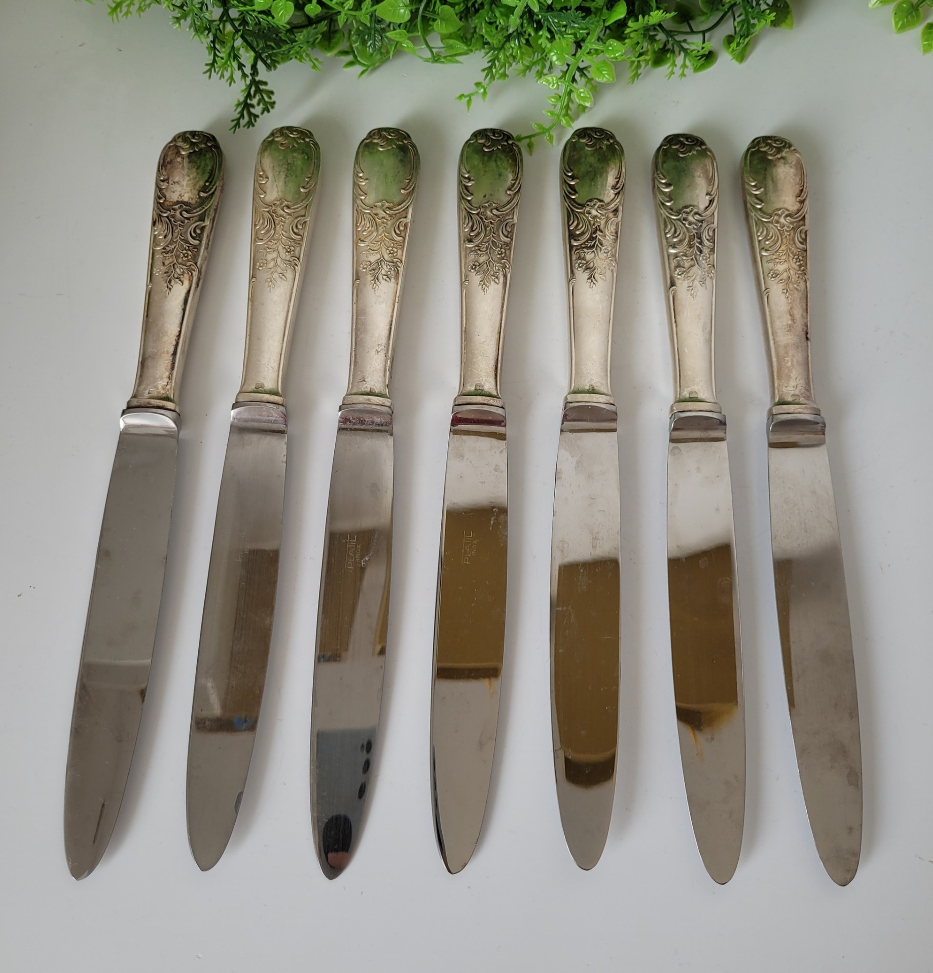 Set de tacâmuri Art Nouveau, pentru fel principal, compus din 7 cuțite cu mâner din metal argintat și lamă din oțel inoxidabil și 7 furculițe din metal argintat