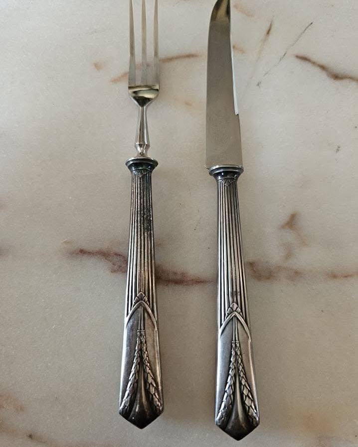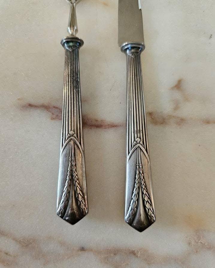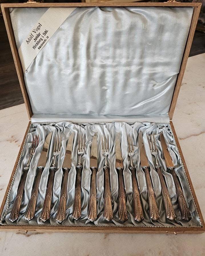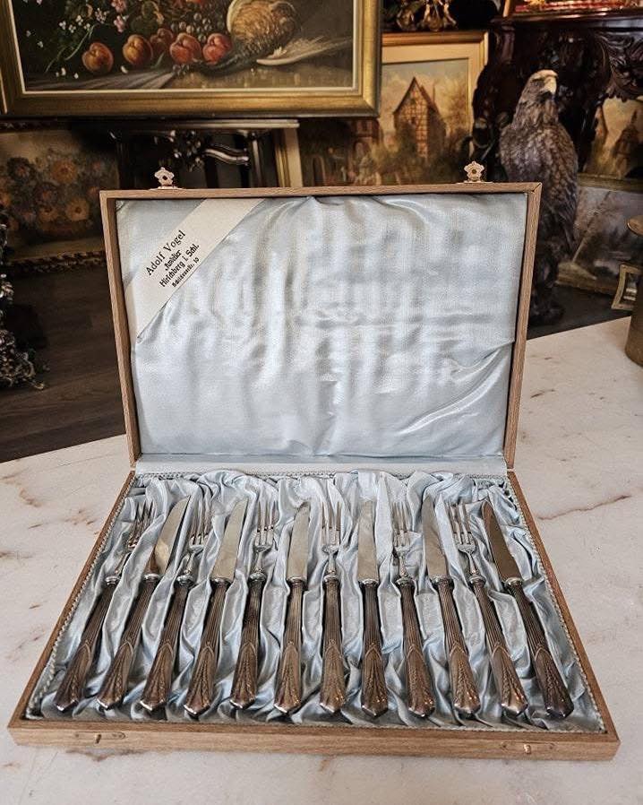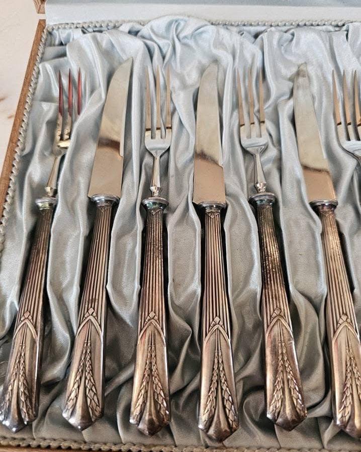 Setul este compus din 12 piese – 6 cuțite (17cm lungime)și 6 furculițe((16cm lungime)– frumos păstrate în cutia originală căptușită cu satin.