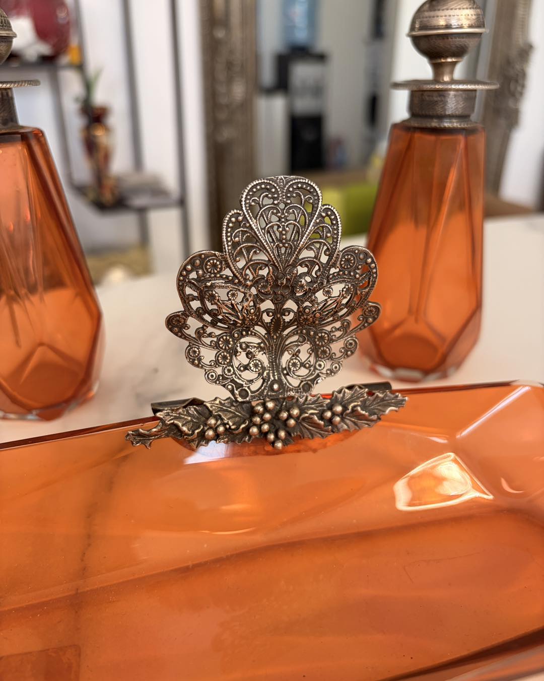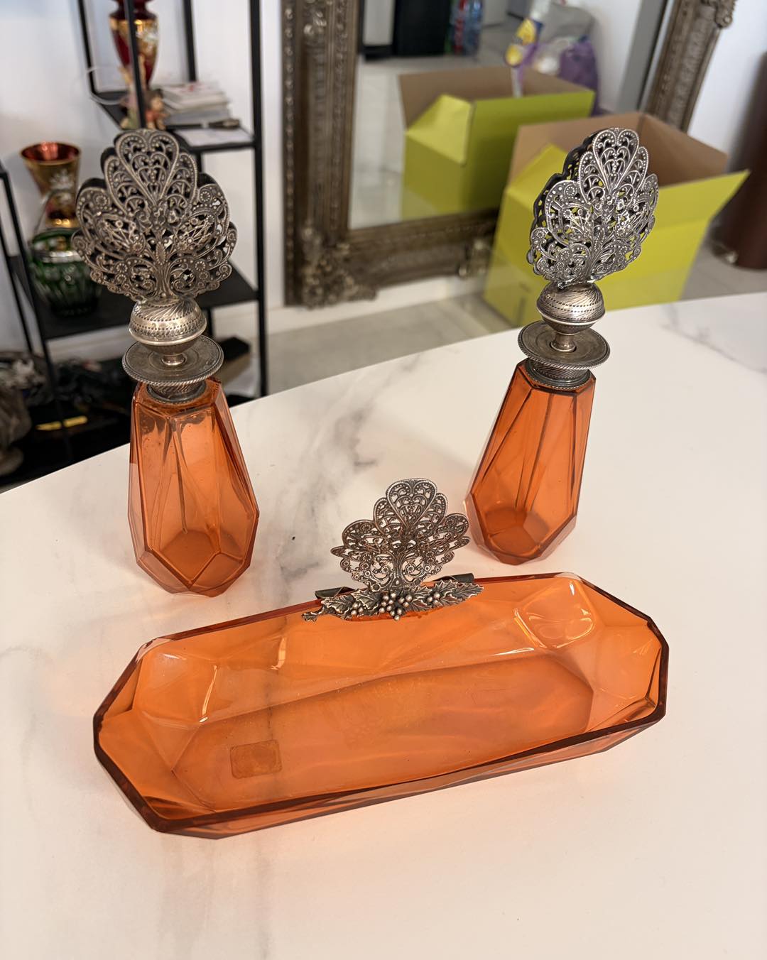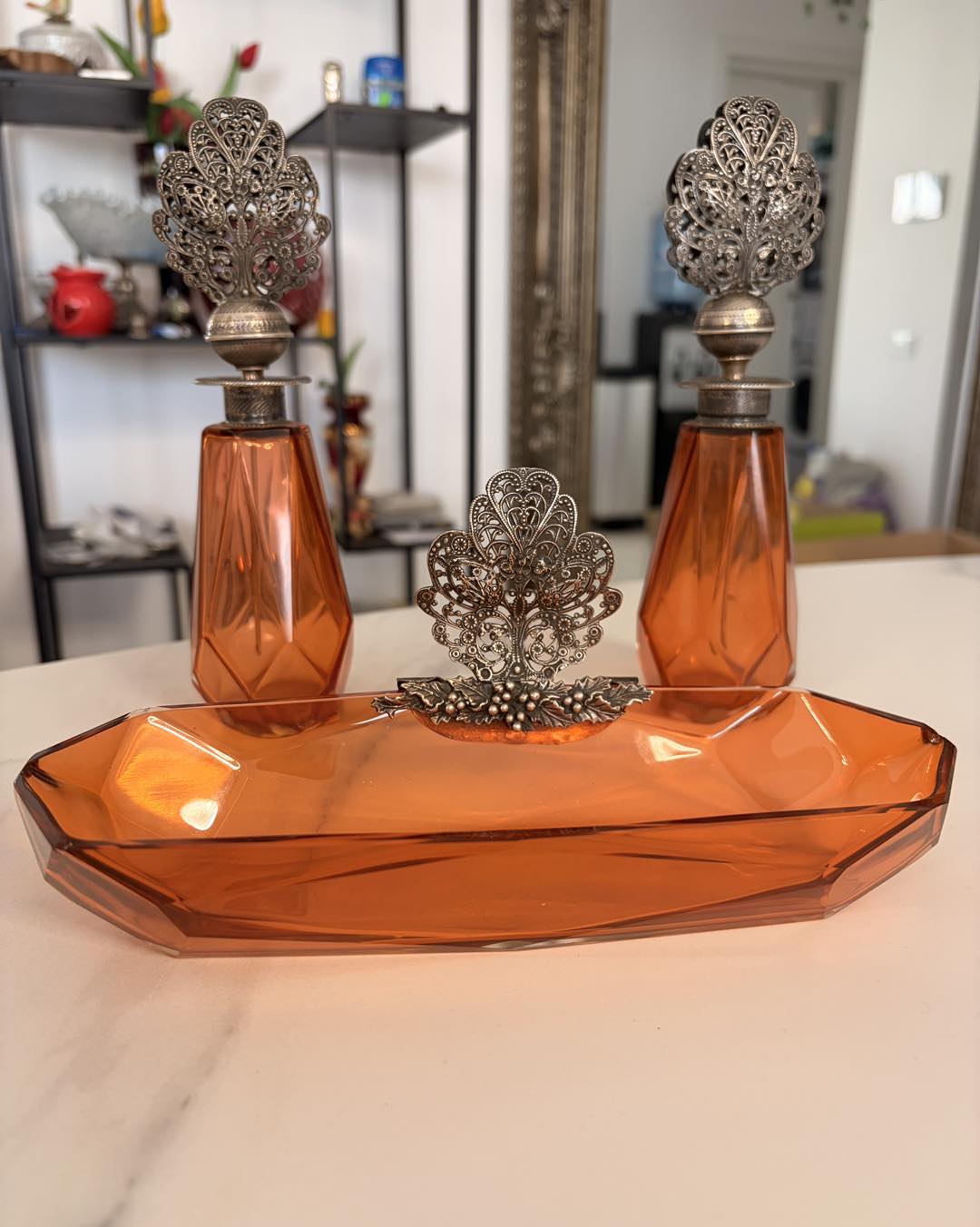 Măiestrie în Filigran: Capacele celor două parfumiere și ornamentul tăvii sunt lucrate într-un filigran manual extrem de fin, o tehnică artizanală care astăzi se regăsește tot mai rar