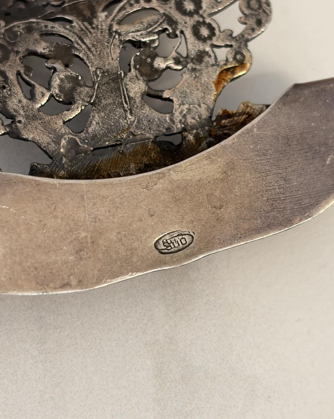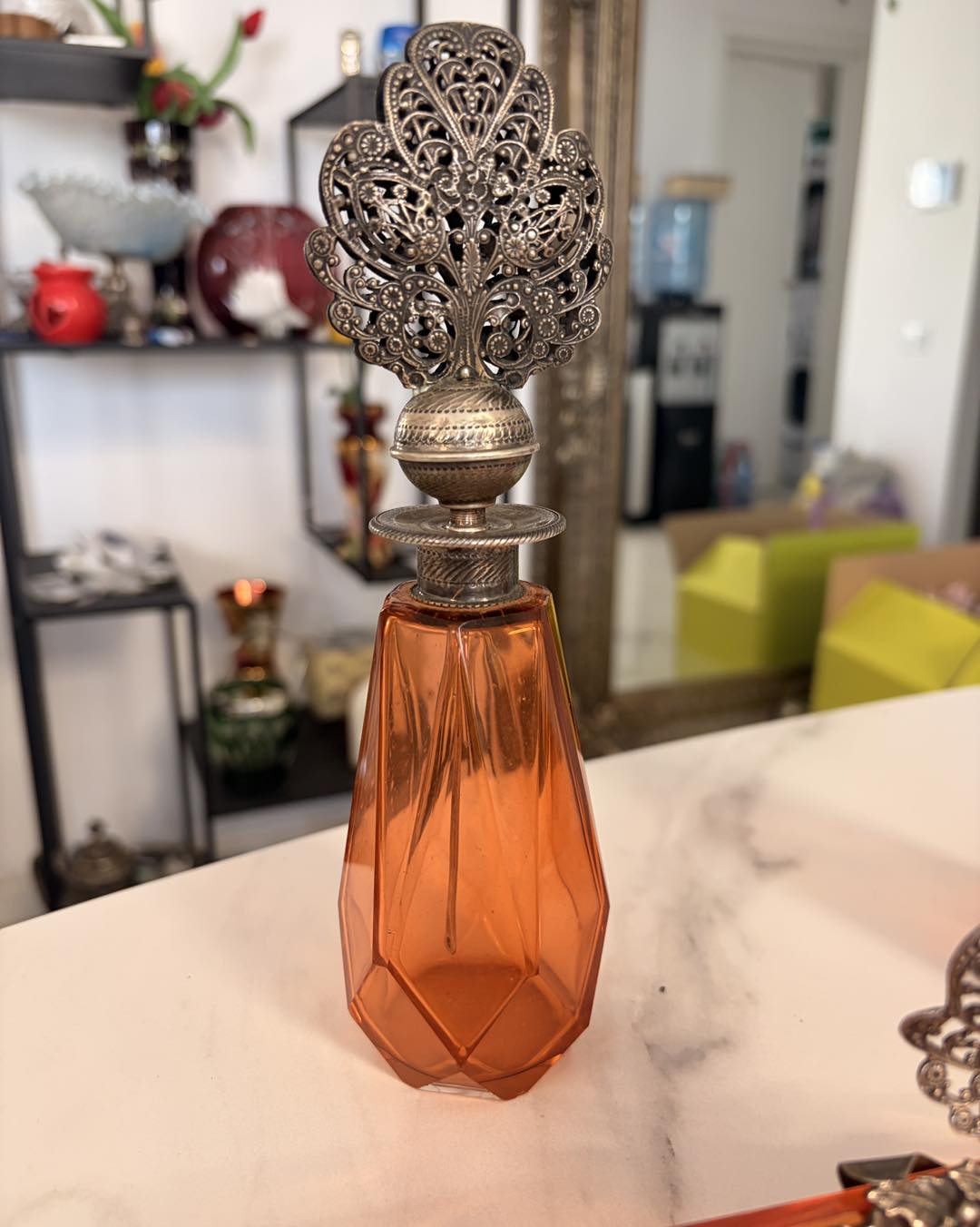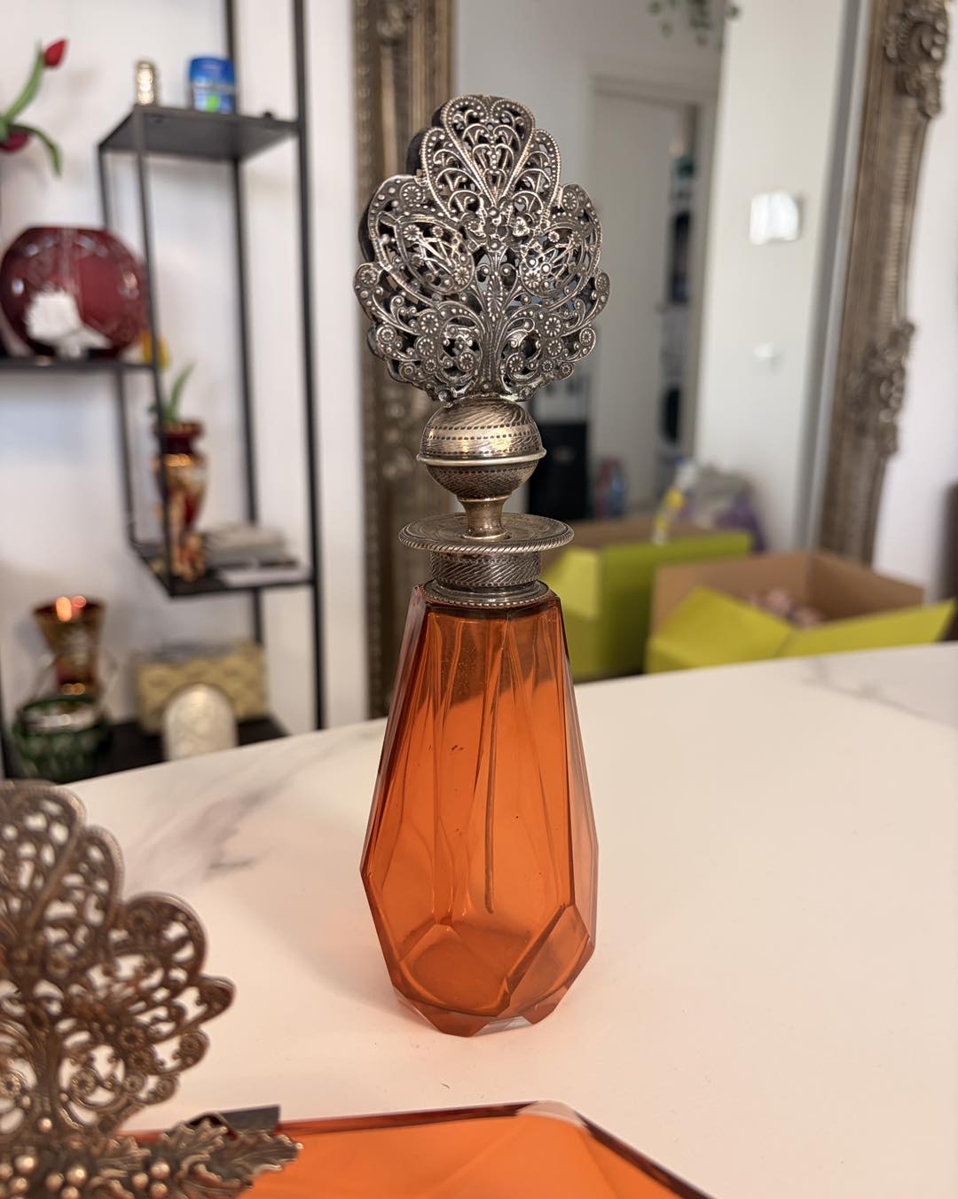 Măiestrie în Filigran: Capacele celor două parfumiere și ornamentul tăvii sunt lucrate într-un filigran manual extrem de fin, o tehnică artizanală care astăzi se regăsește tot mai rar