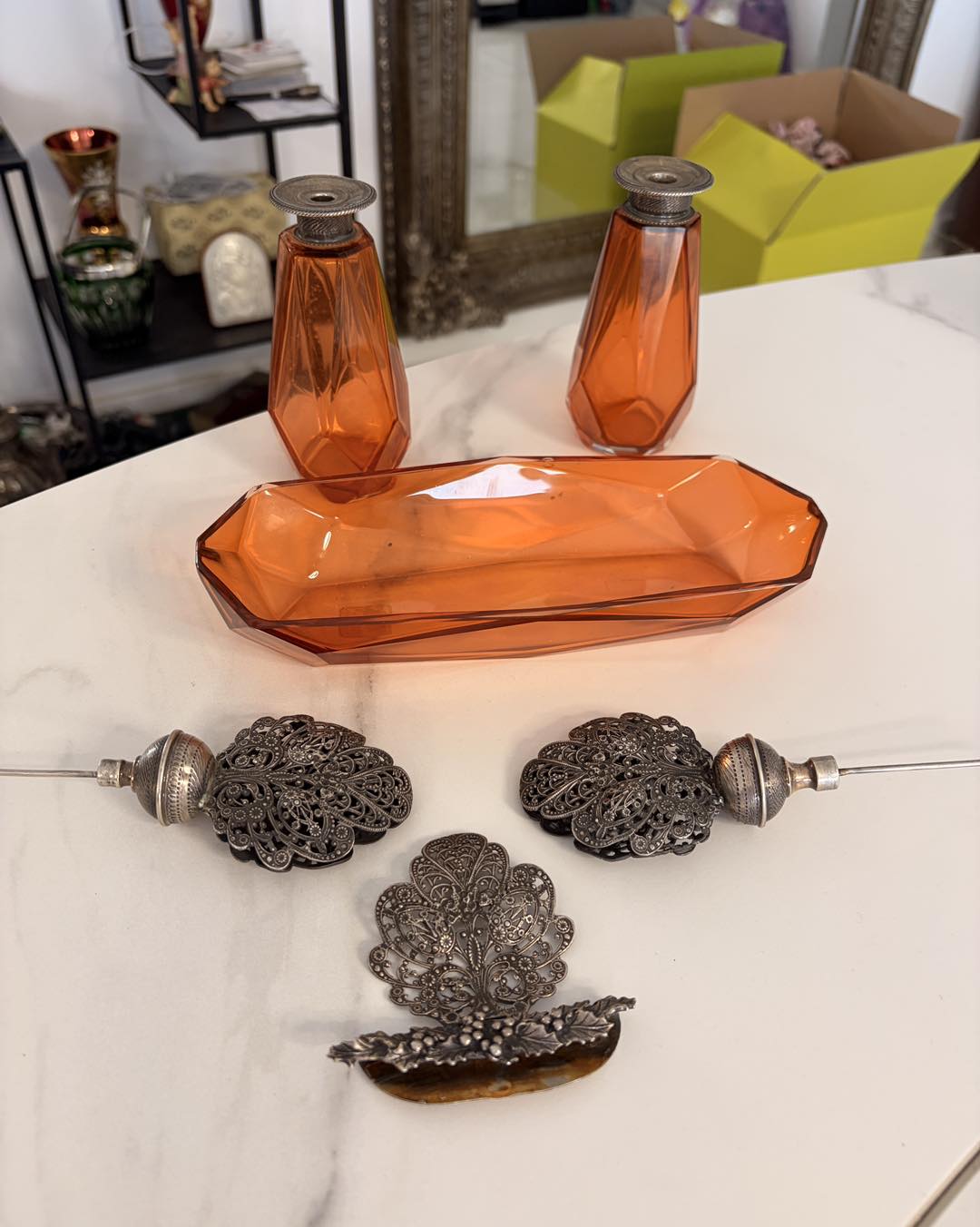 Set de Toaletă Imperial Art Deco – Argint 800 și Cristal Chihlimbar