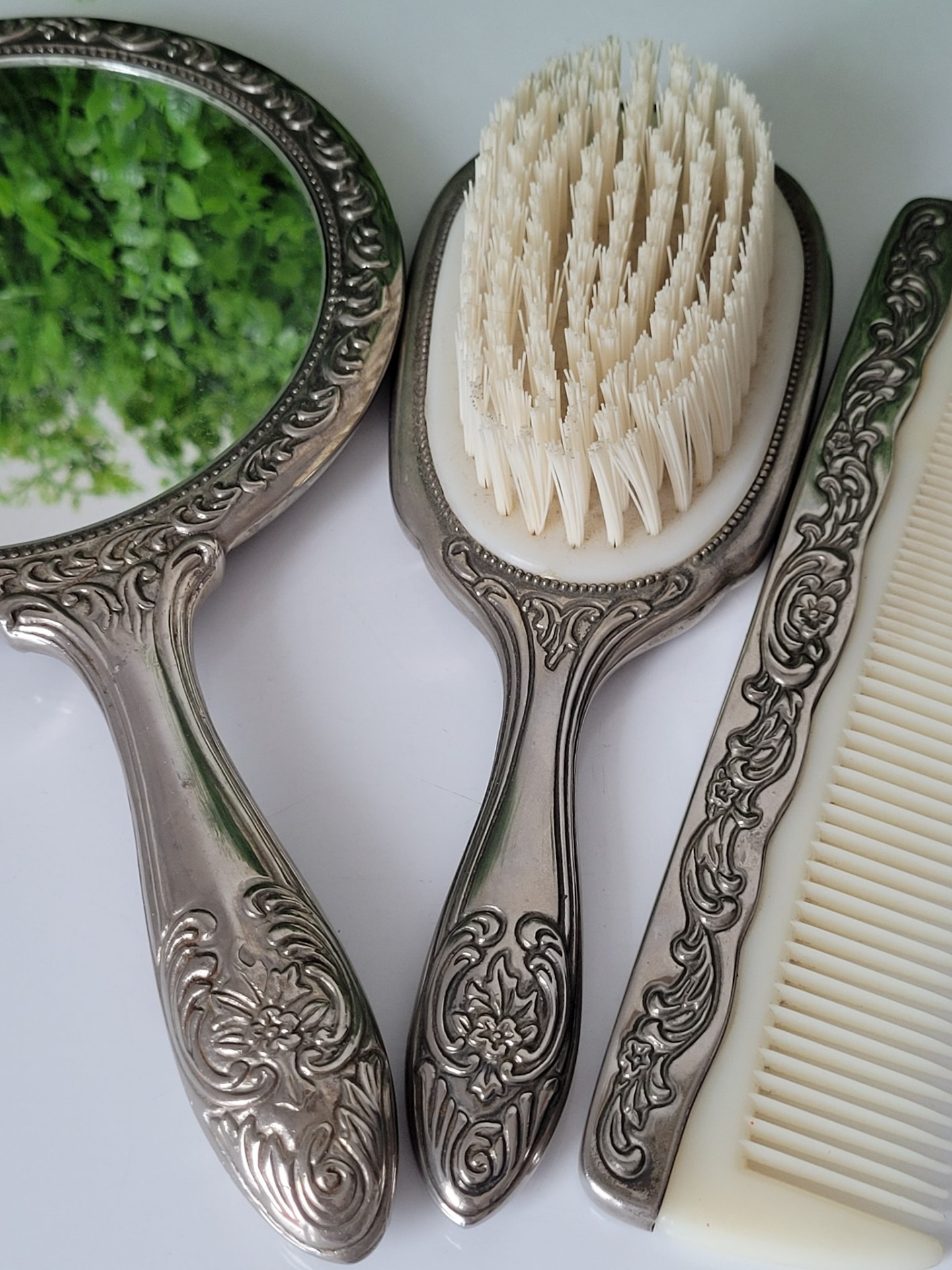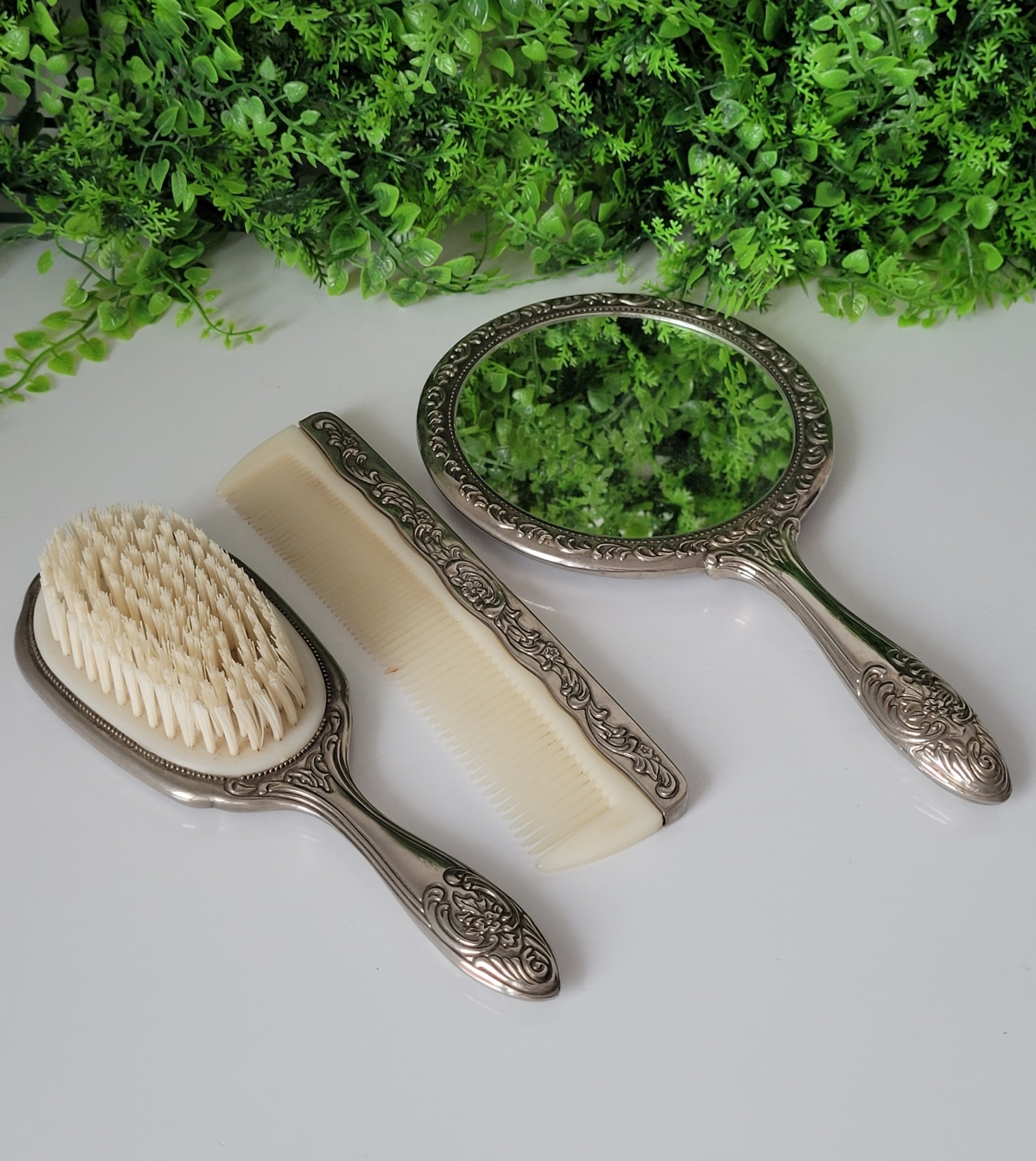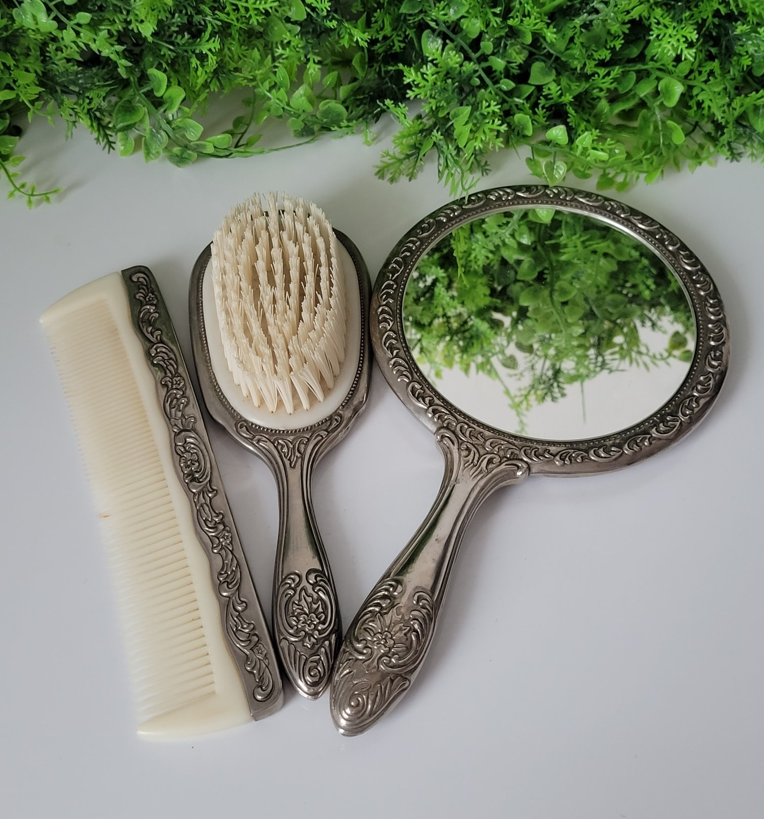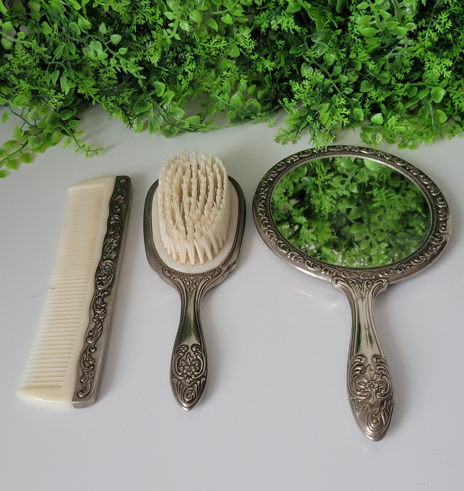 Set de toaletă vintage, în stil victorian, compus din oglindă, perie și pieptene, din metal argintat, cu design clasic și elegant, decorat cu motive florale în