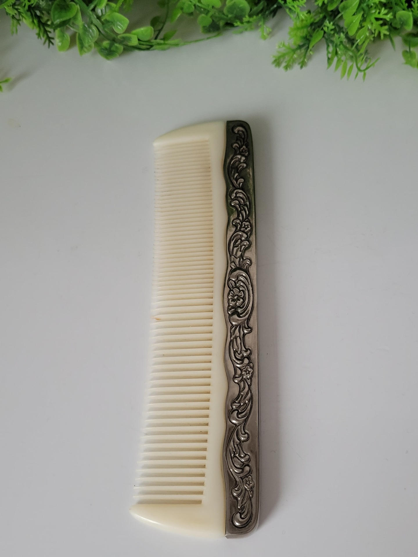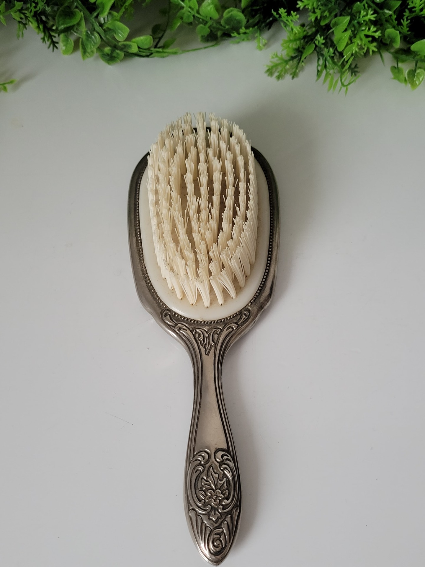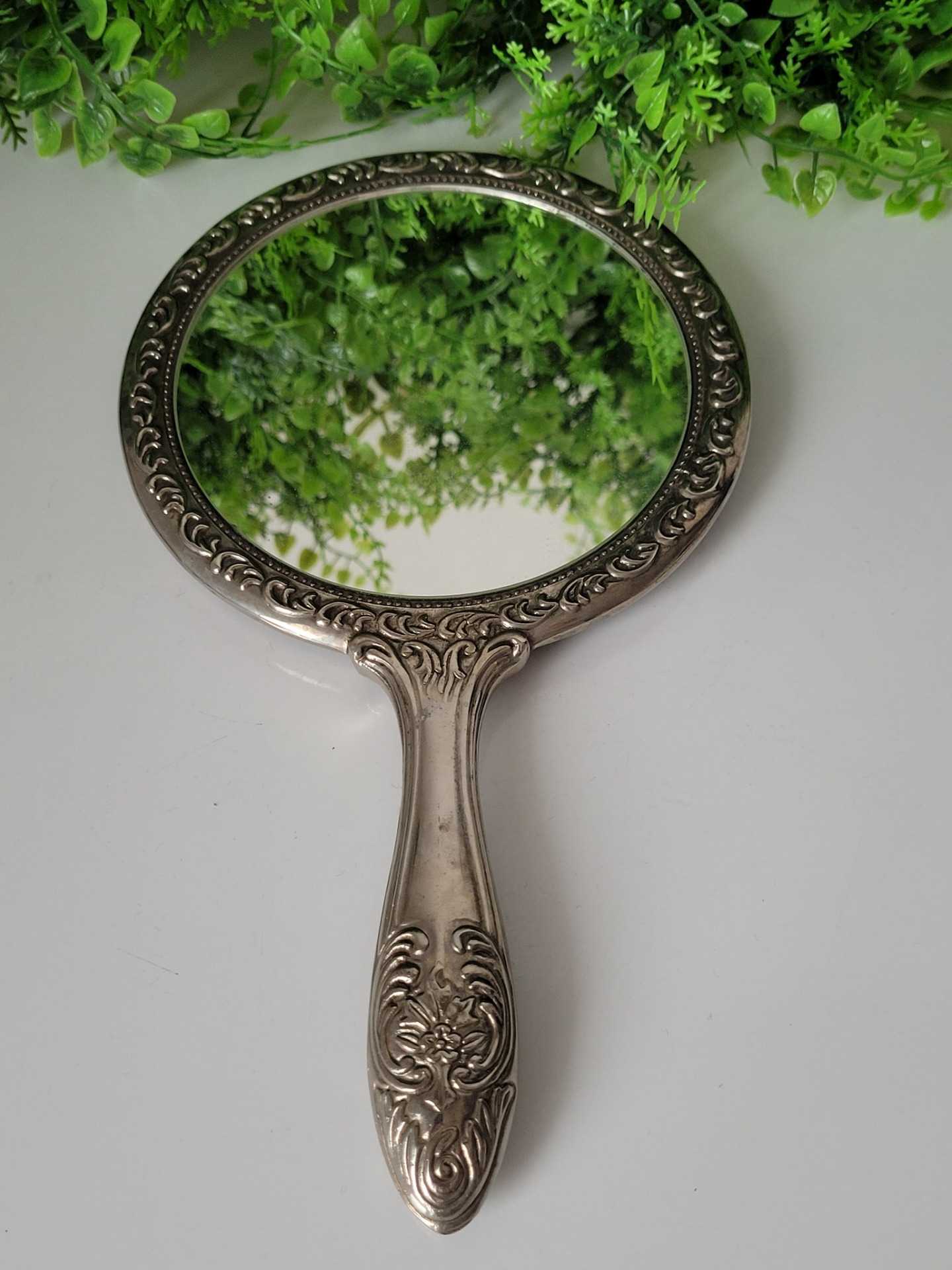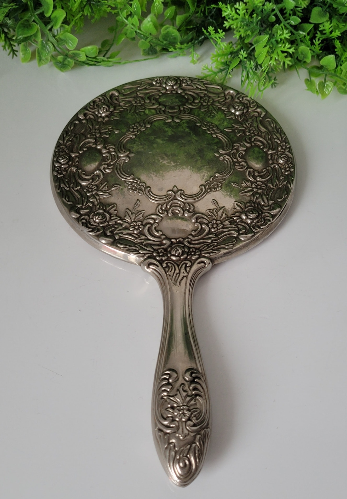 Set de toaletă vintage, în stil victorian, compus din oglindă, perie și pieptene, din metal argintat, cu design clasic și elegant, decorat cu motive florale în