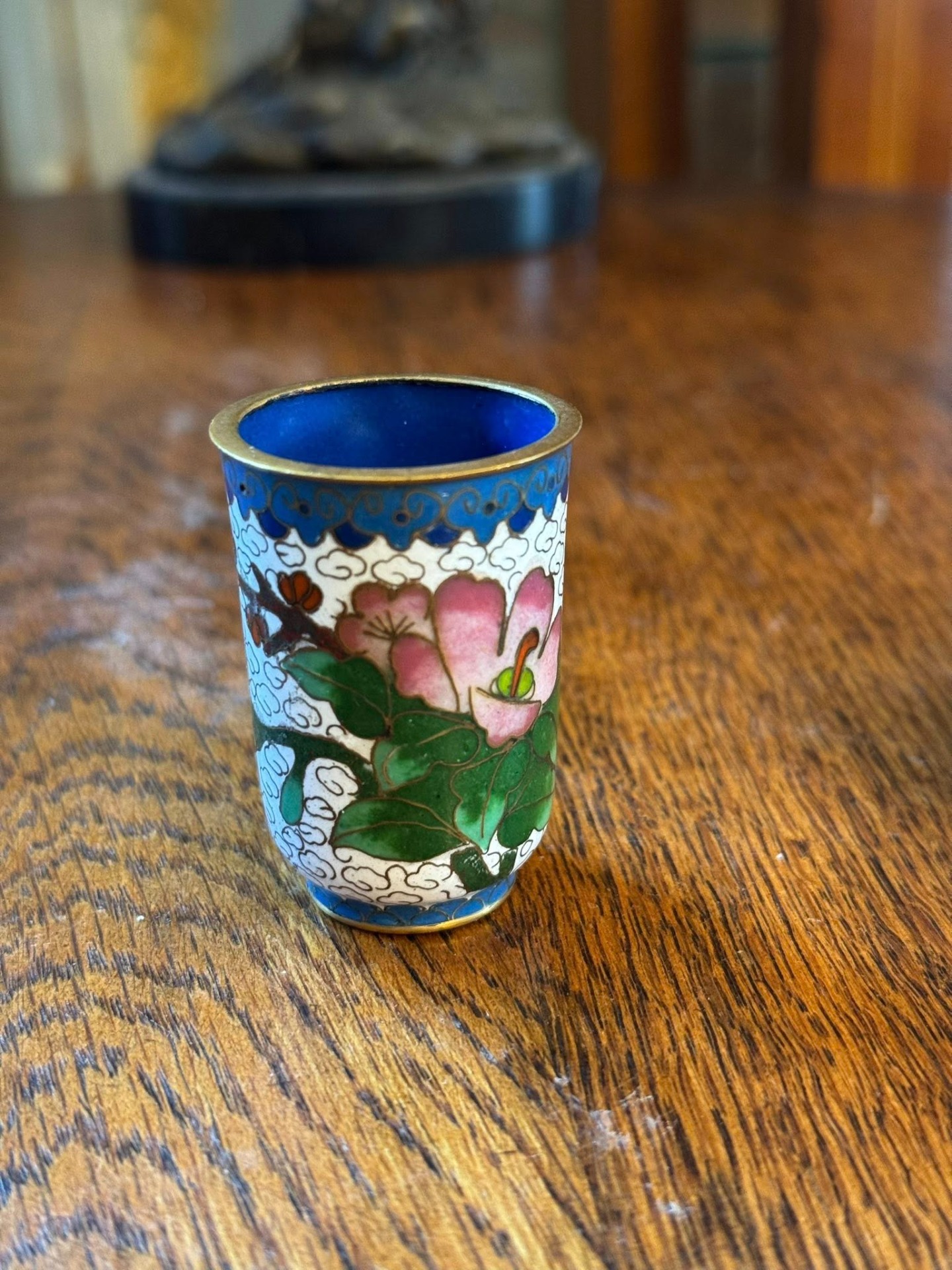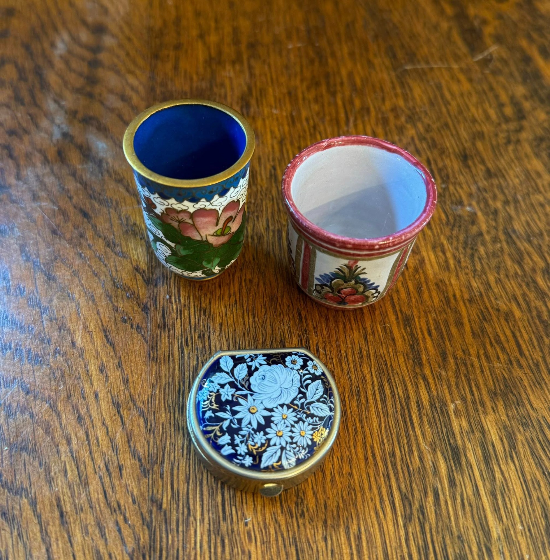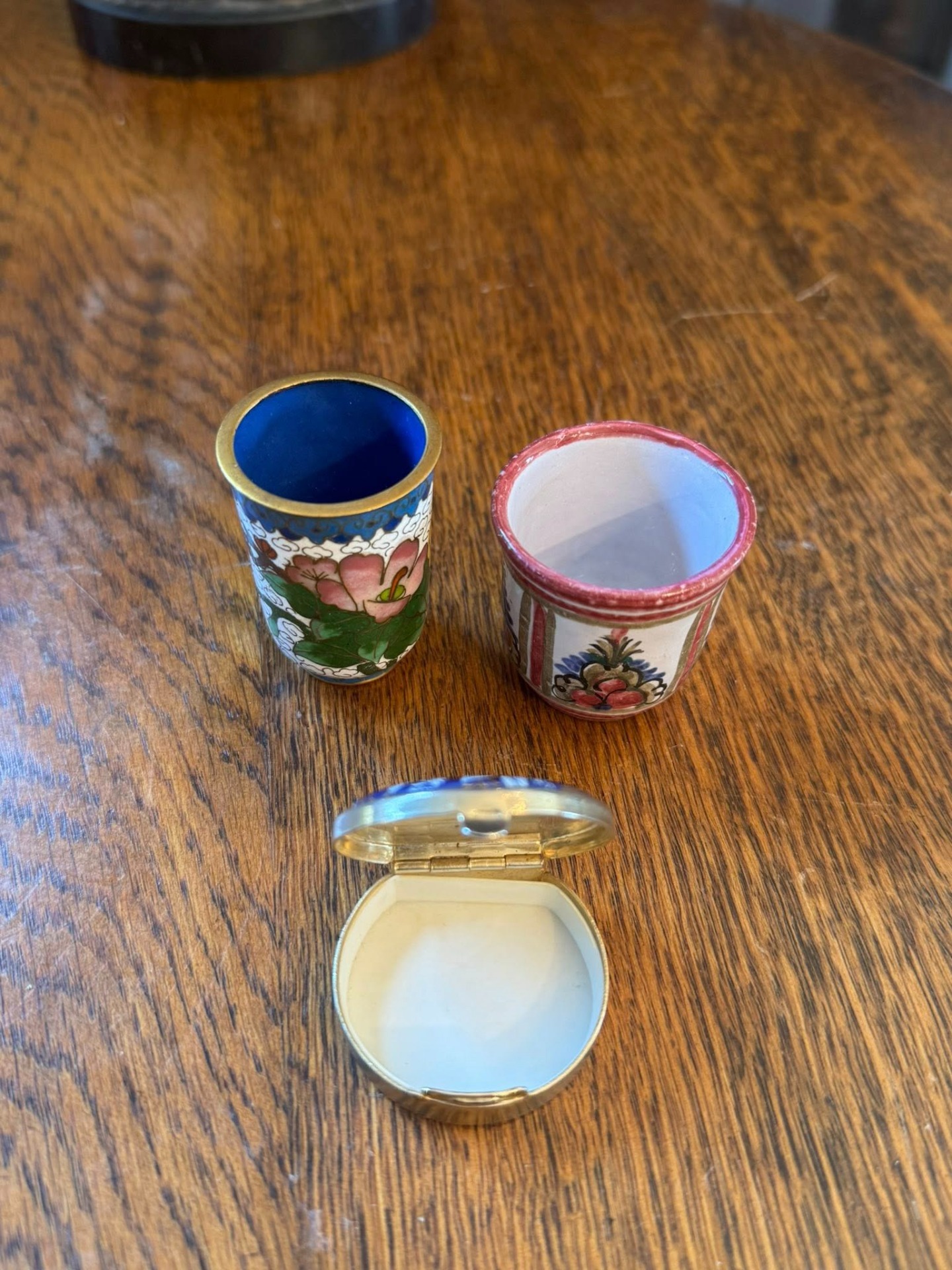 Set decorativ format din:păhărel din email Cloisonné; păhărel din porțelan pictat și mini cutiuța(pentru pastile (pill box) sau pentru bijuterii mici)