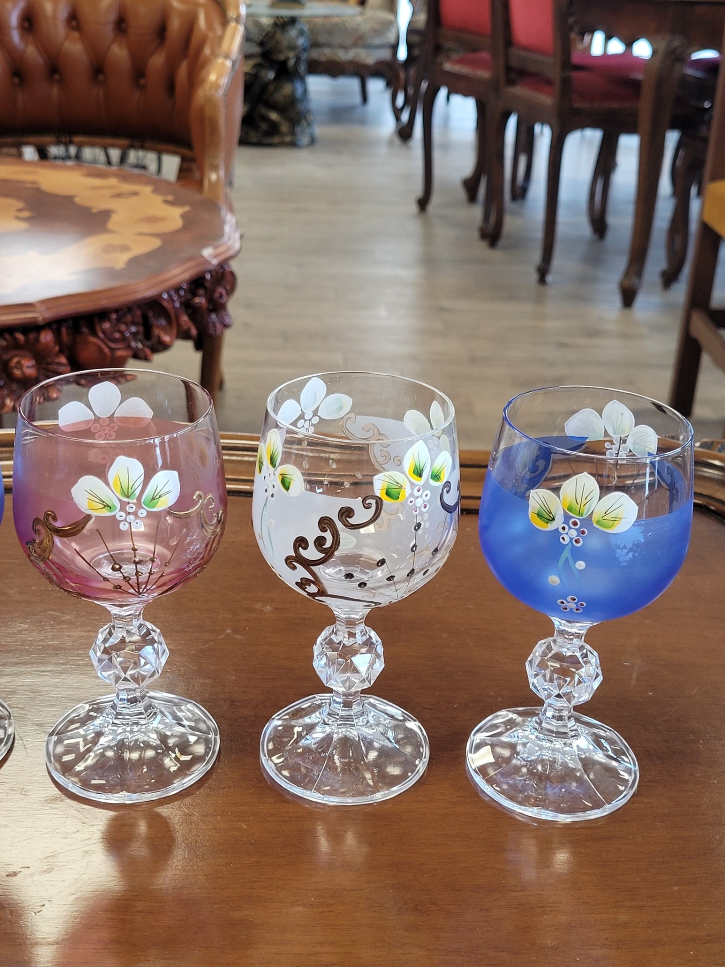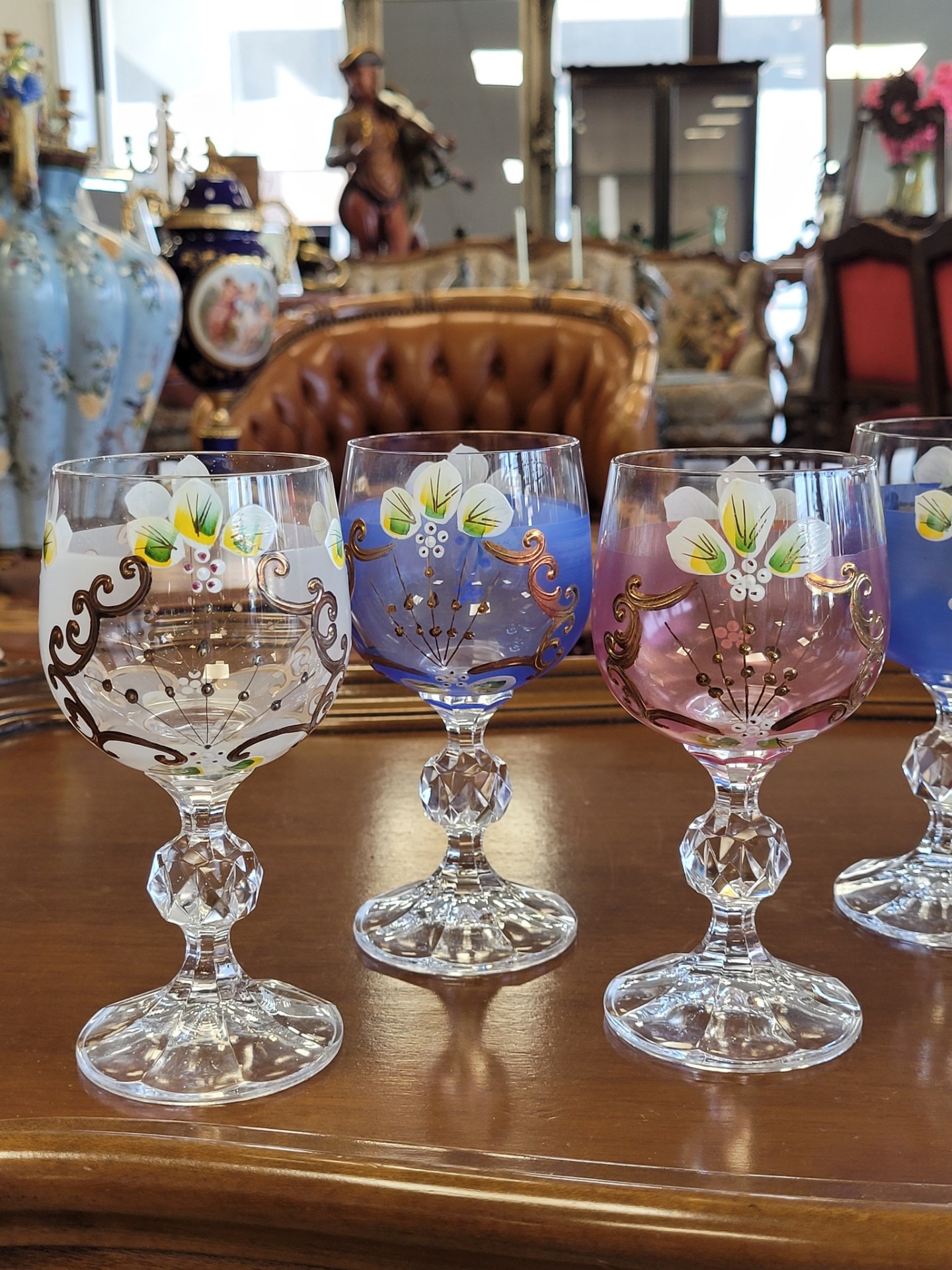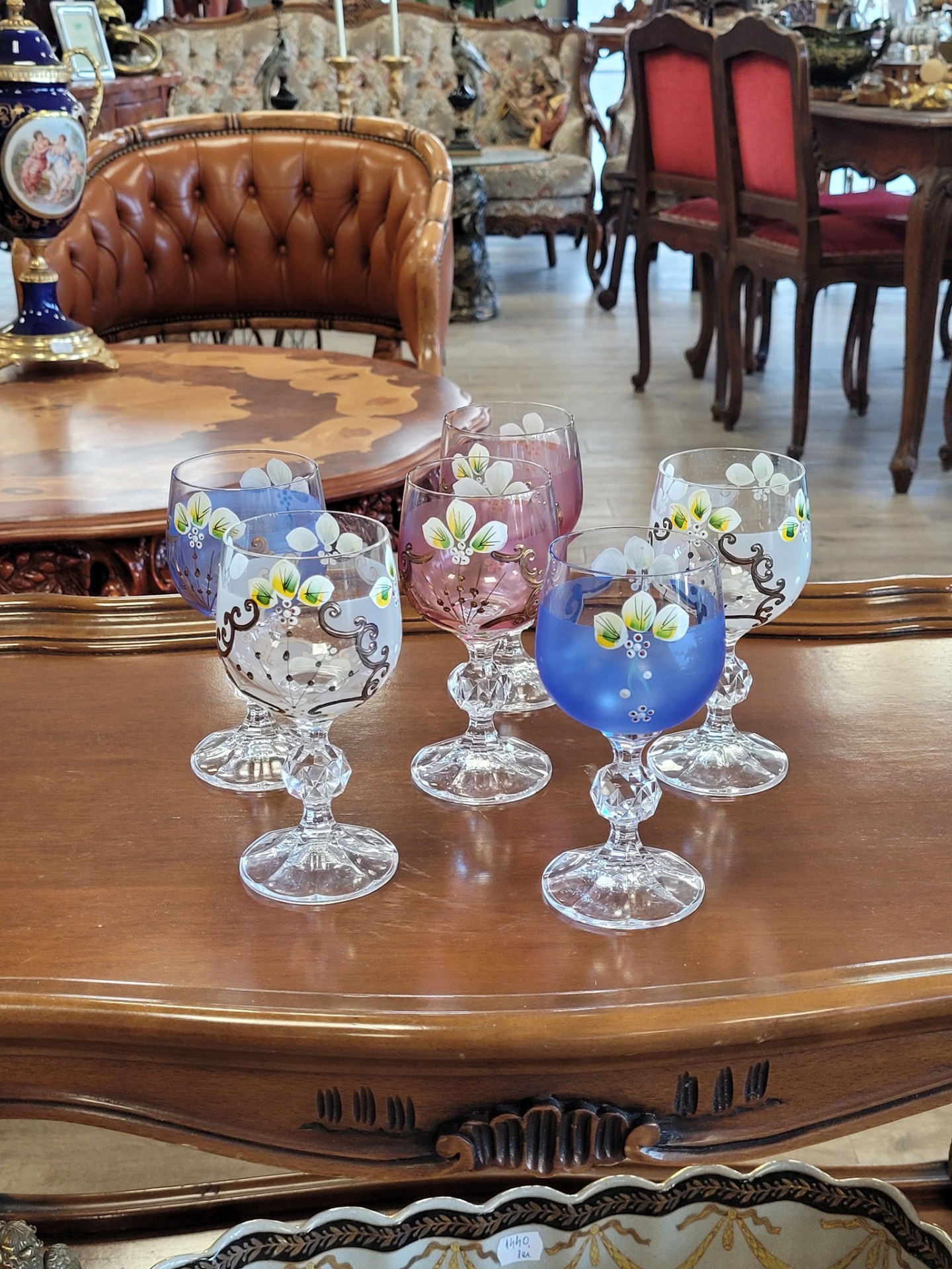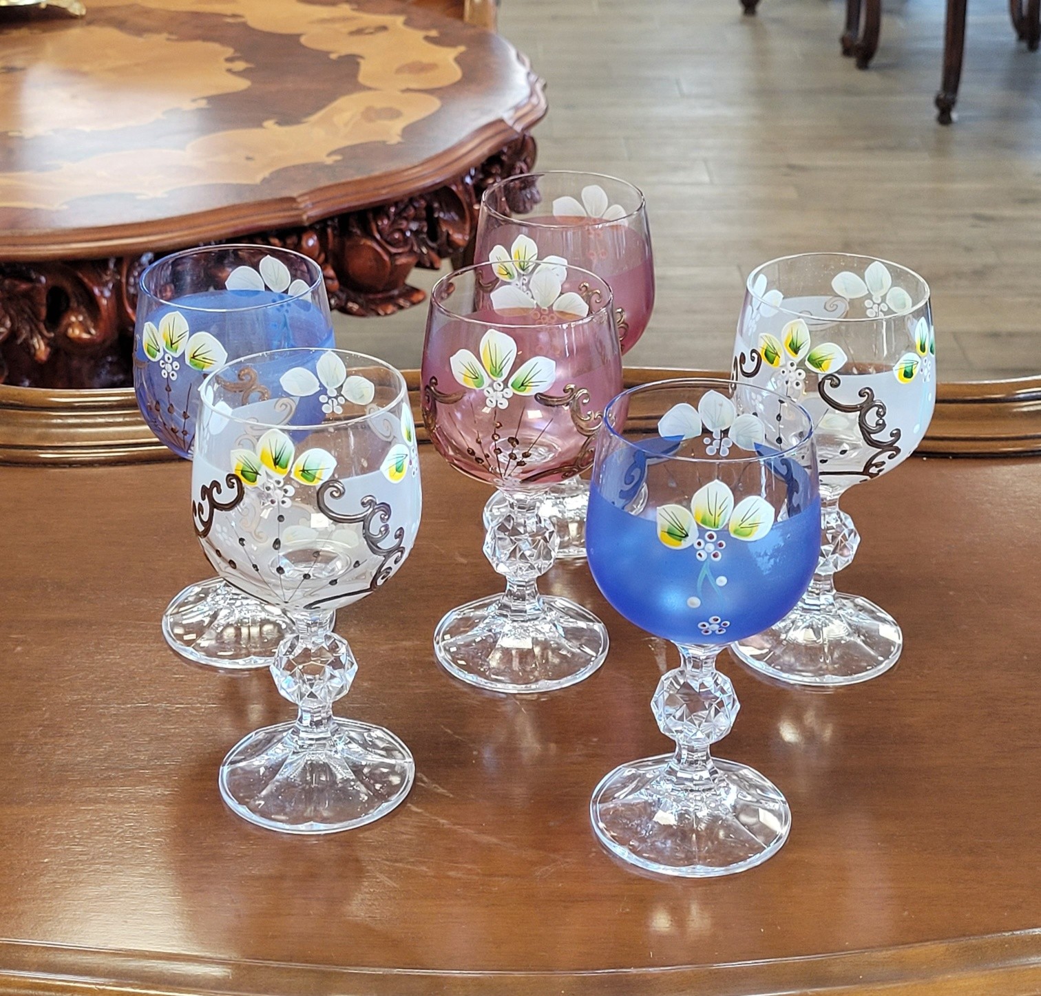 Set deosebit de 6 pahare de vin/aperitiv, realizate din cristal de înaltă calitate cu design rafinat, combinând măiestria sticlăriei clasice cu detalii artistice lucrate manual.