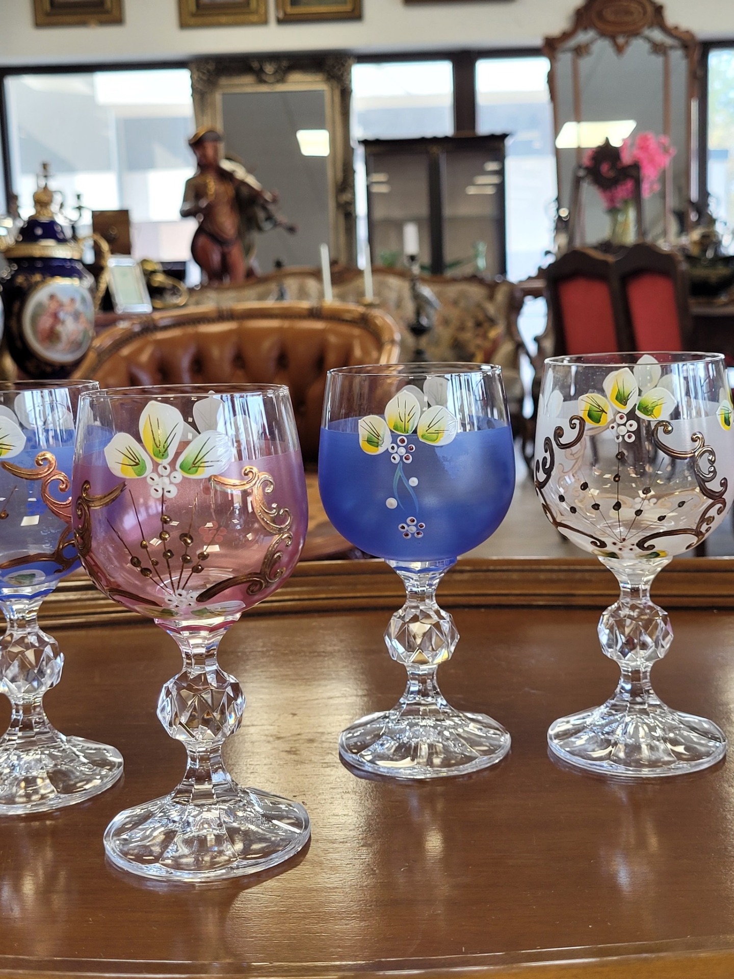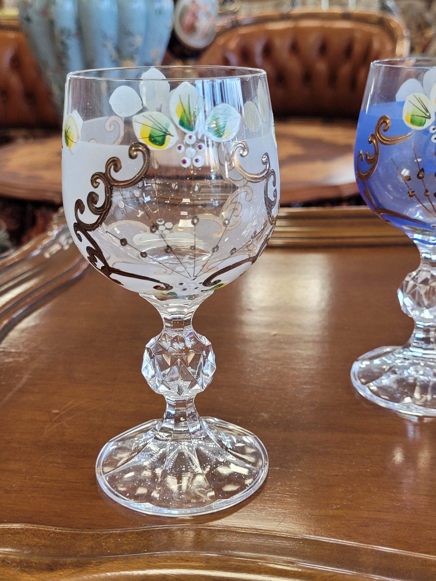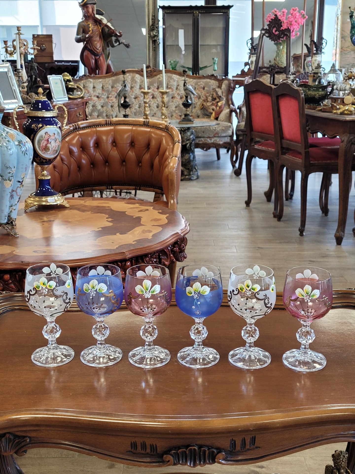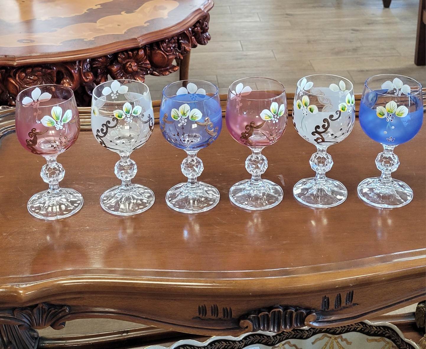 Set deosebit de 6 pahare de vin/aperitiv, realizate din cristal de înaltă calitate cu design rafinat, combinând măiestria sticlăriei clasice cu detalii artistice lucrate manual.