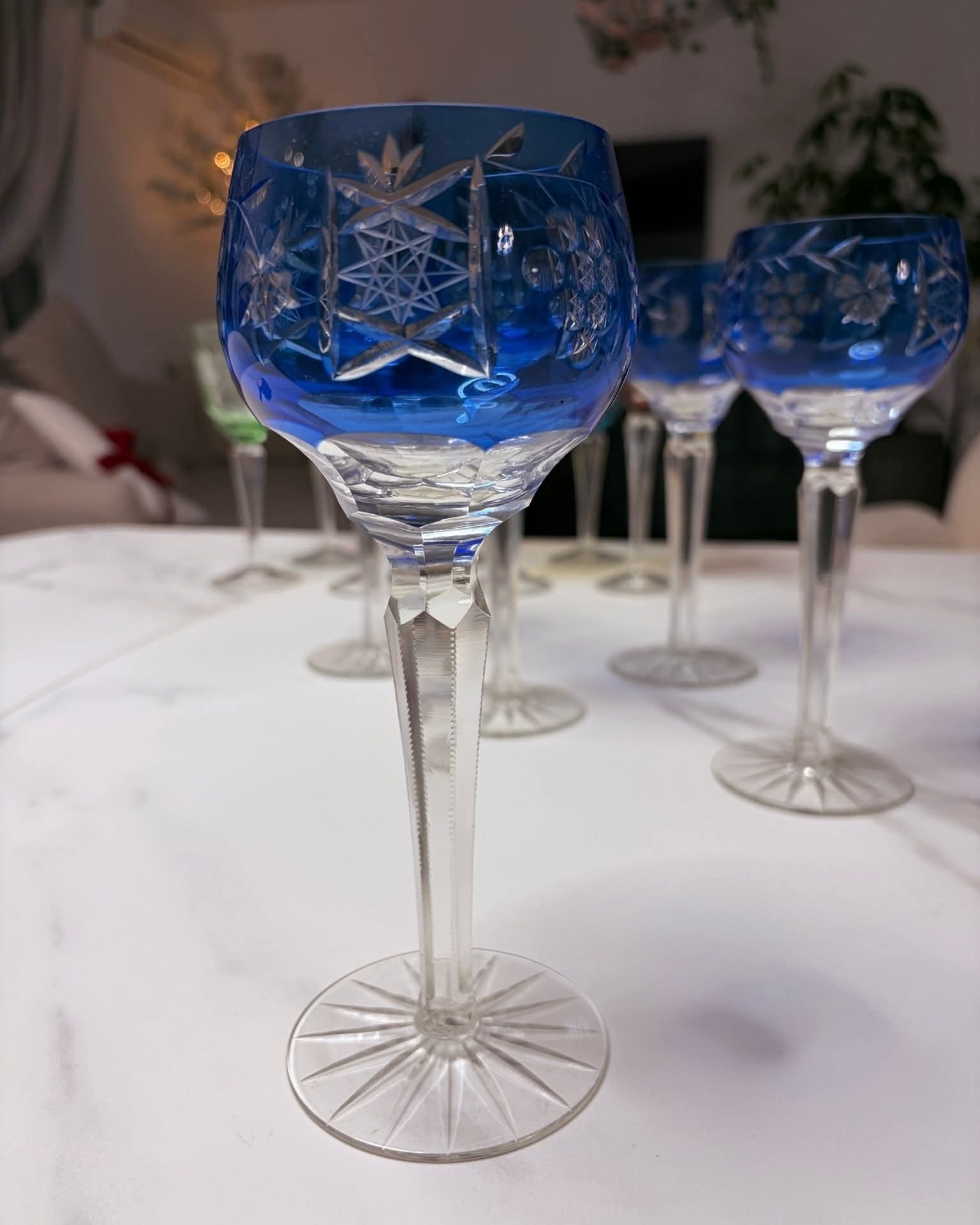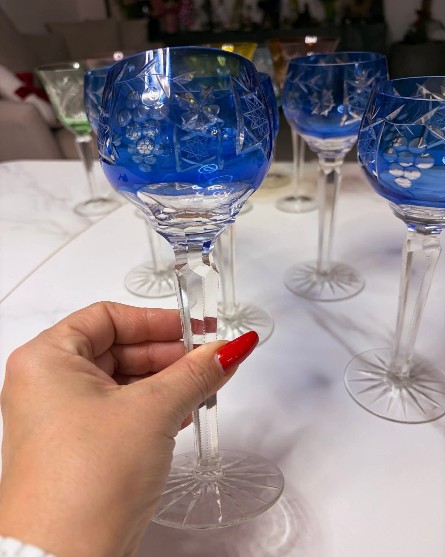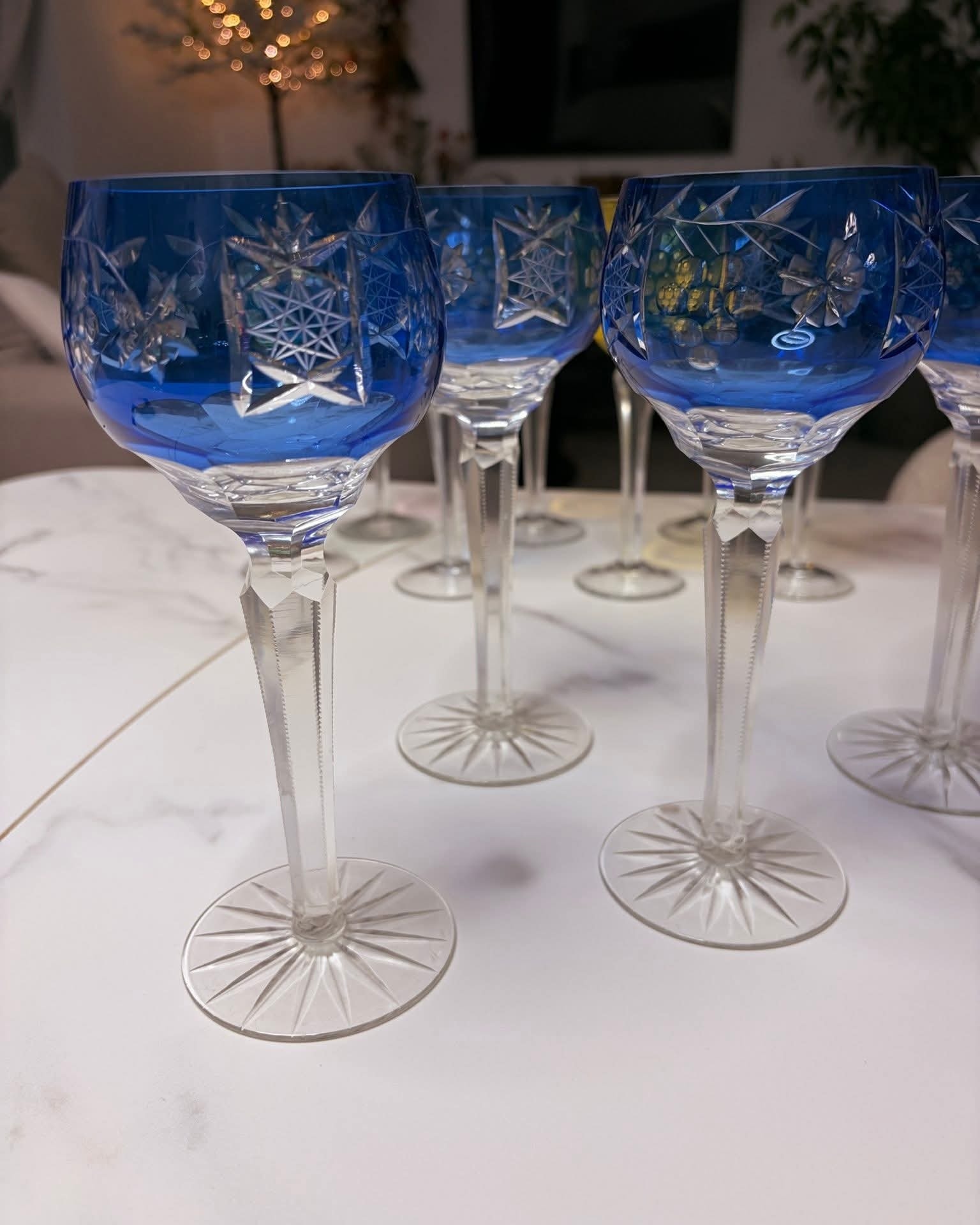Set deosebit format din 5 pahare înalte din cristal veritabil, de o culoare albastru cobalt profundă și vibrantă. Aceste piese sunt realizate prin tehnica