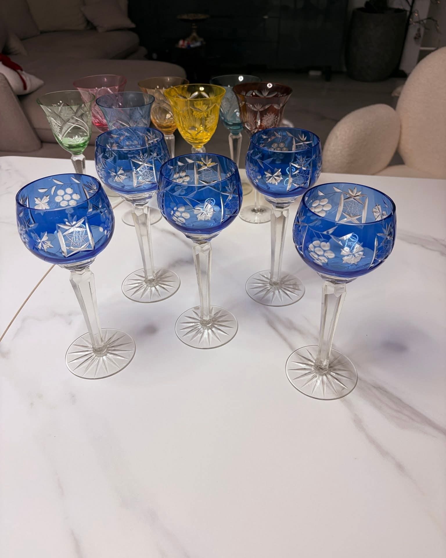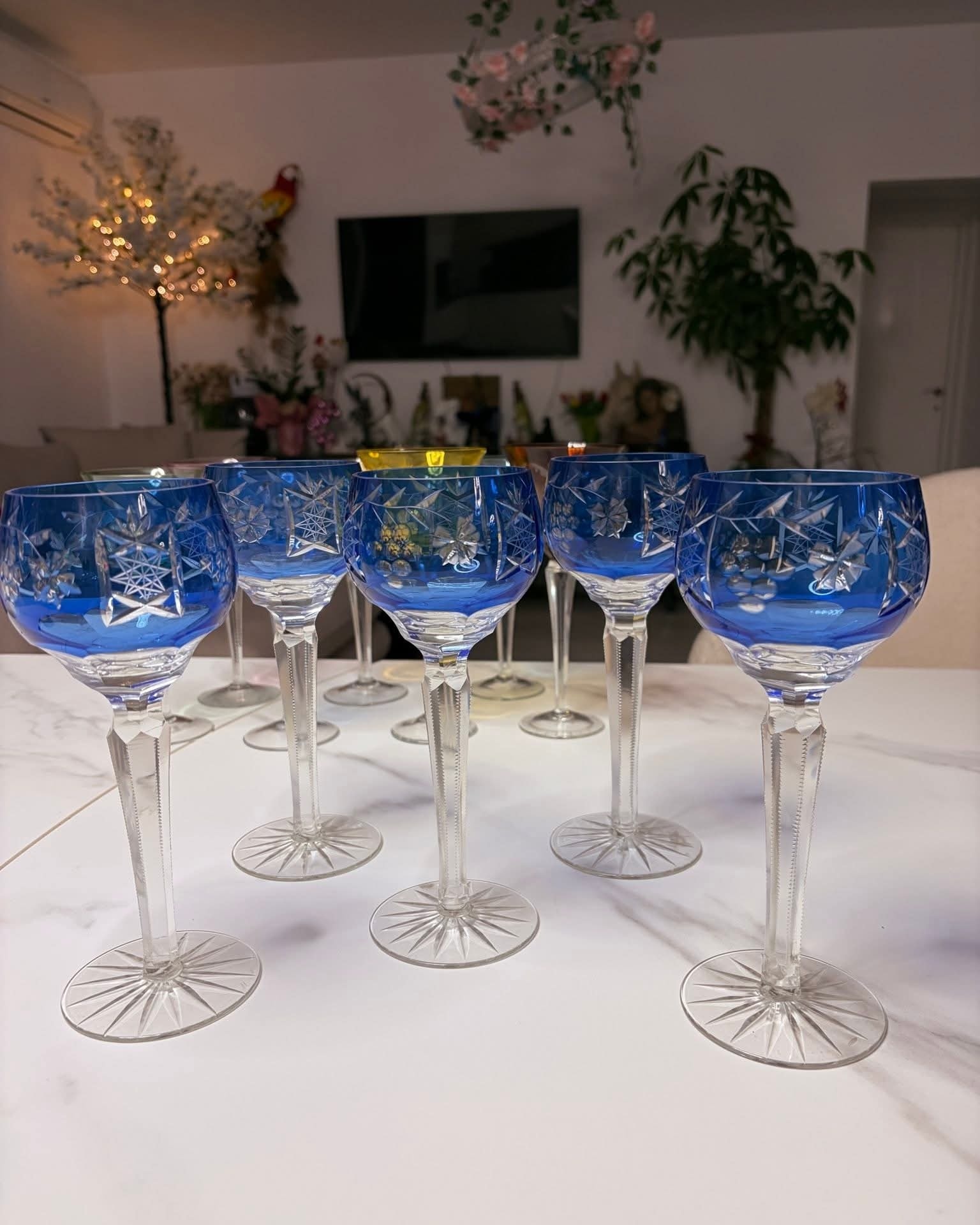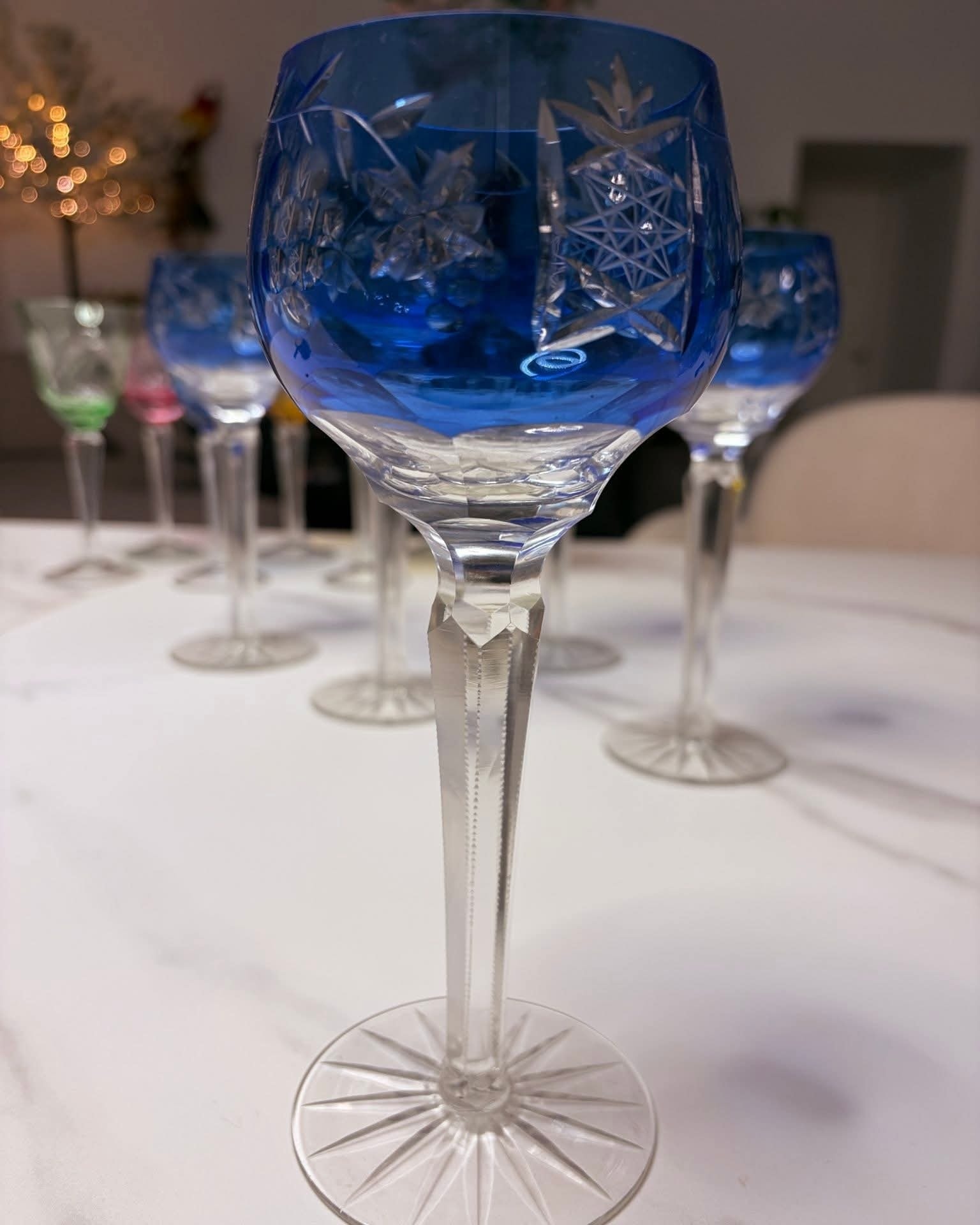 Set deosebit format din 5 pahare înalte din cristal veritabil, de o culoare albastru cobalt profundă și vibrantă. Aceste piese sunt realizate prin tehnica
