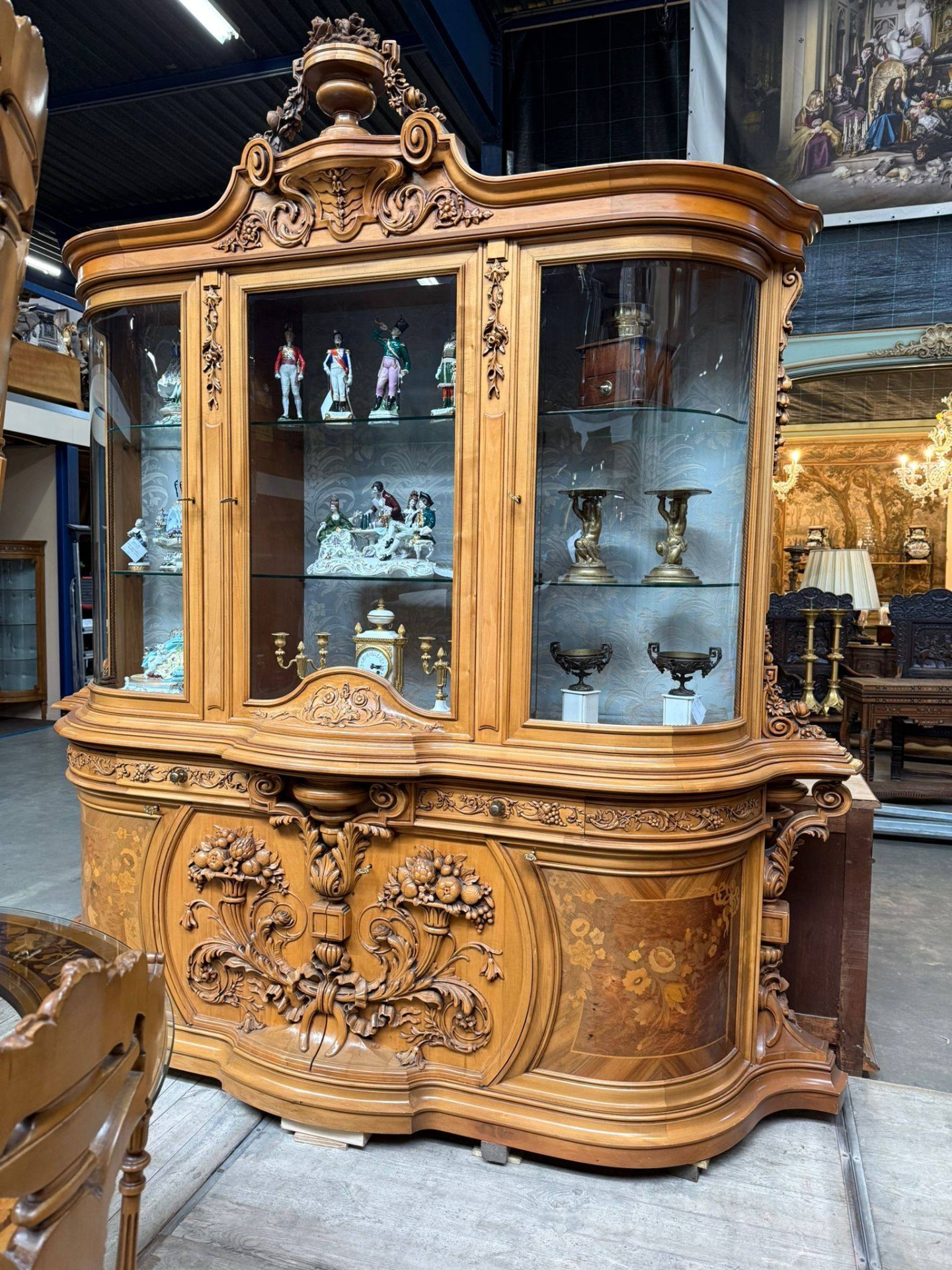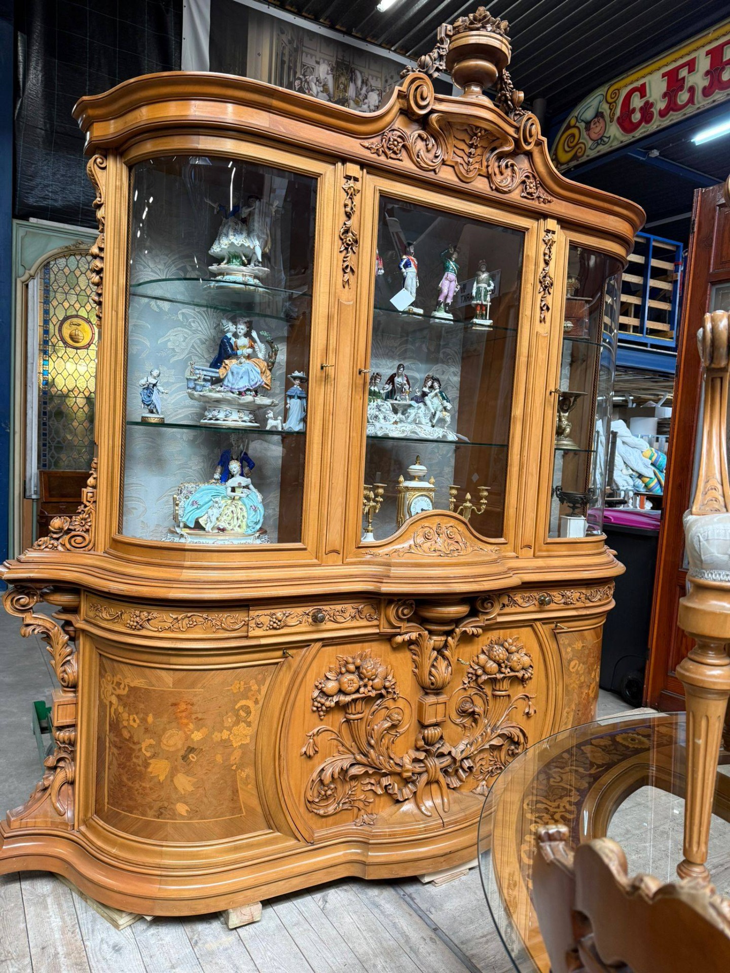 Vitrină cu geamuri curbate și spații de expunere