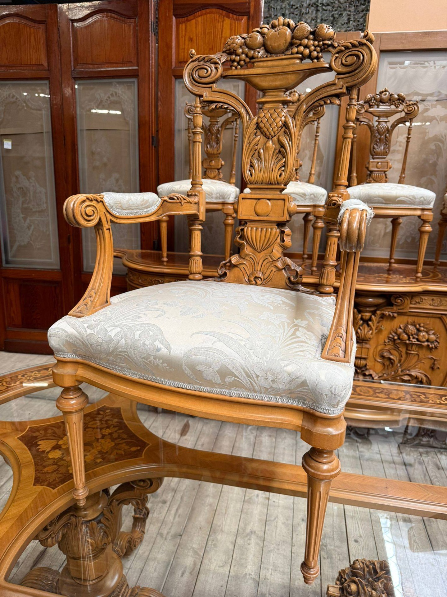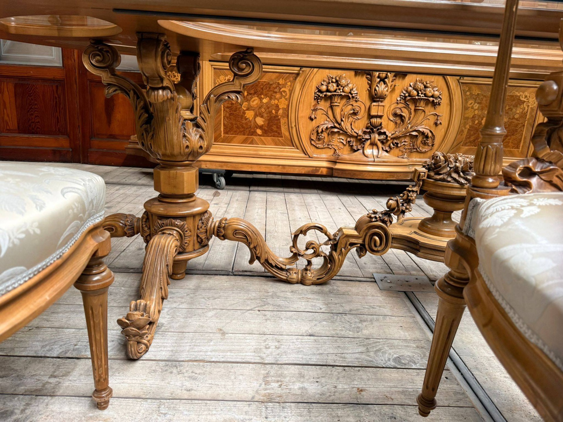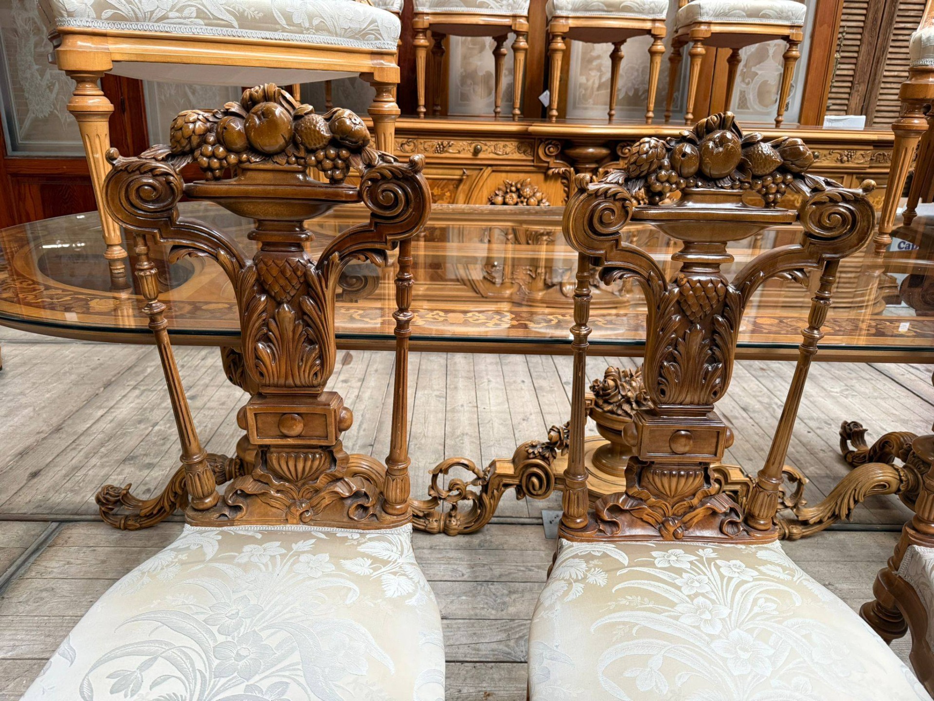 Un set de dining spectaculos, realizat în stil clasic elegant, cu influențe franțuzești (Louis XV), ideal pentru iubitorii de mobilier deosebit și rafinat.