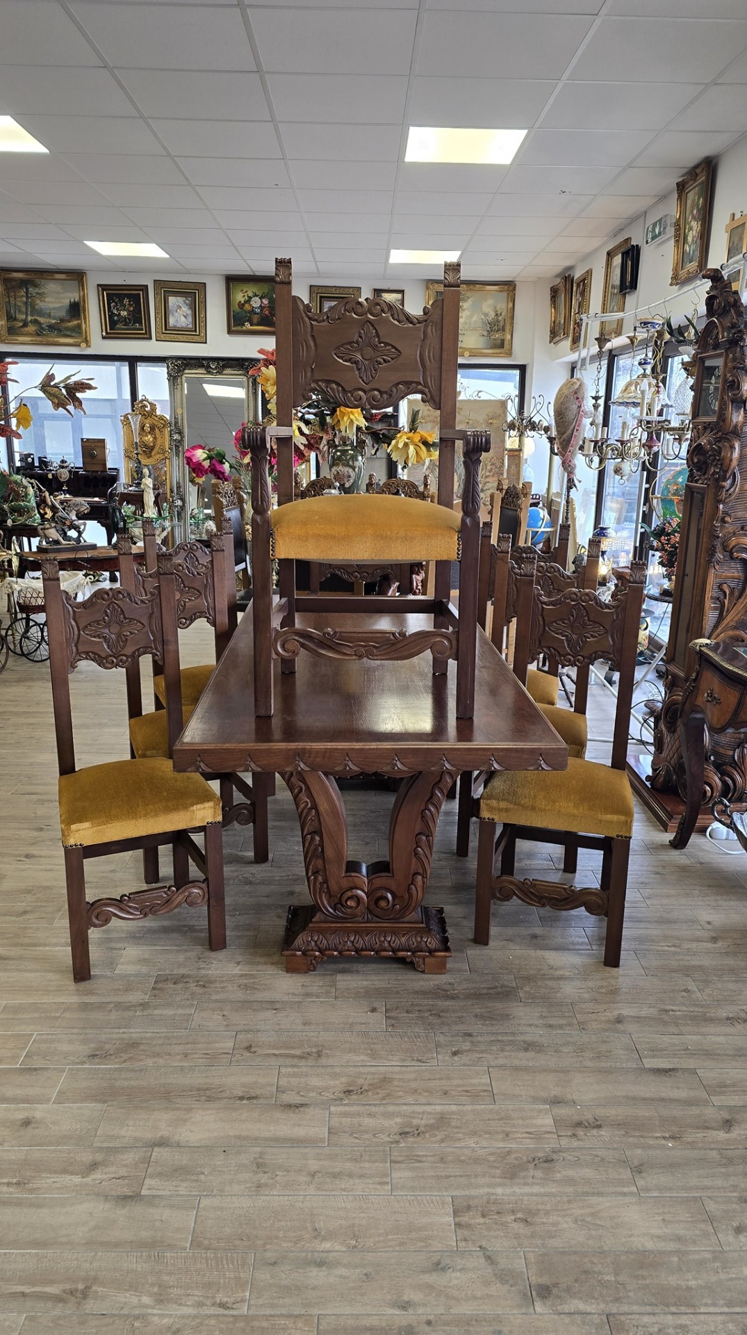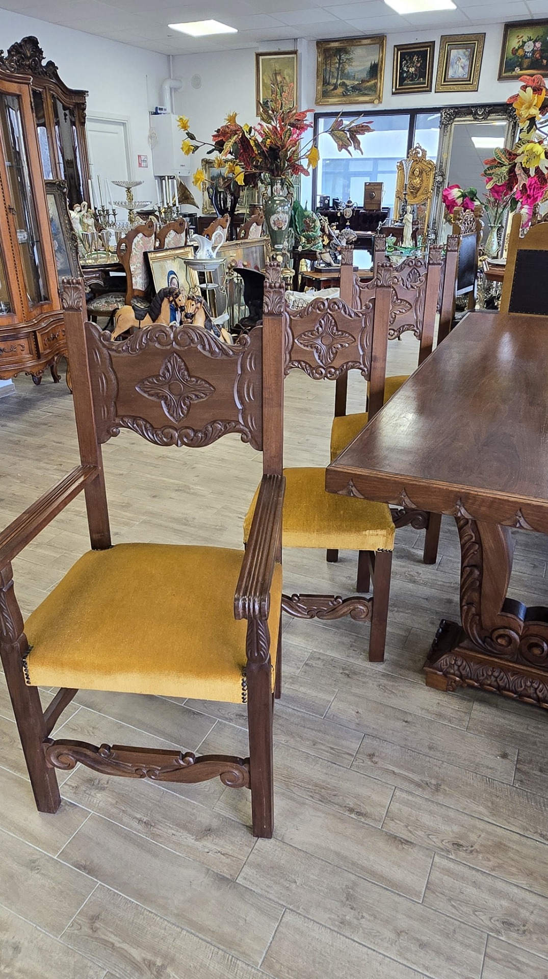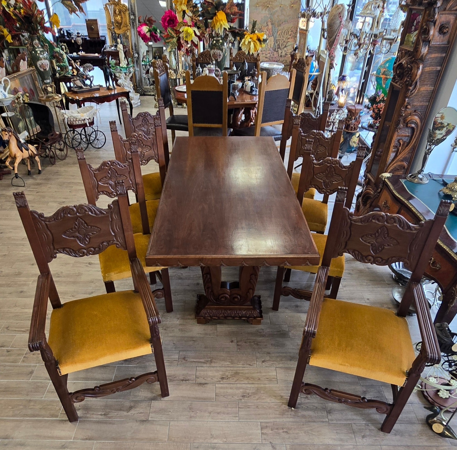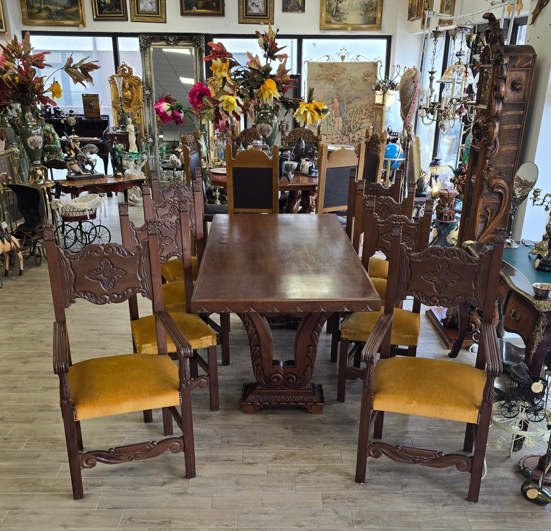 Set dining superb și impunător, realizat în stil Renaissance Revival, compus din masă și 8 scaune (6 standard și 2 de tip fotoliu, cu brațe, pentru capetele mesei), cu tapițerie velur galben-muștar în stare bună, fără defecte. Picioarele mesei sunt din lemn masiv, sculptate în formă de liră, care susțin blatul solid, cu marginea sculptată decorativ.