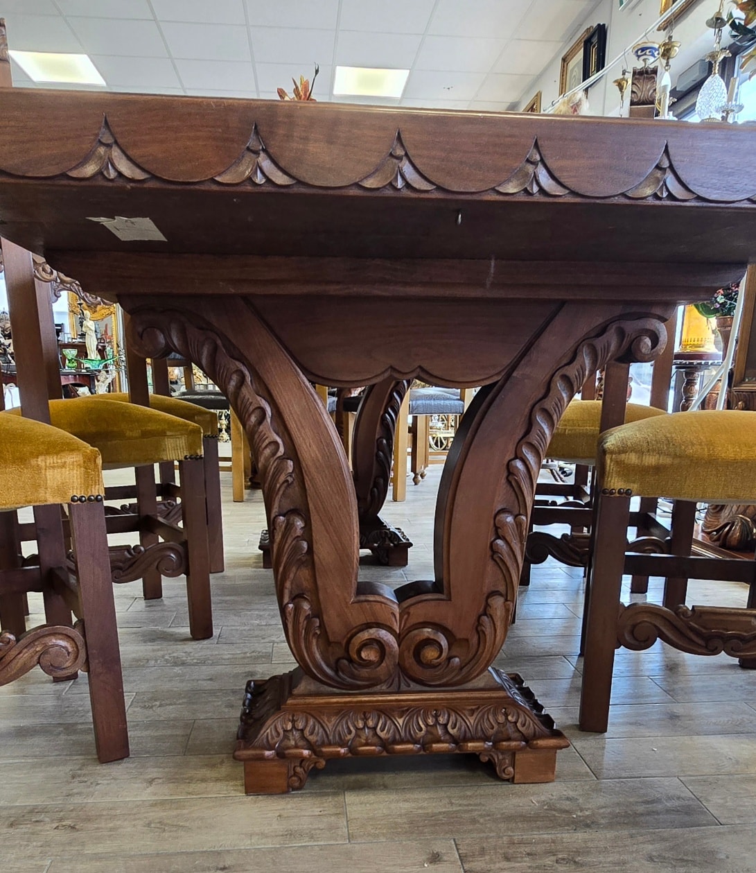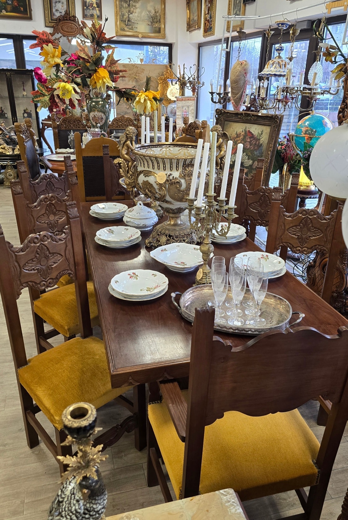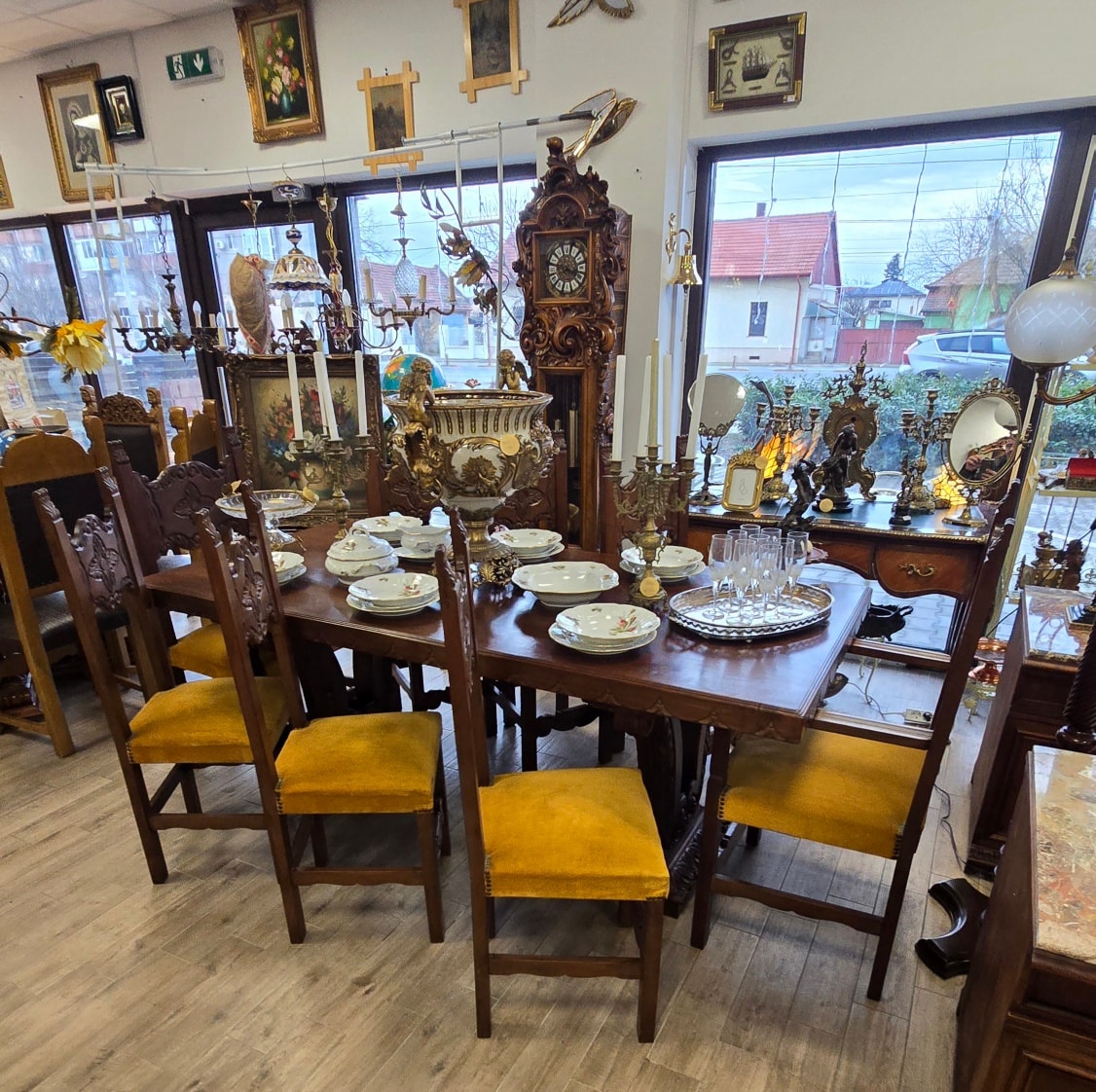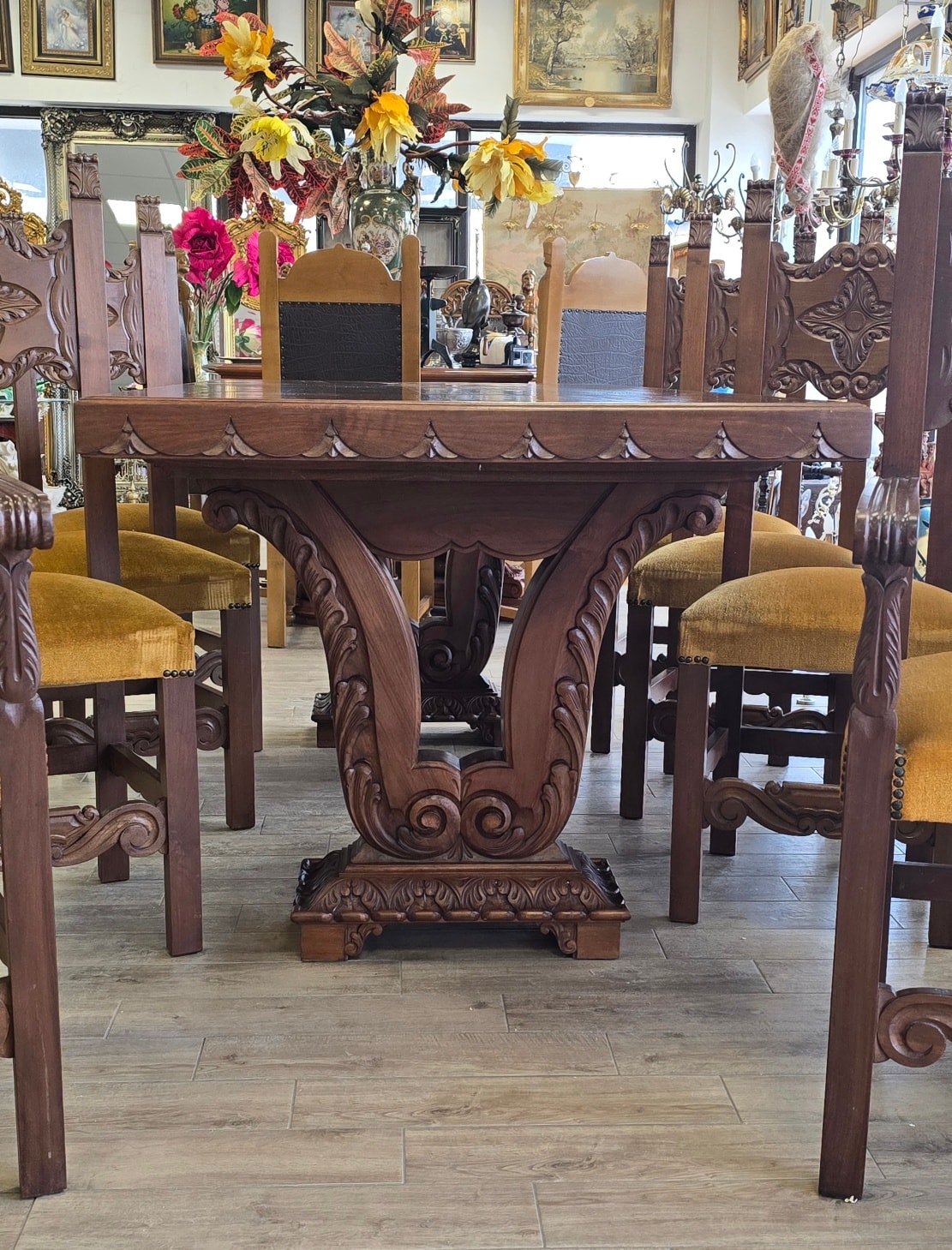 Set dining superb și impunător, realizat în stil Renaissance Revival, compus din masă și 8 scaune (6 standard și 2 de tip fotoliu, cu brațe, pentru capetele mesei), cu tapițerie velur galben-muștar în stare bună, fără defecte. Picioarele mesei sunt din lemn masiv, sculptate în formă de liră, care susțin blatul solid, cu marginea sculptată decorativ.