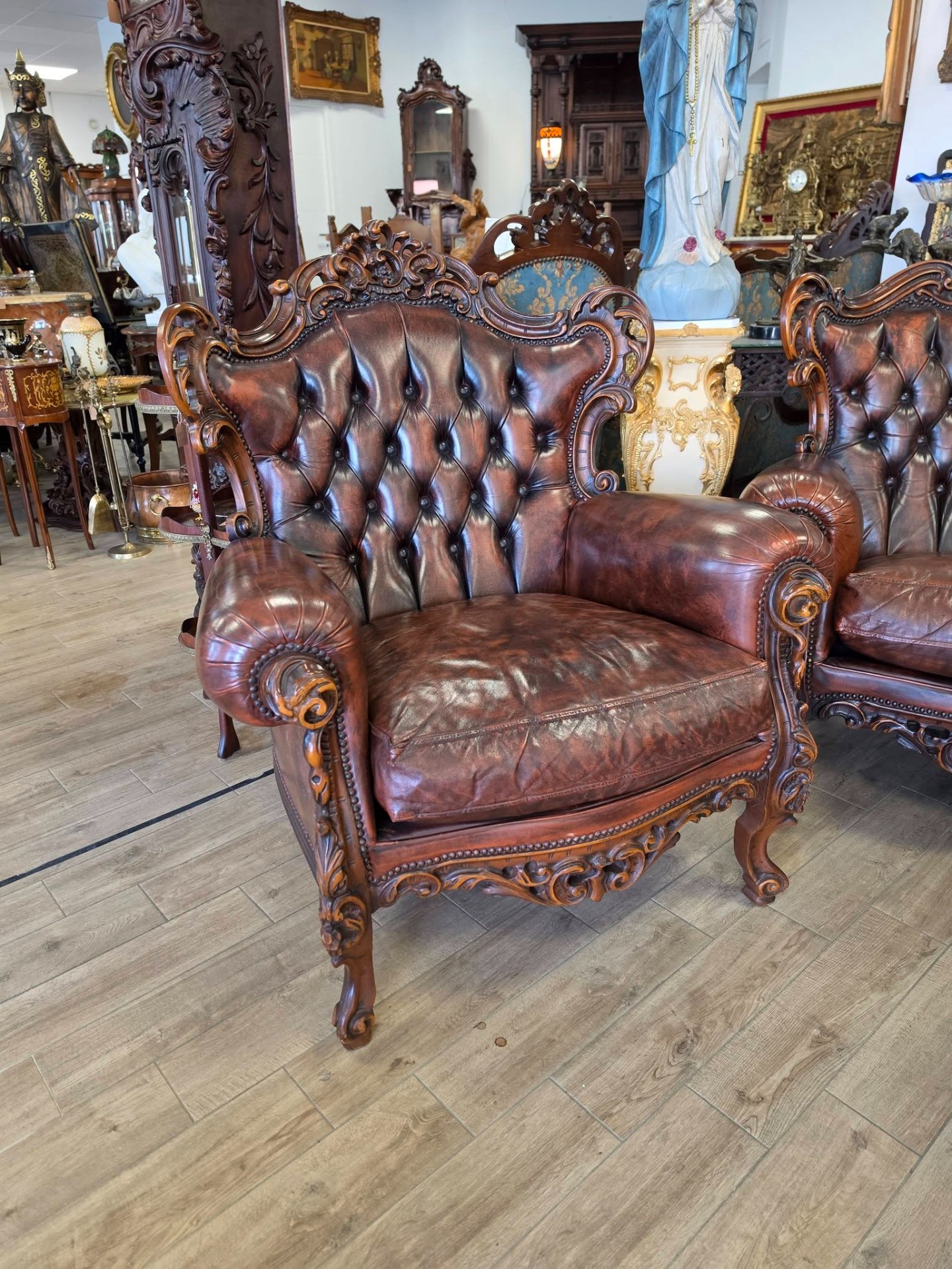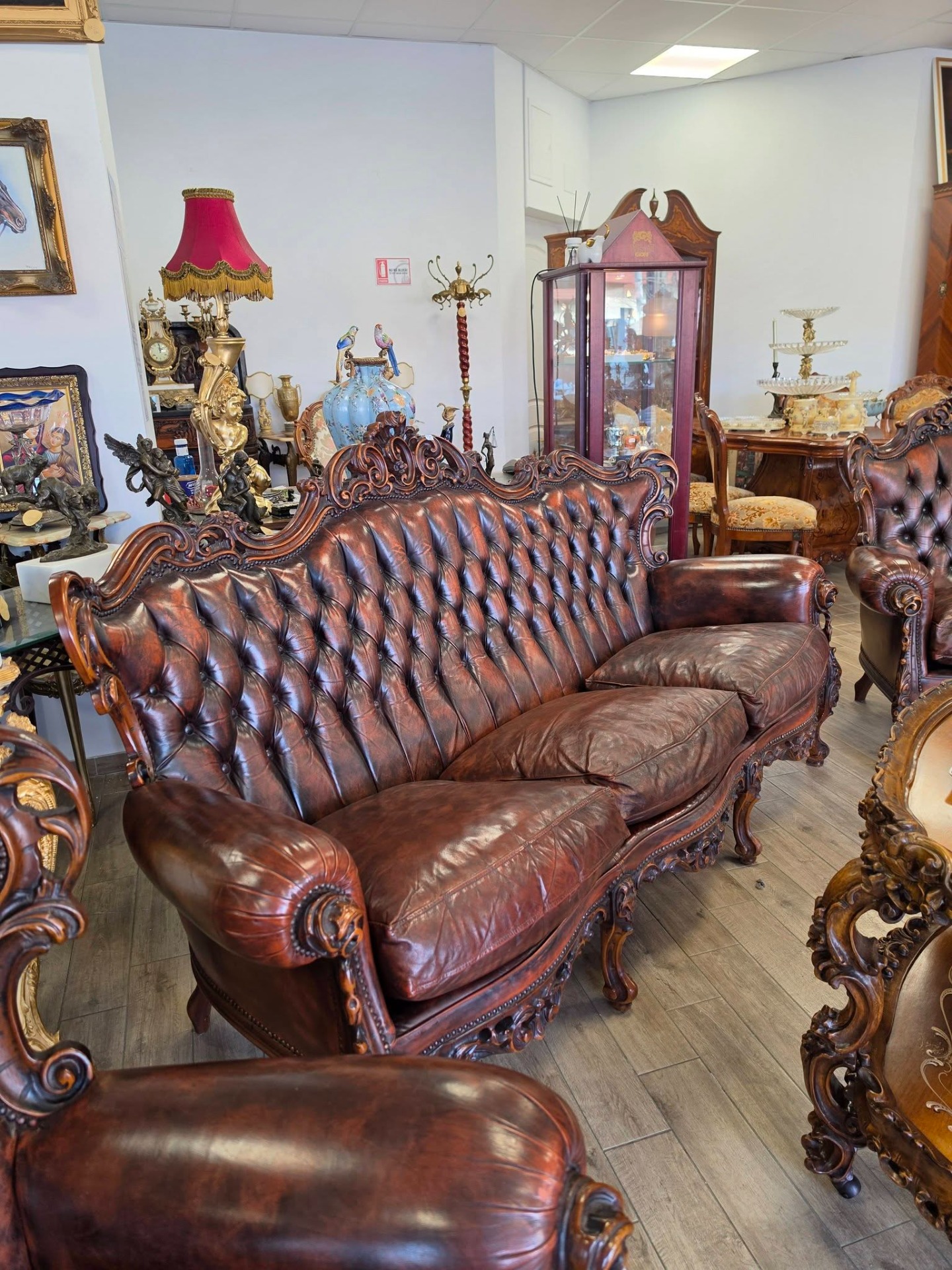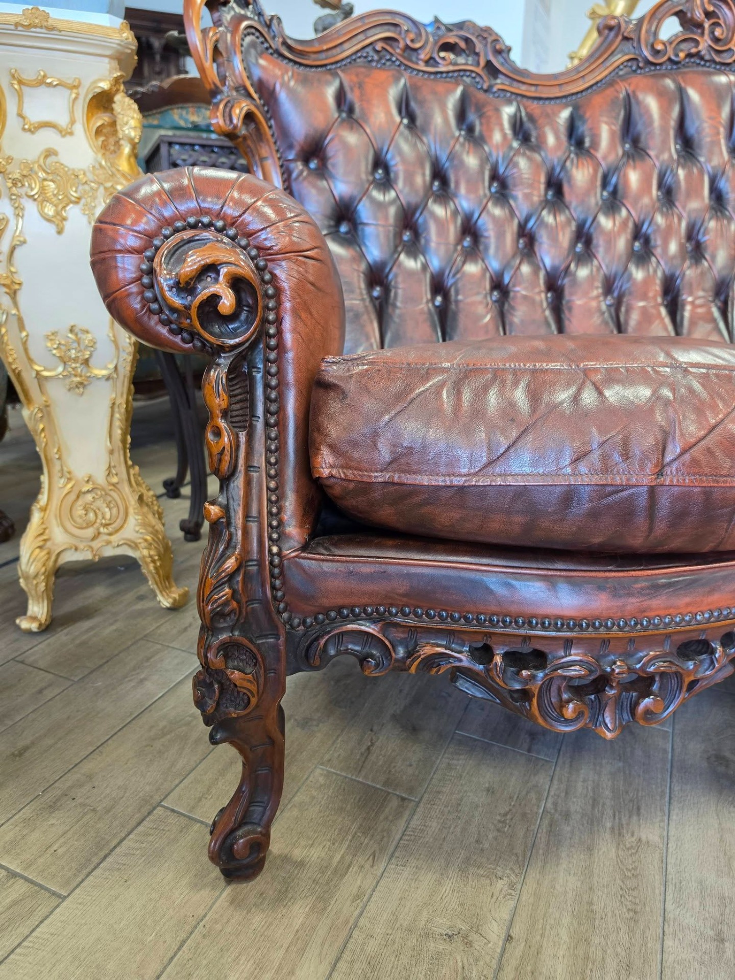 Set elegant compus din canapea și 2fotolii realizate în stil Chesterfield, cu finisaje deosebite și detalii sculptate manual din lemn masiv.