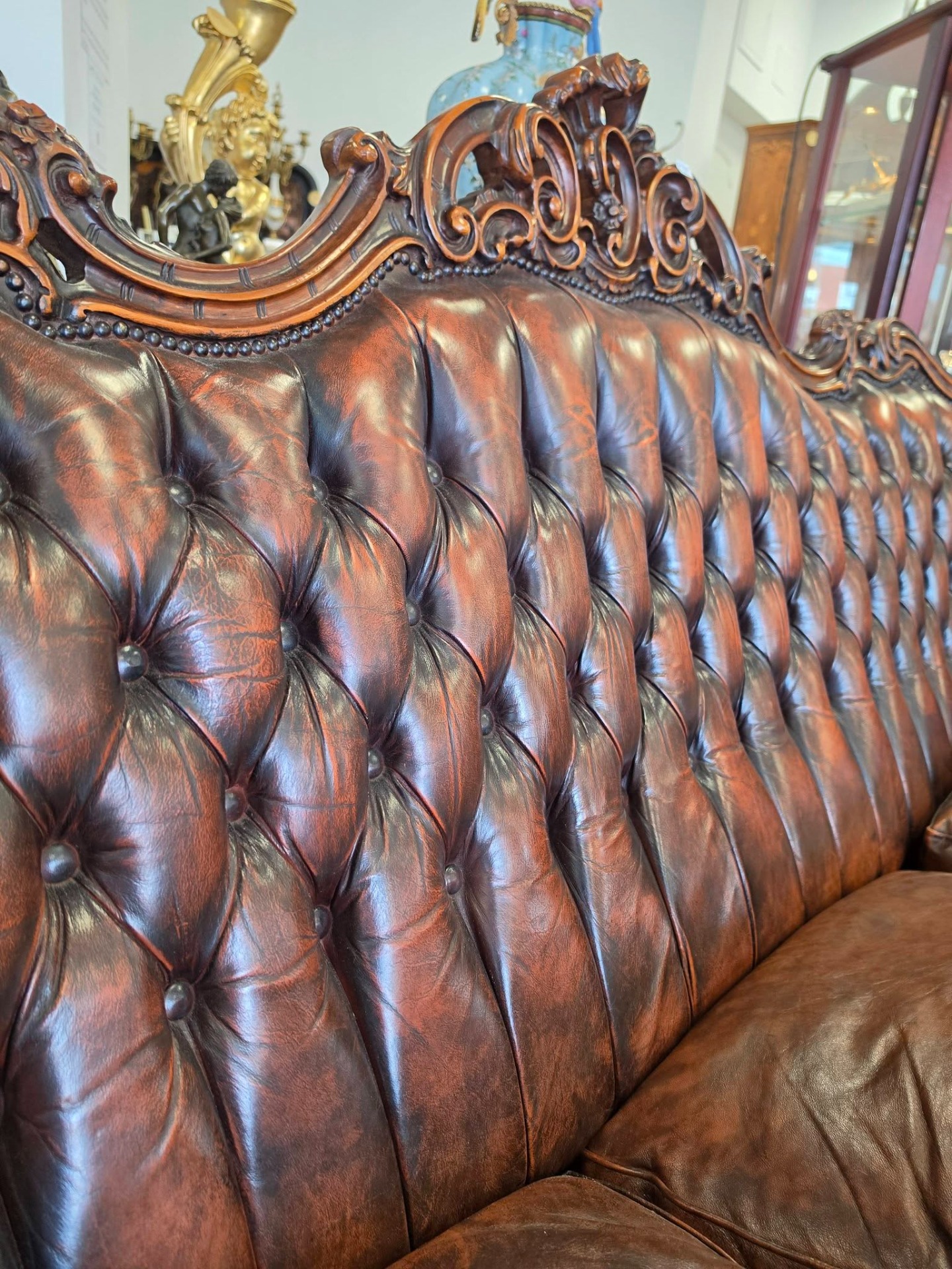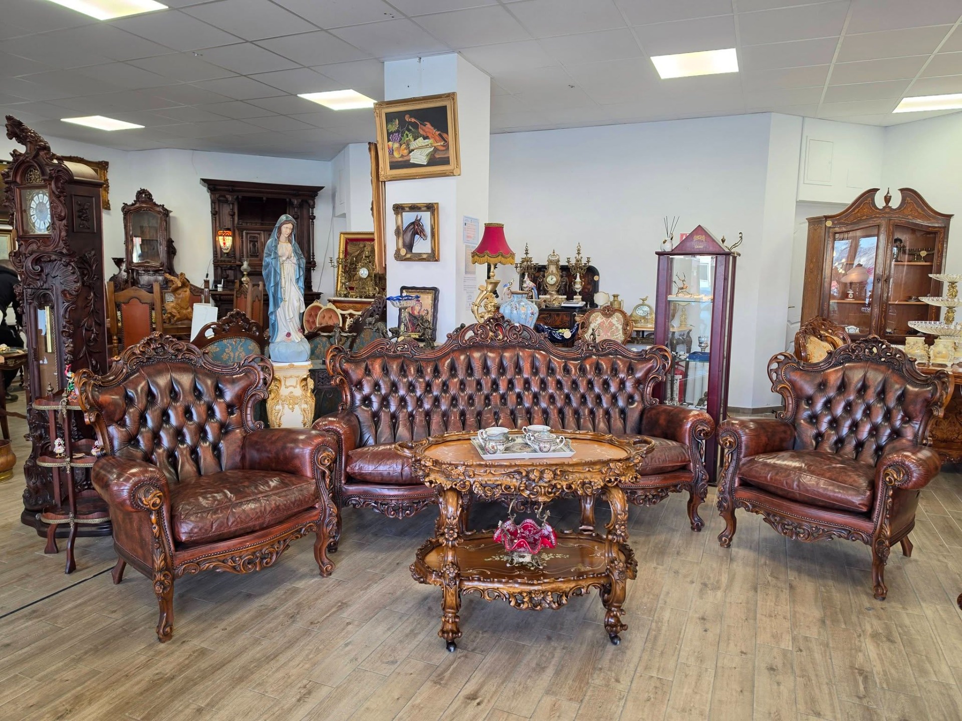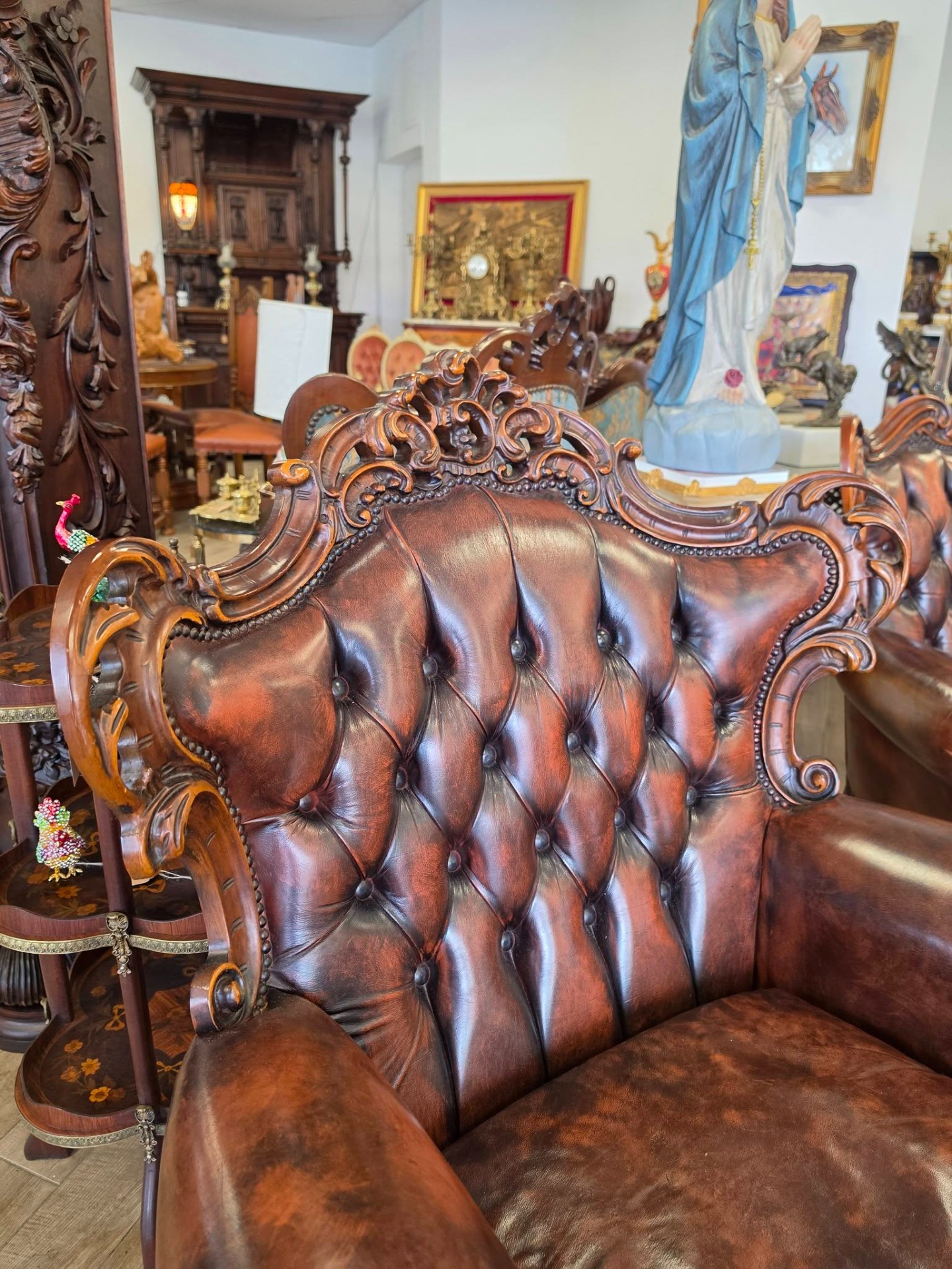 Set elegant compus din canapea și 2fotolii realizate în stil Chesterfield, cu finisaje deosebite și detalii sculptate manual din lemn masiv.