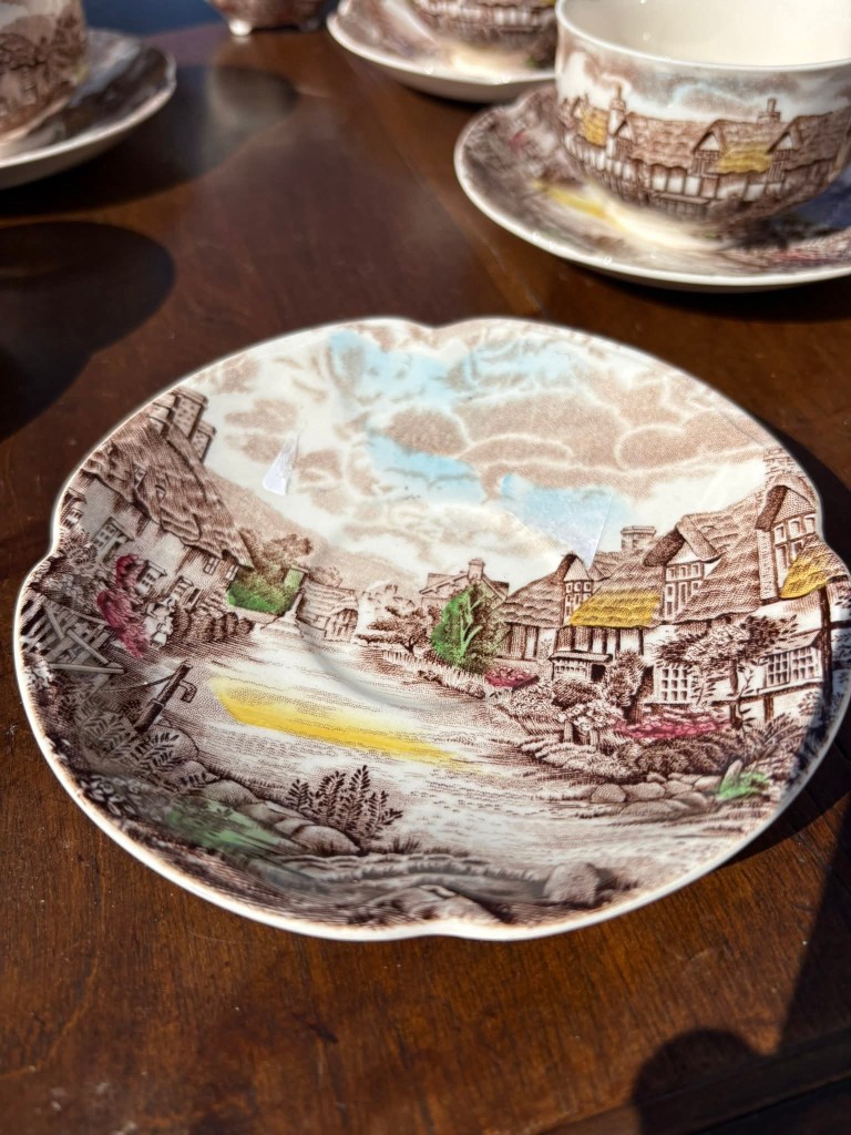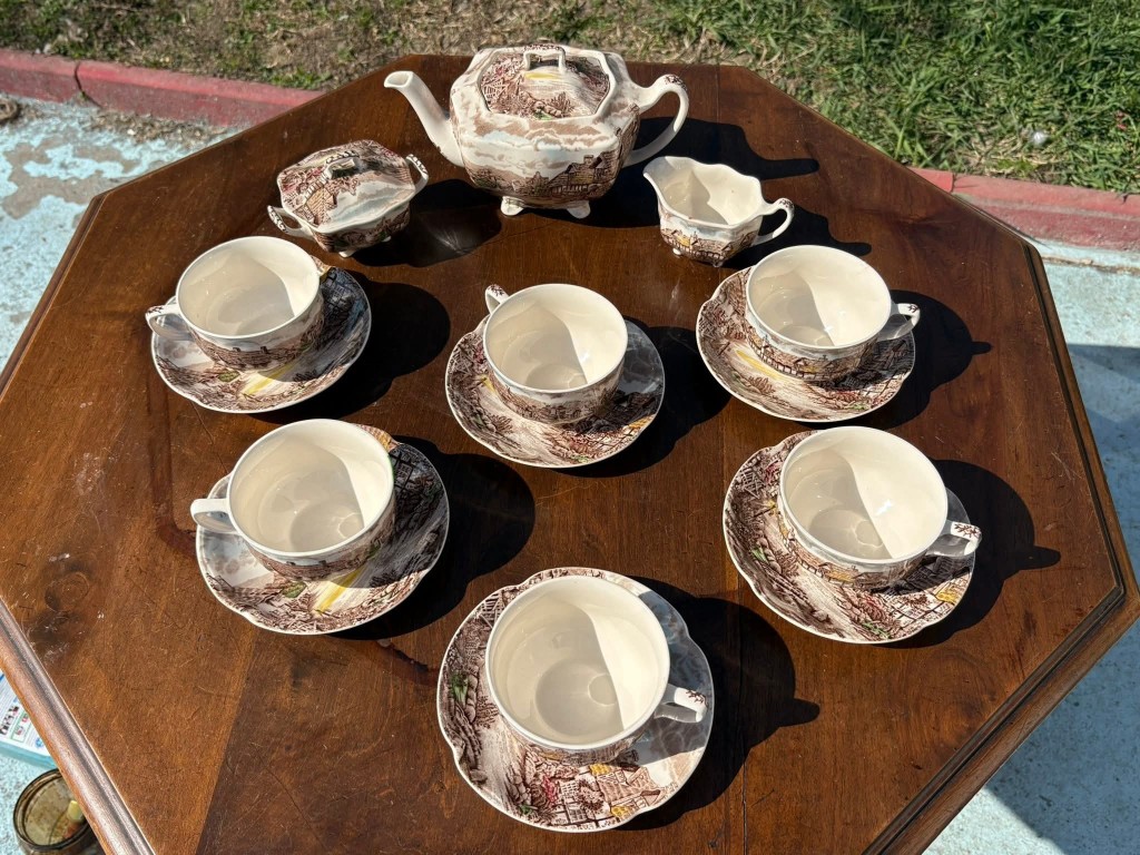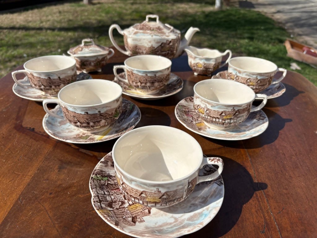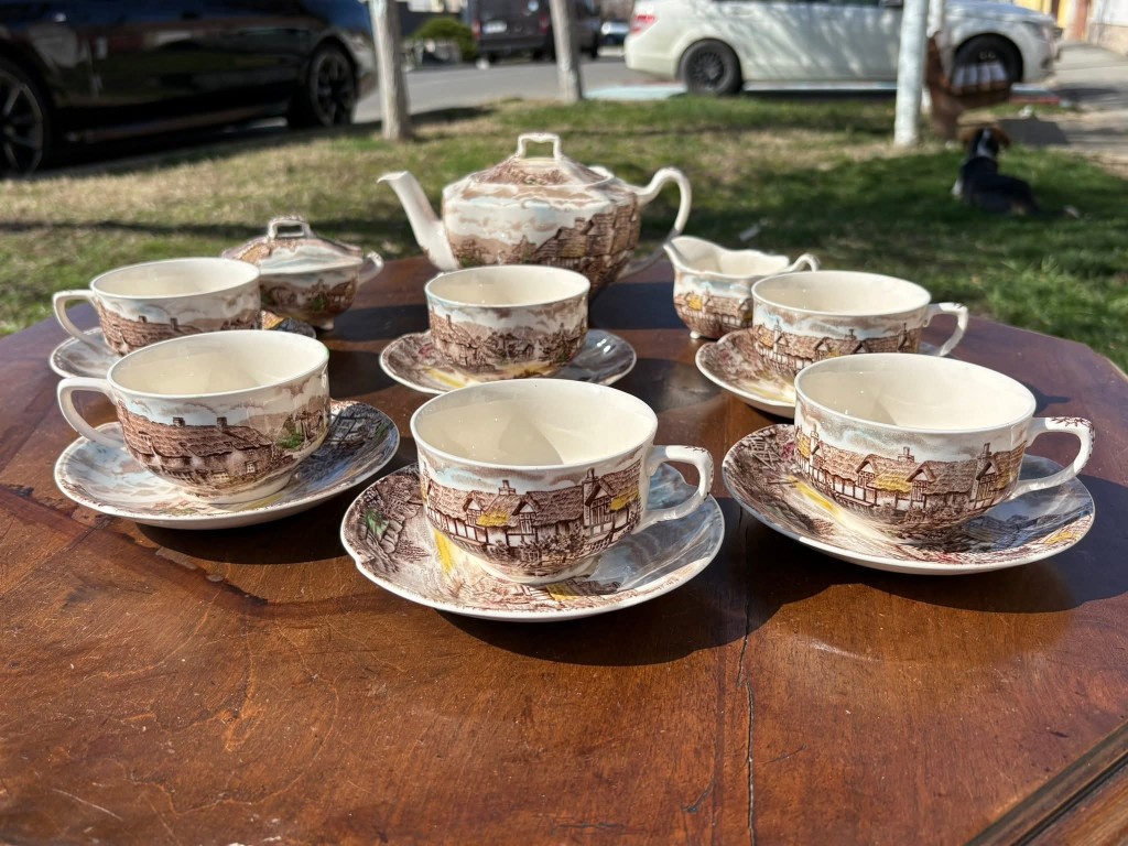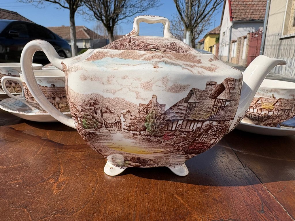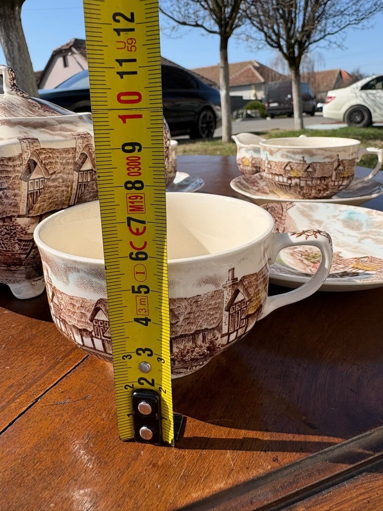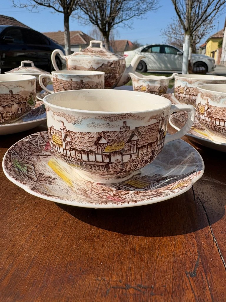 Set elegant de cafea- ceai din porțelan englezesc, model “Olde English Countryside”, produs de Johnson Bros – Made in England, cu gravură manuală autentică. Un set deosebit, cu design clasic englezesc, ideal pentru colecționari sau pentru a adăuga un plus de eleganță momentelor de ceai.
