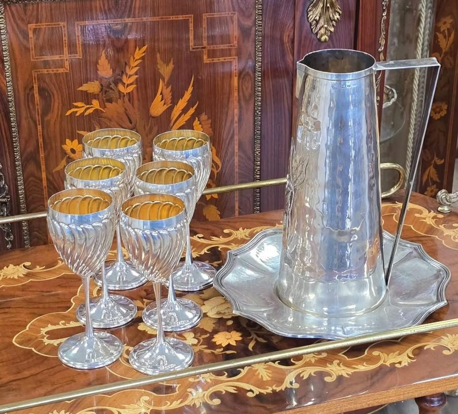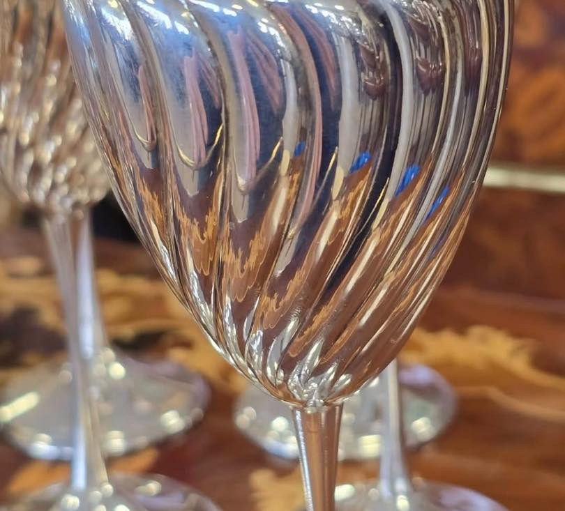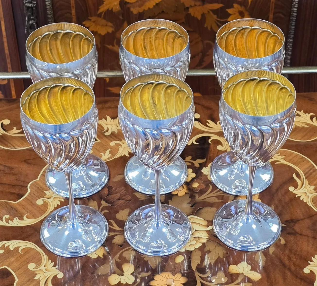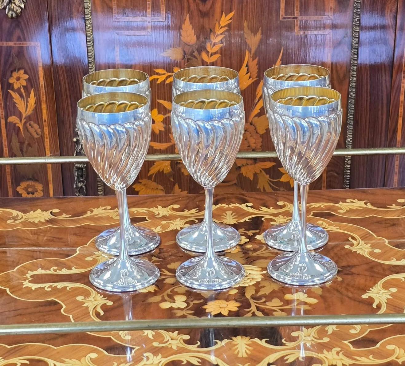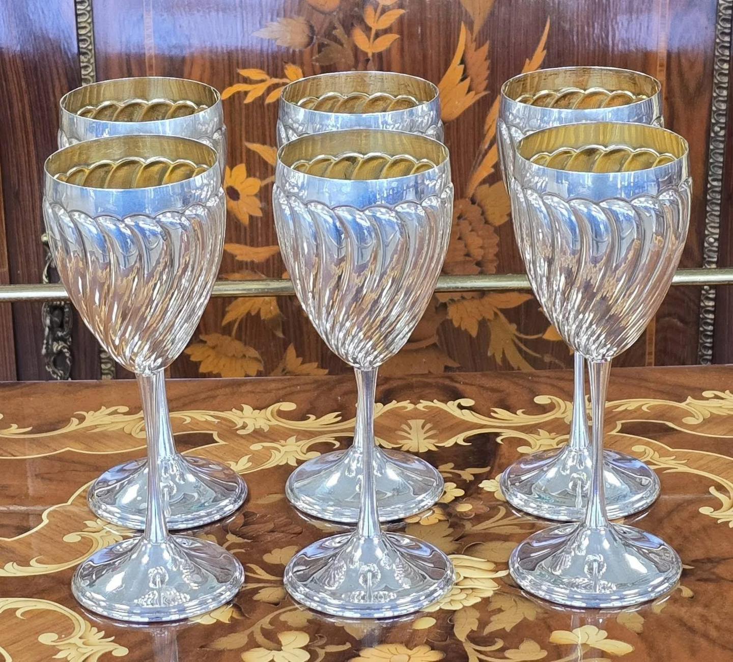 Set exclusivist compus din 6 pahare (cupe) din argint, cu interior vermeil, model spiralat (torsadat), care reflectă lumina spectaculos, realizate de celebra casă de argintărie Greggio Rino din Italia, unul dintre cei mai renumiți argintari din Padova (anii 1960-1970).