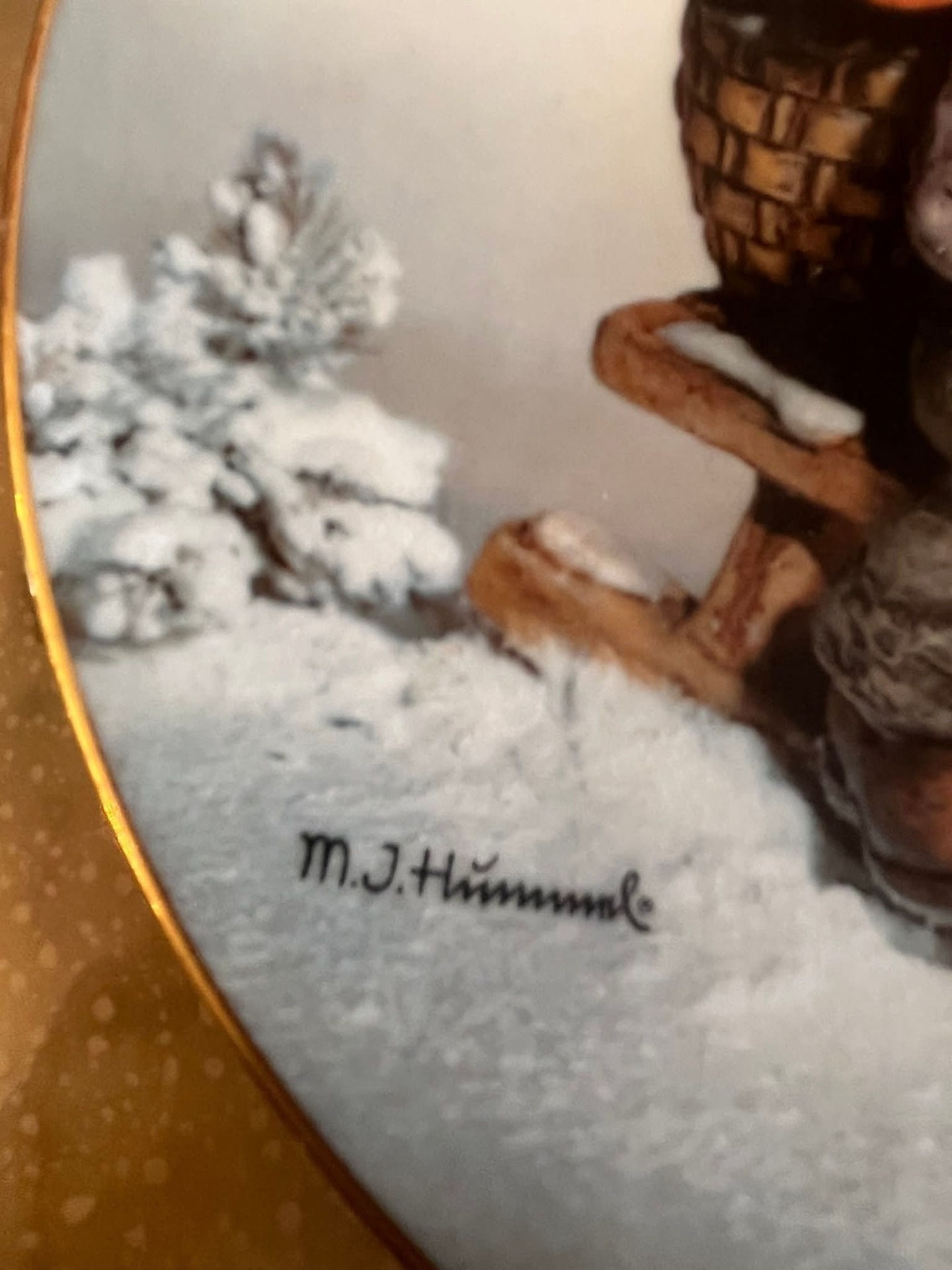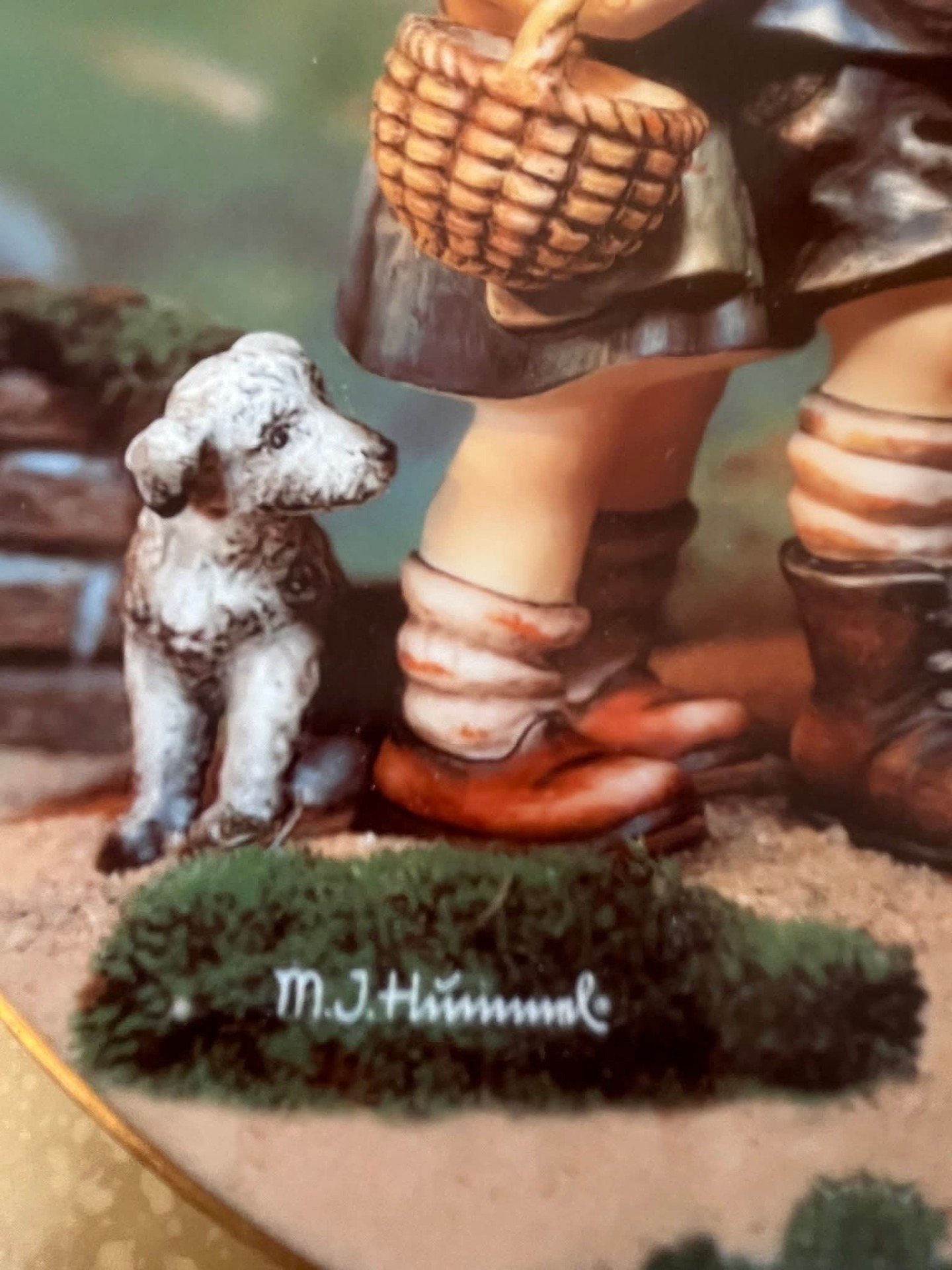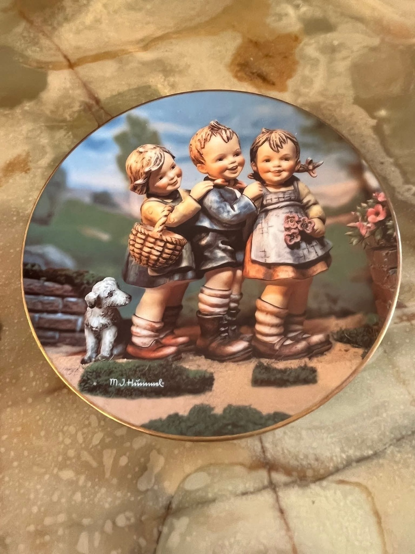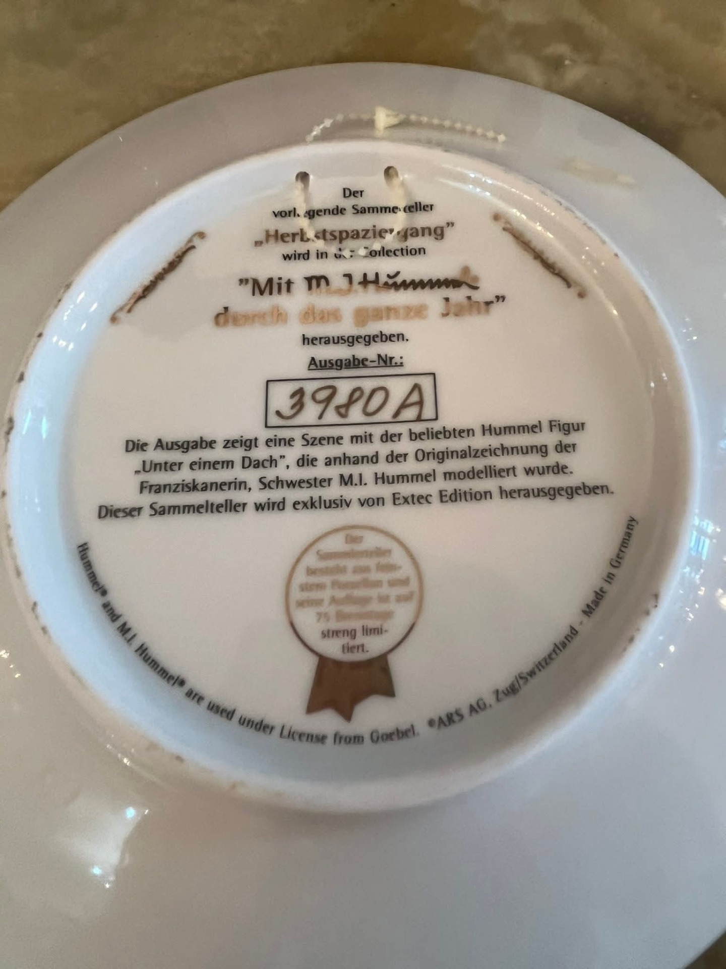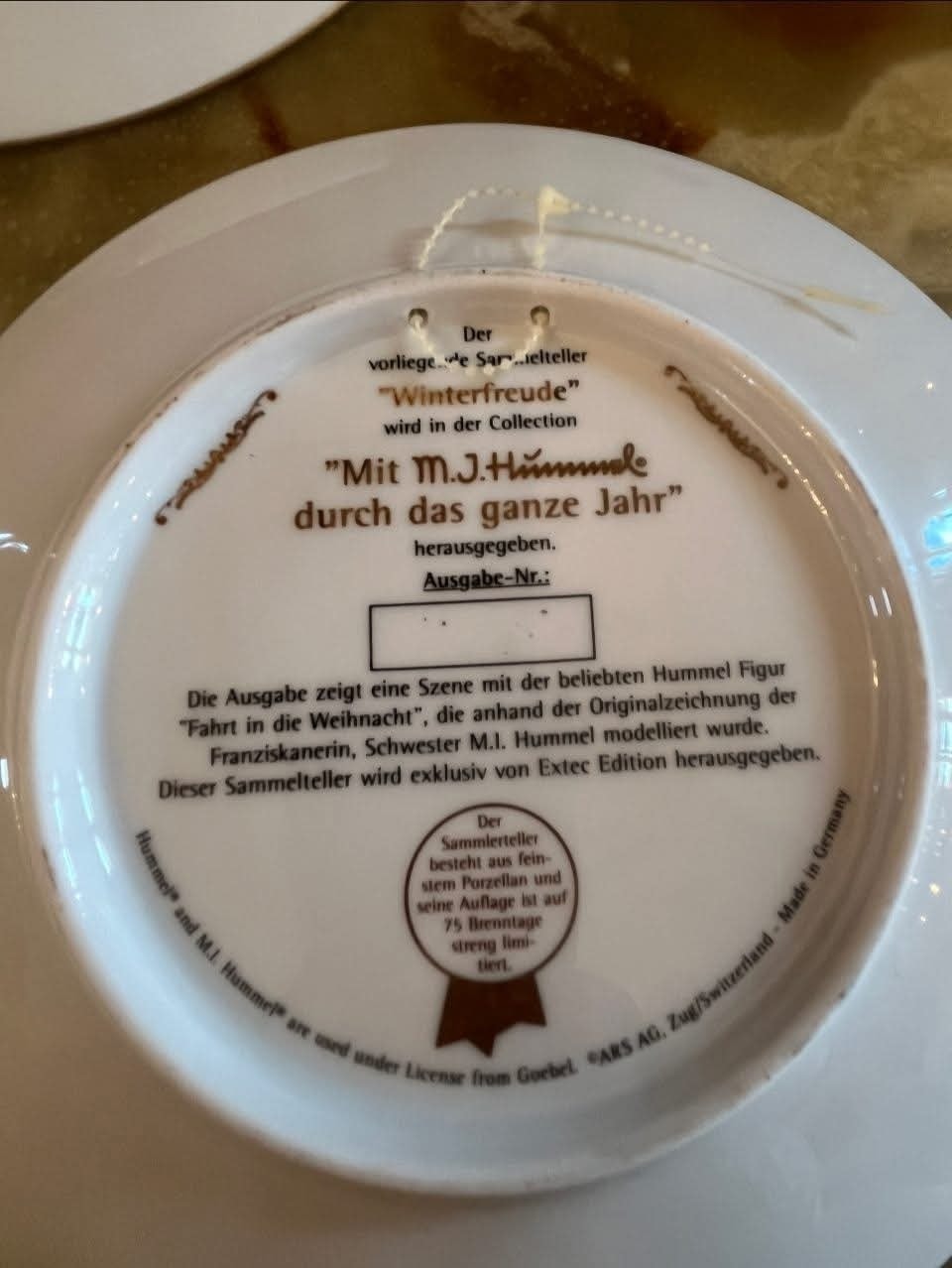 Fiecare farfurie ilustrează o scenă inspirată din desenele originale ale surorii franciscane M.I. Hummel, renumită pentru reprezentările sale delicate ale copilăriei.
