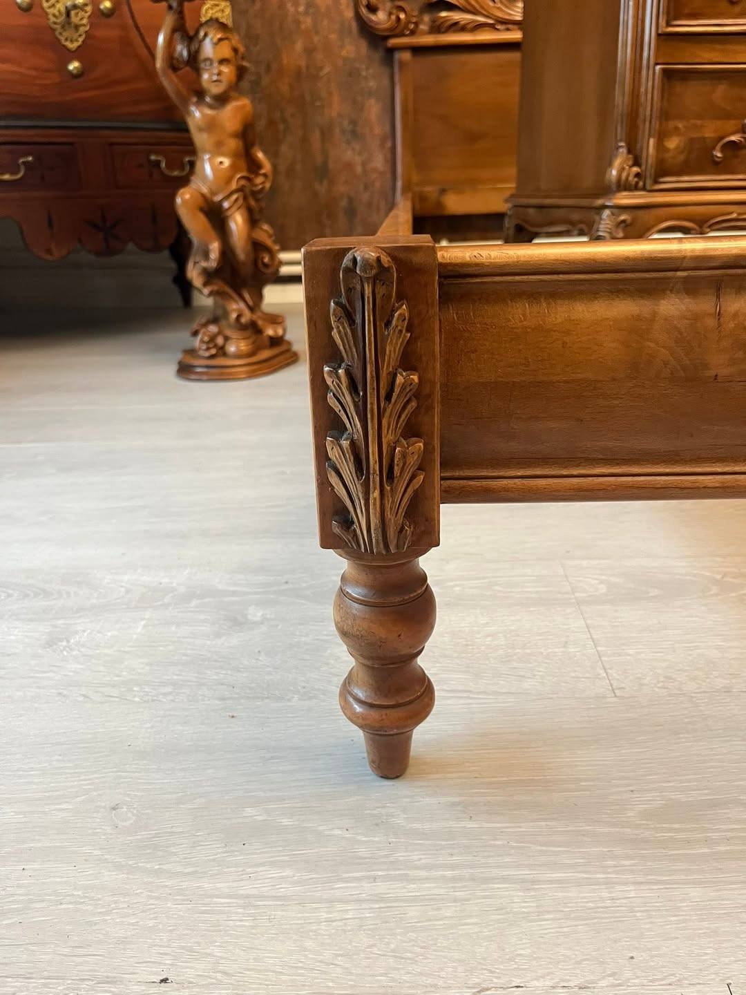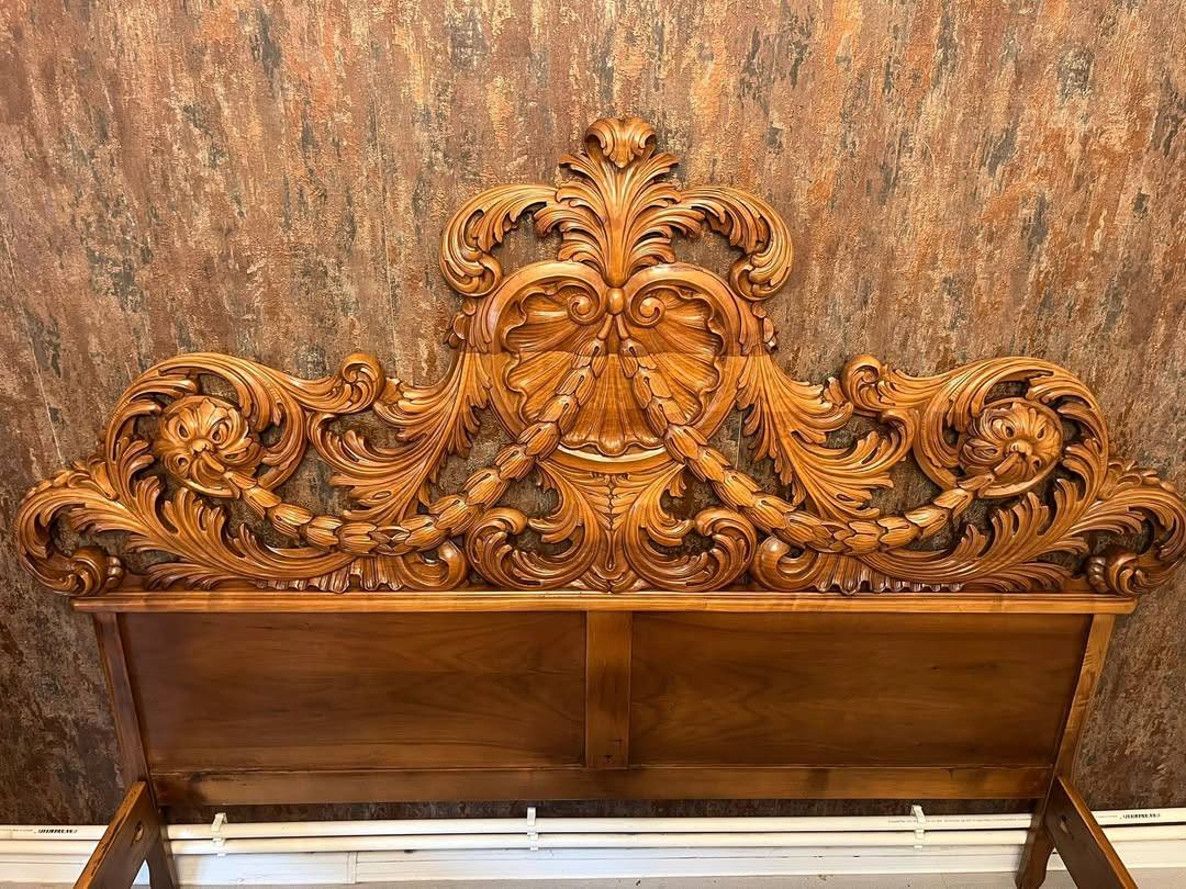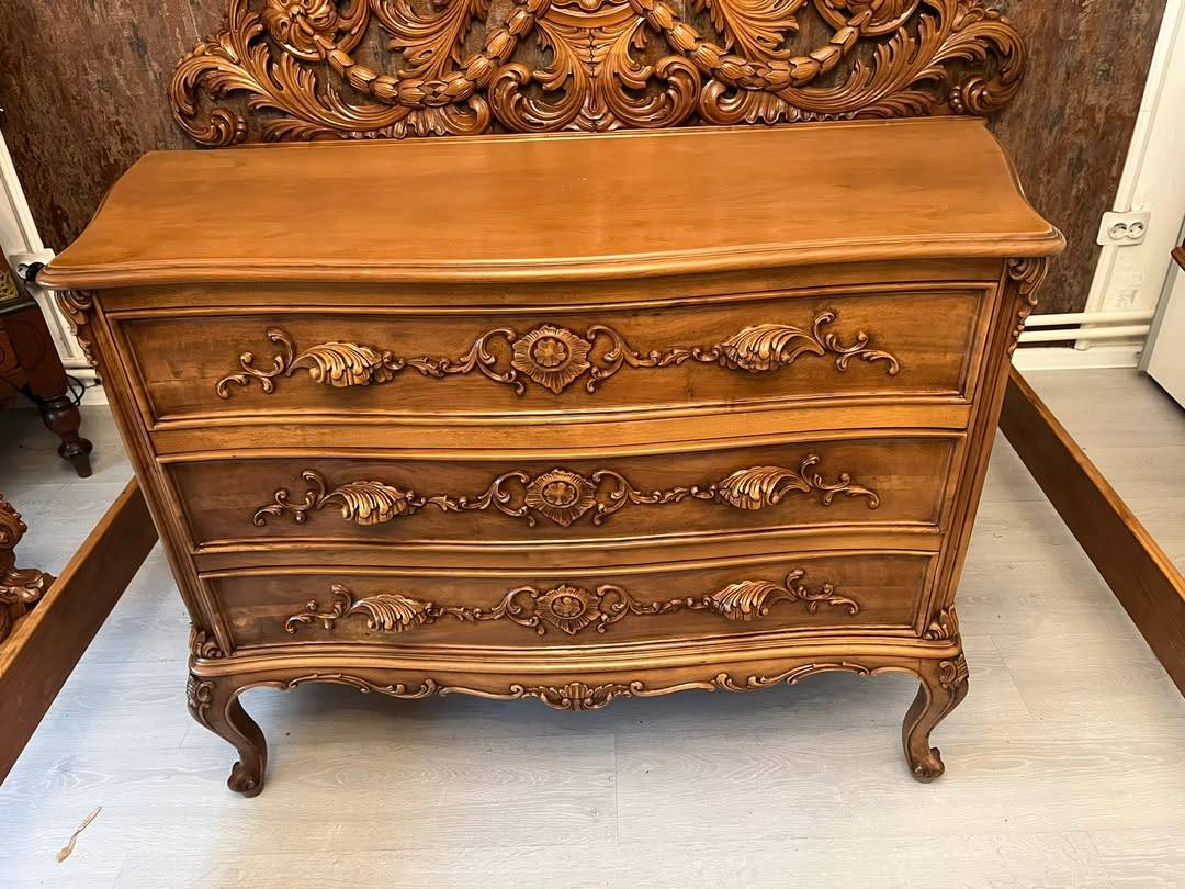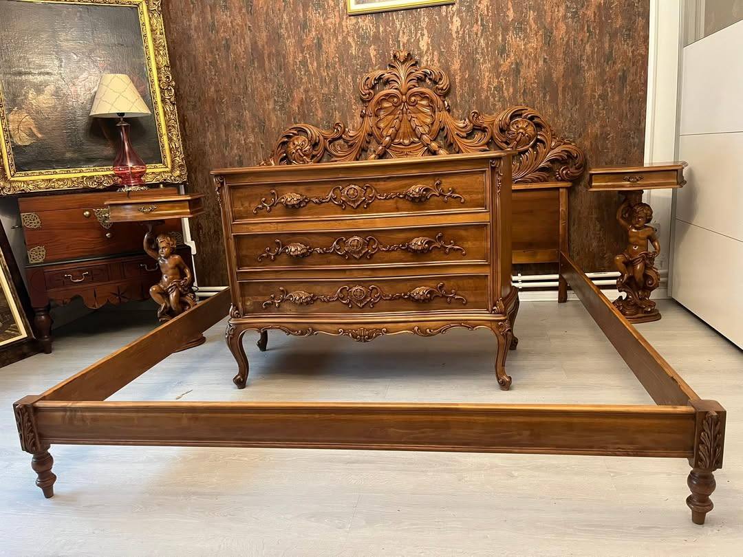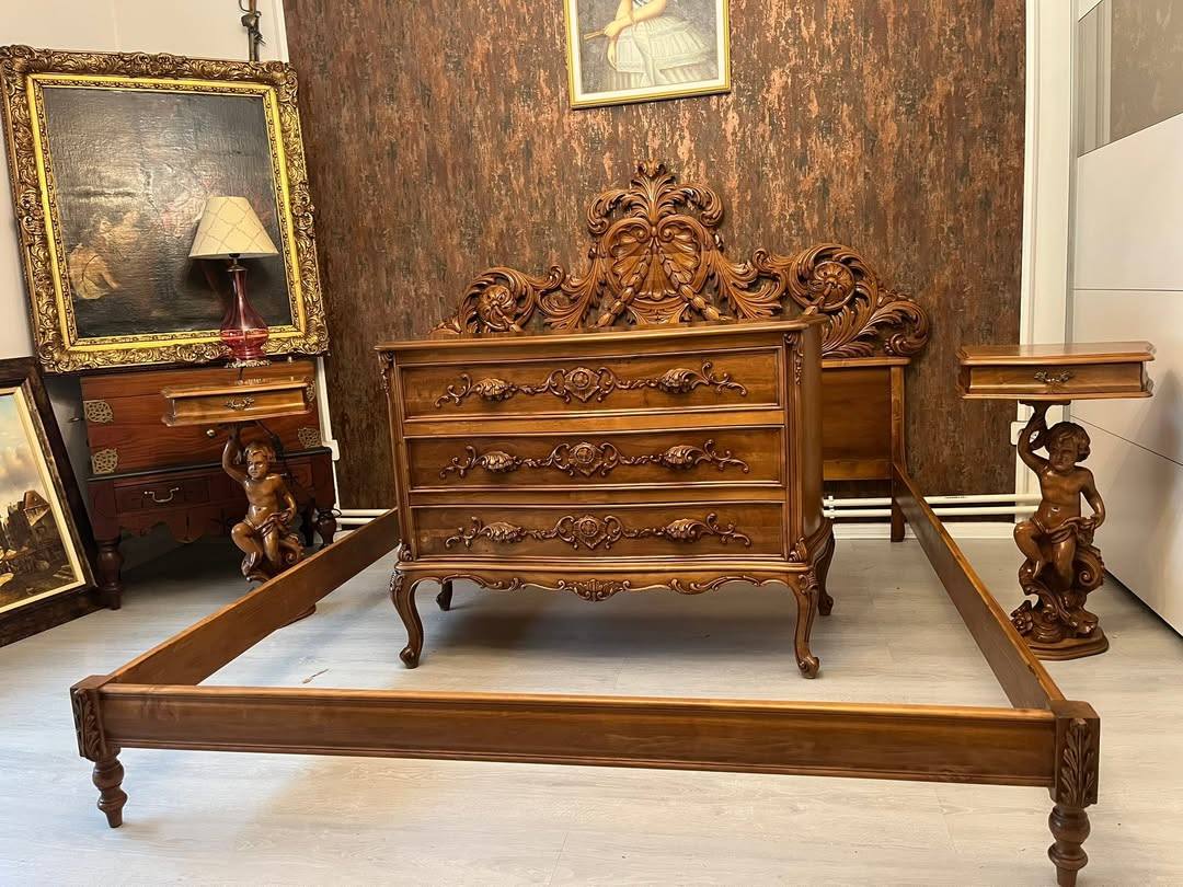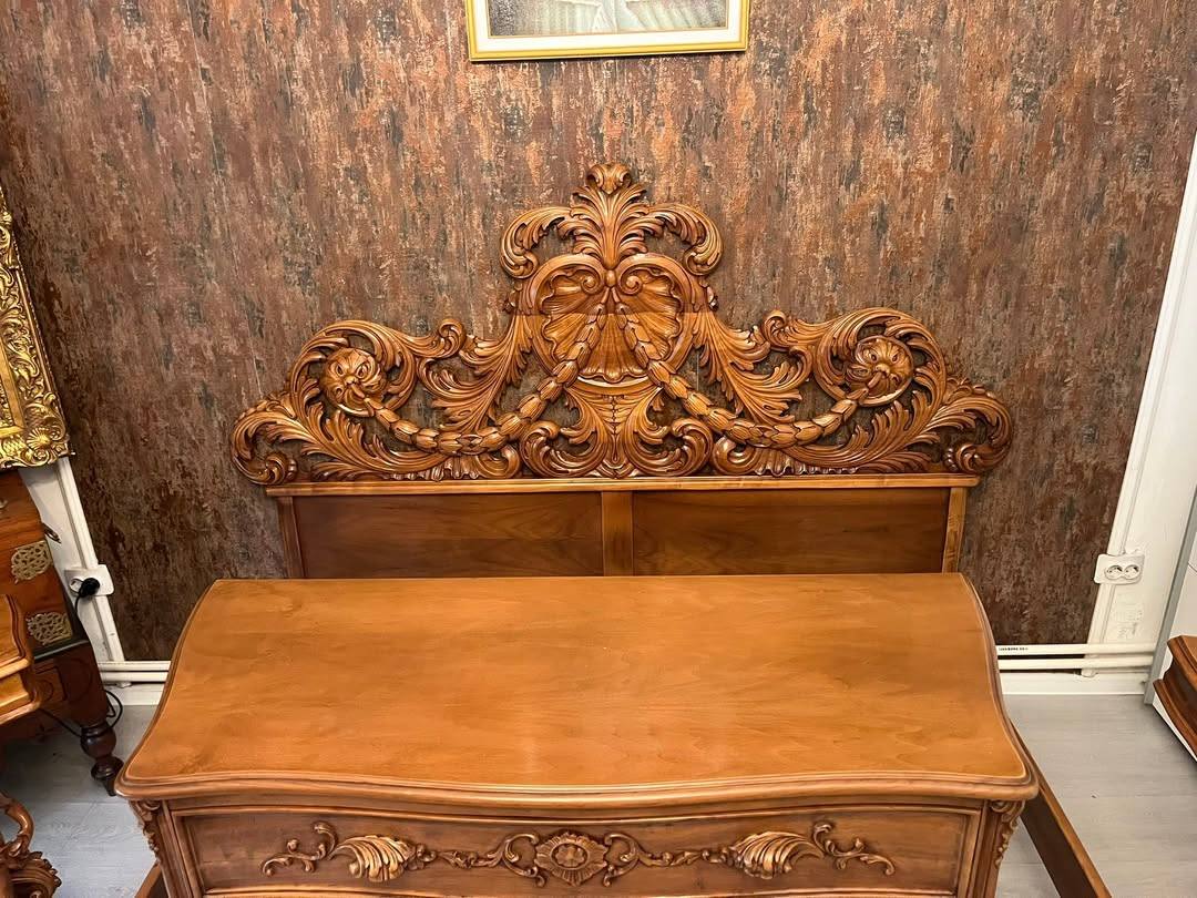 Set mobilier de dormitor deosebit, realizat din lemn masiv, cu sculpturi manuale de o calitate excepțională. Piesele impresionează prin detaliile bogate, stil