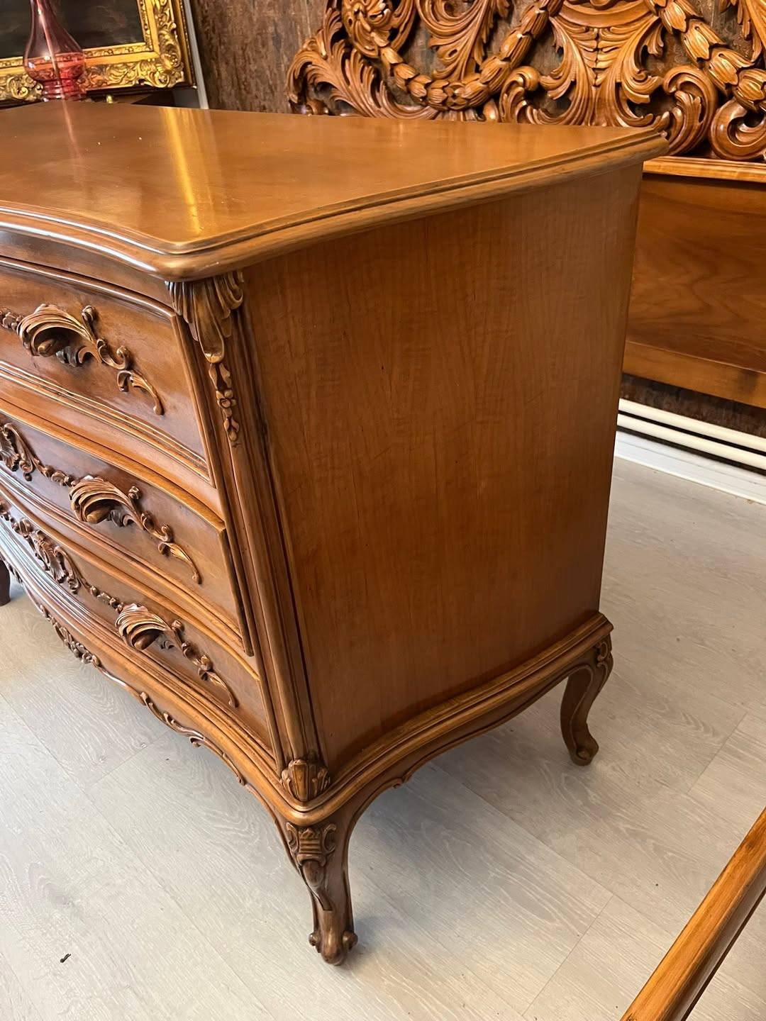 Comodă cu patru sertare, decorată frontal cu sculpturi florale și linii fluide, picioare cabriole elegante