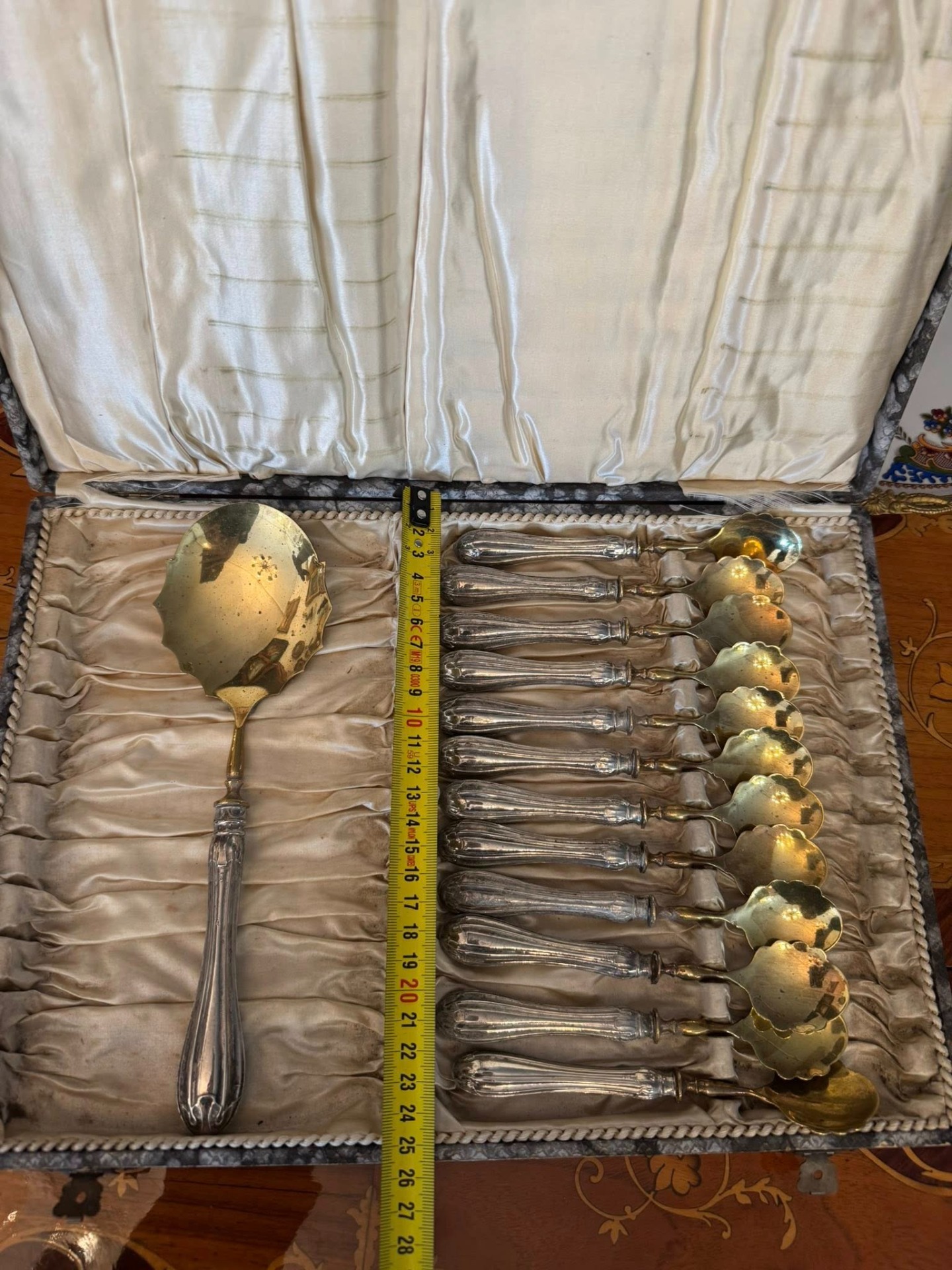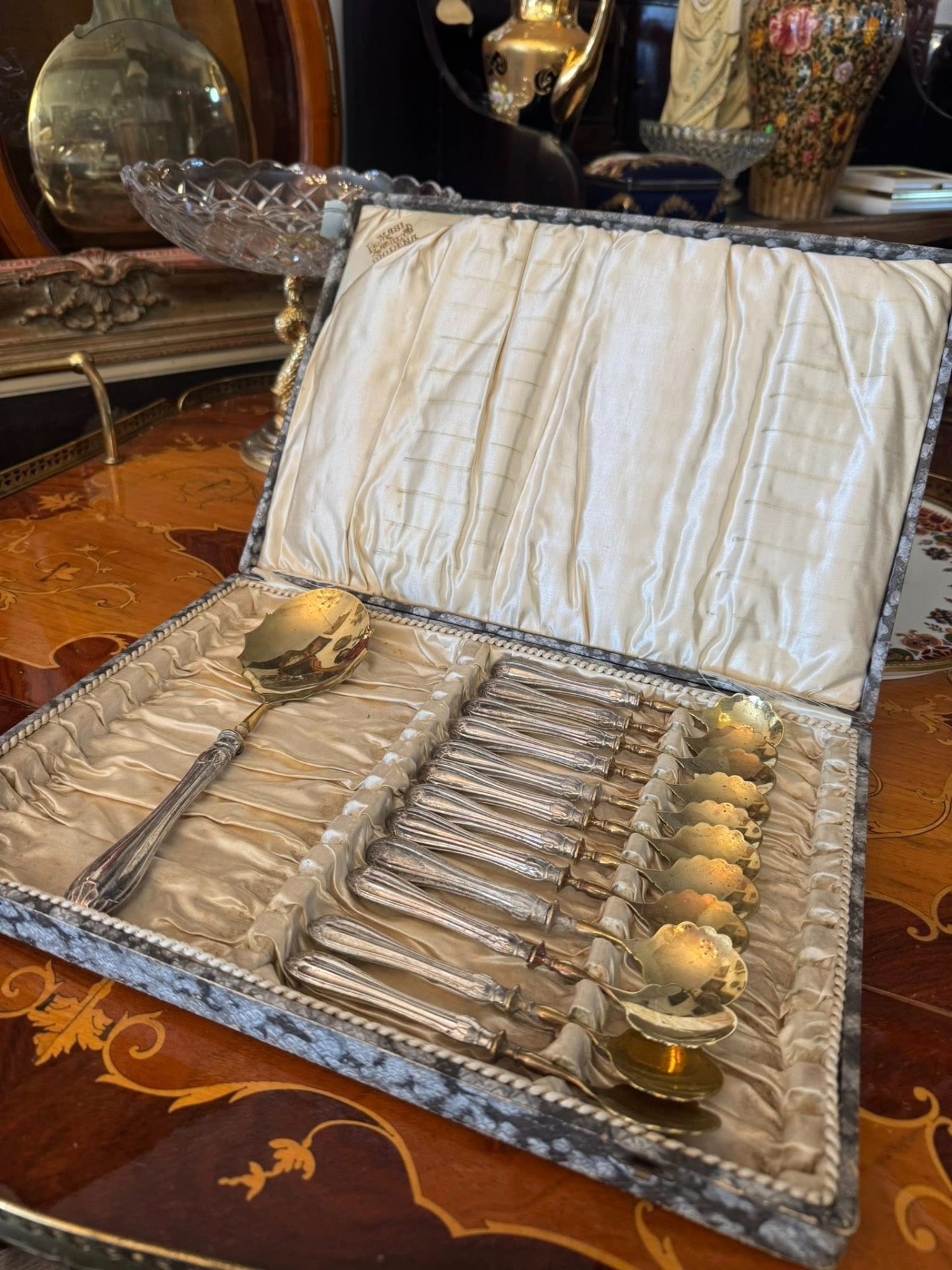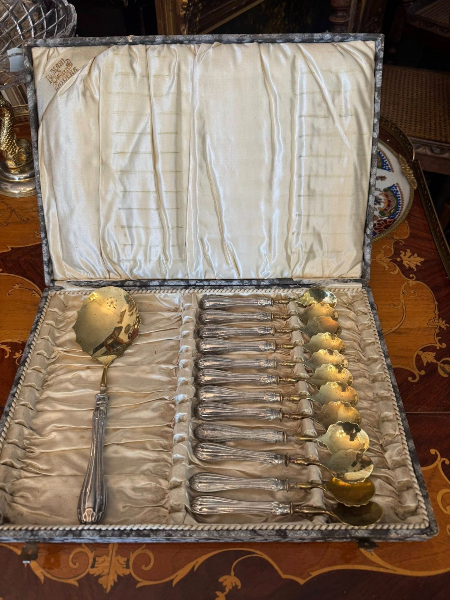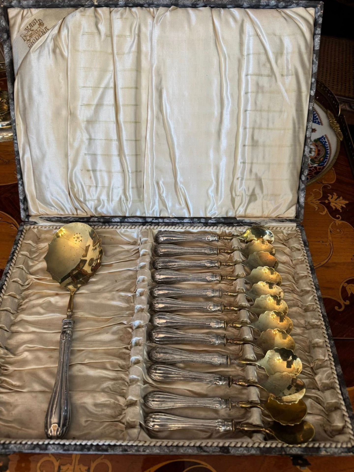 Set pentru desert cu mâner din argint, deosebit de elegant, compus dintr-o lingură mare pentru servit și 12 lingurițe, păstrat în cutia sa originală de prezentare. Setul provine de la P. Masi Gioielli din Modena, Italia. (cca 1940)