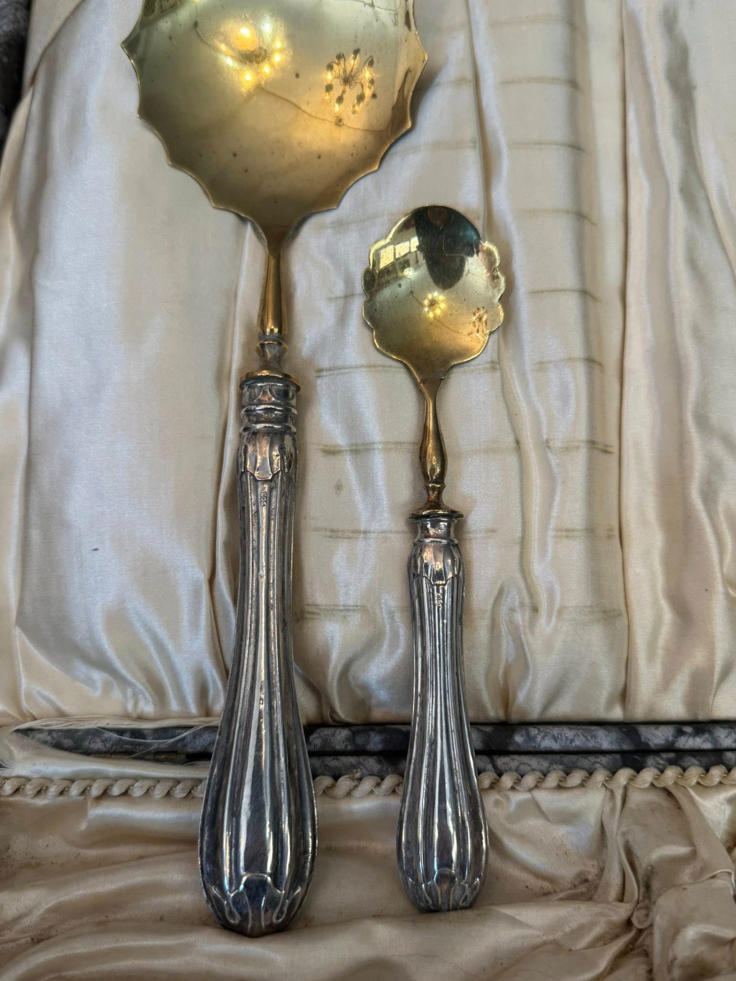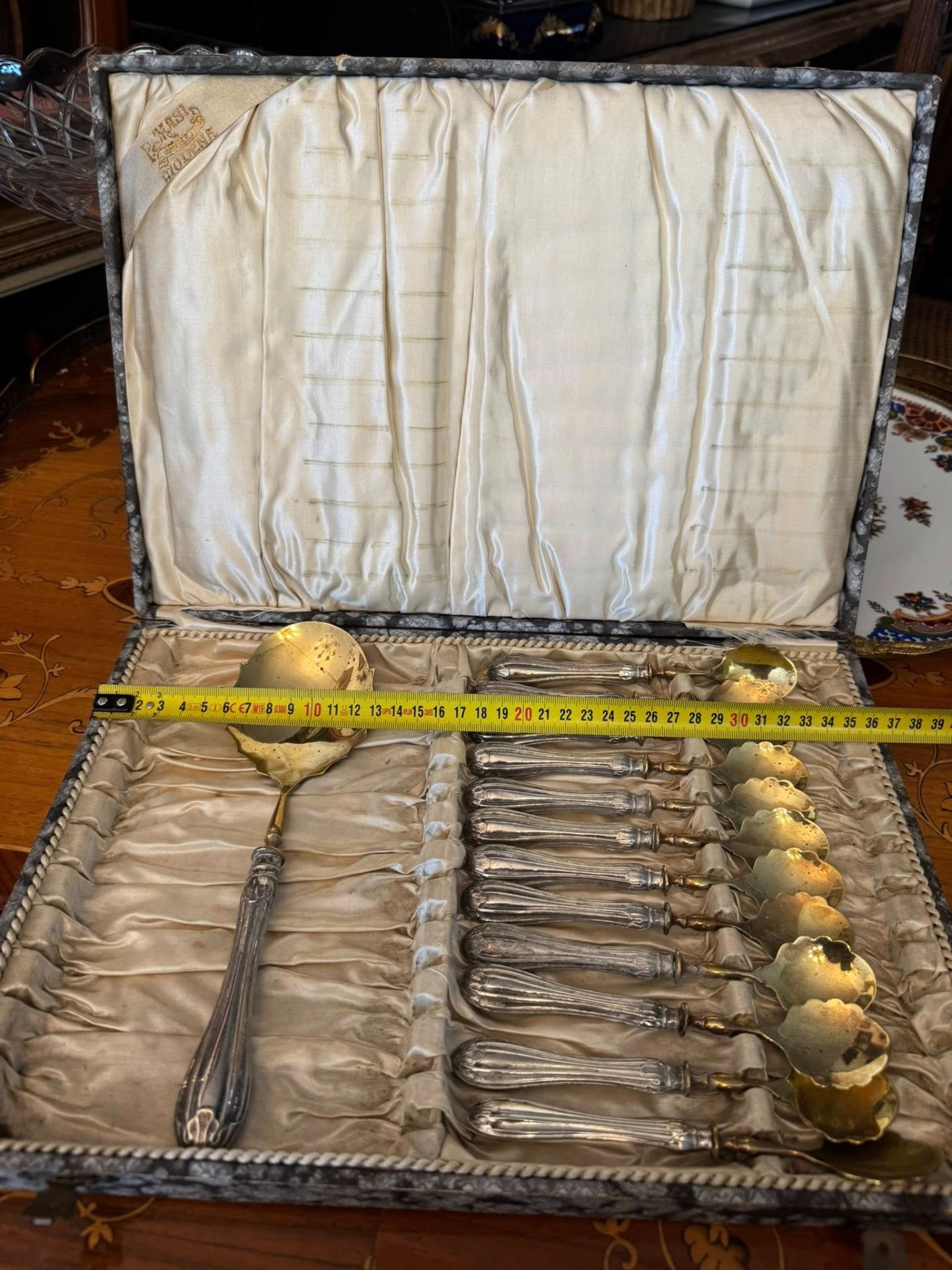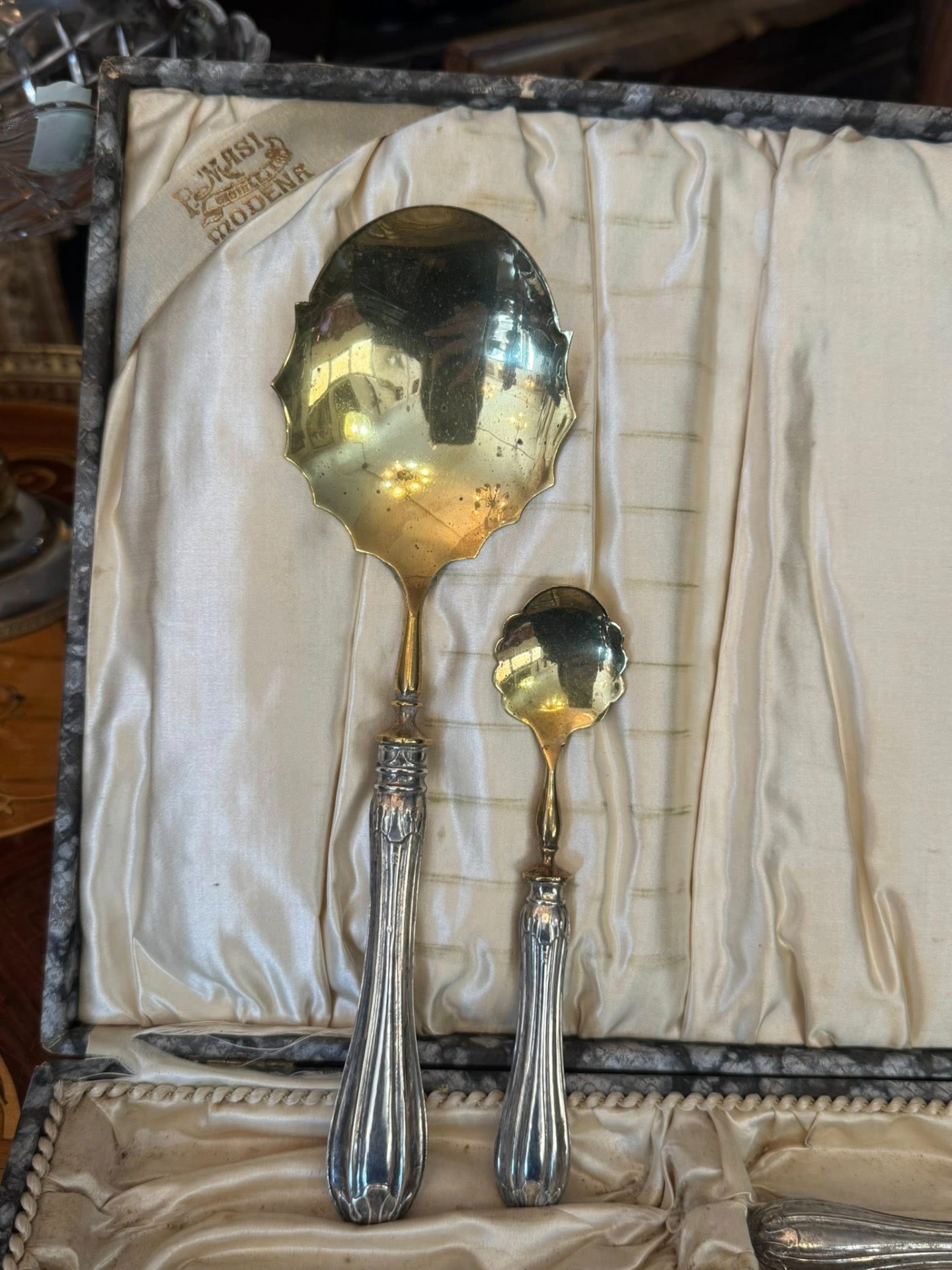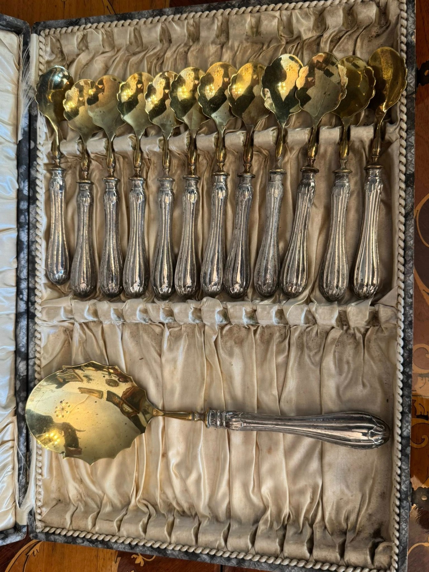 Set pentru desert cu mâner din argint, deosebit de elegant, compus dintr-o lingură mare pentru servit și 12 lingurițe, păstrat în cutia sa originală de prezentare. Setul provine de la P. Masi Gioielli din Modena, Italia. (cca 1940)